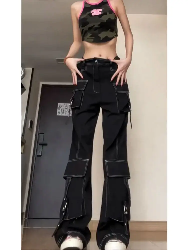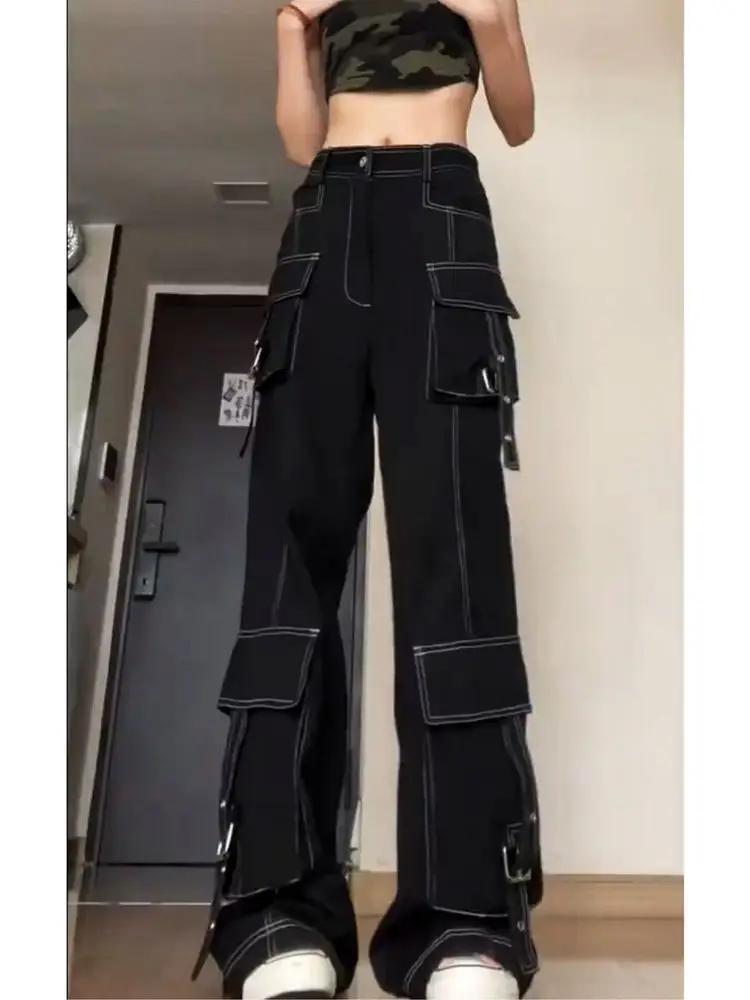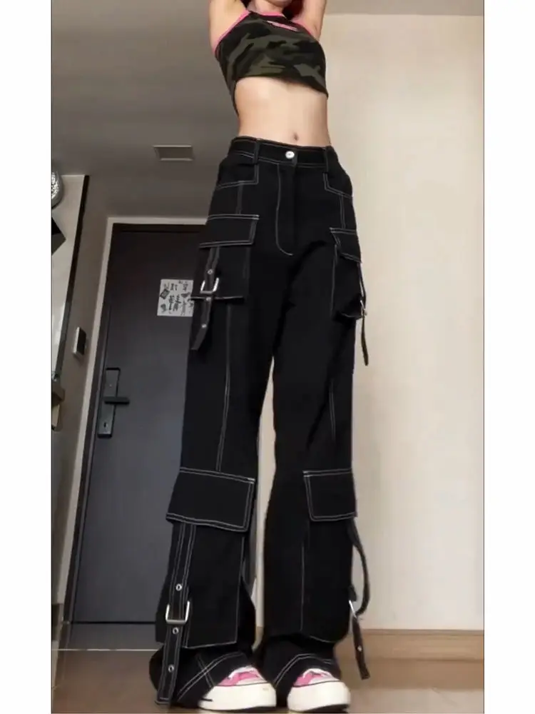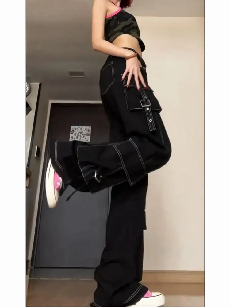 American retro work jeans female fall high street Loose thin casual wide leg dragging pants ins tide cargo pants women XL
