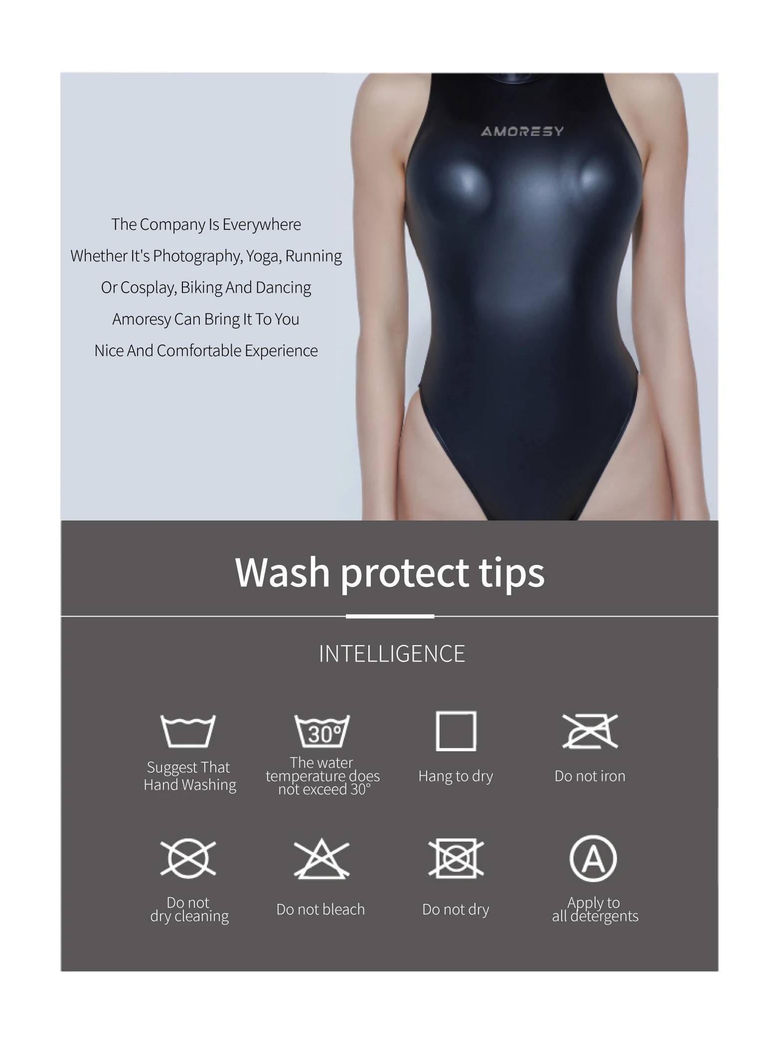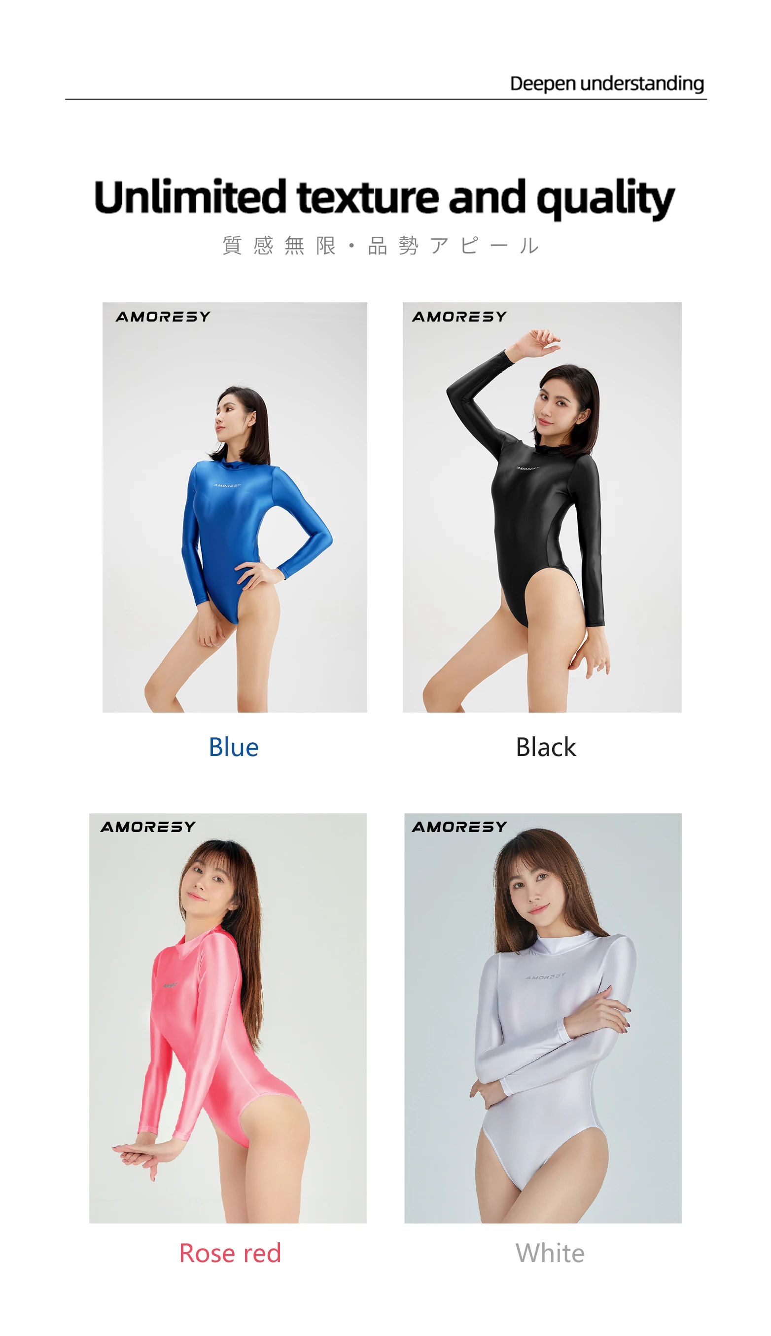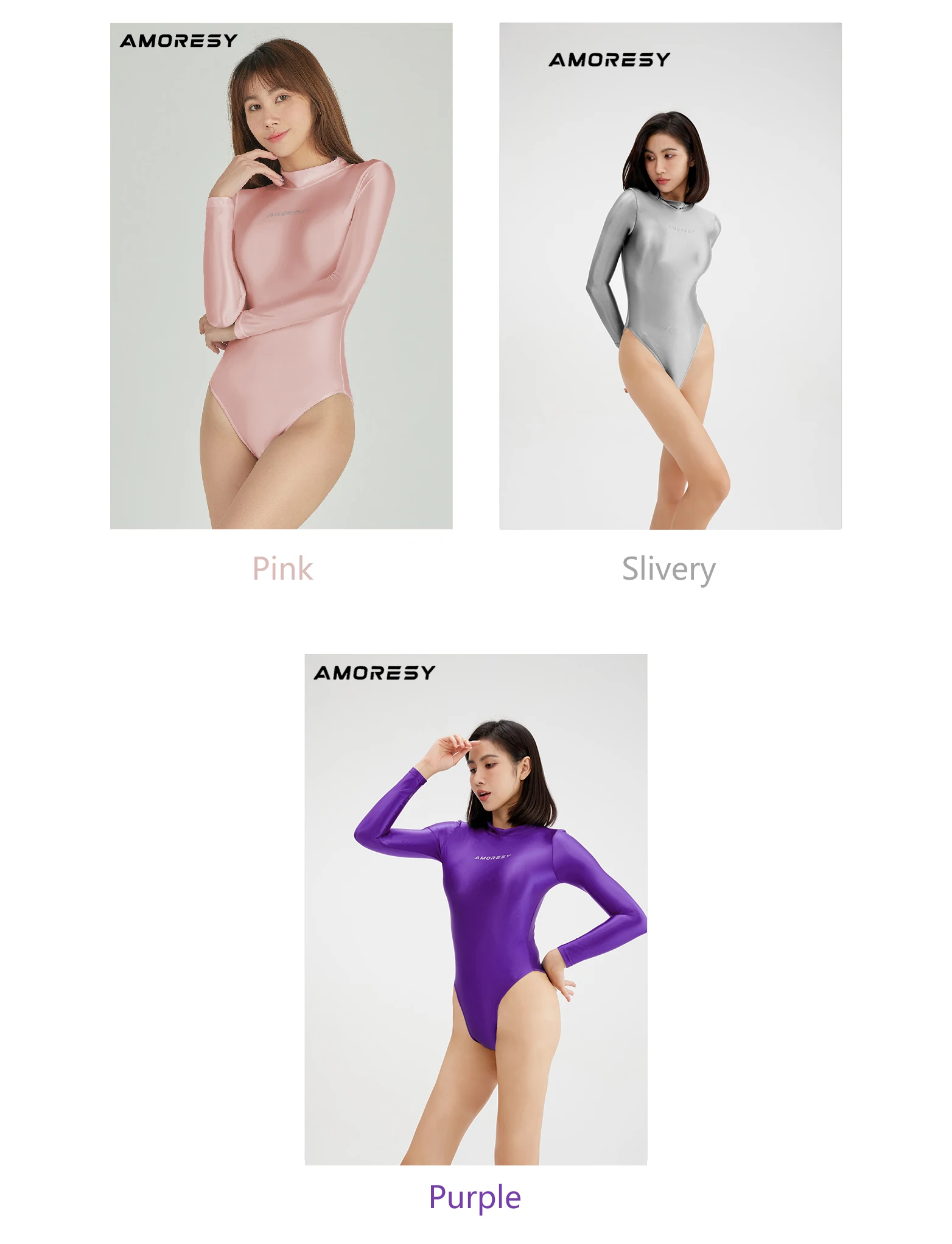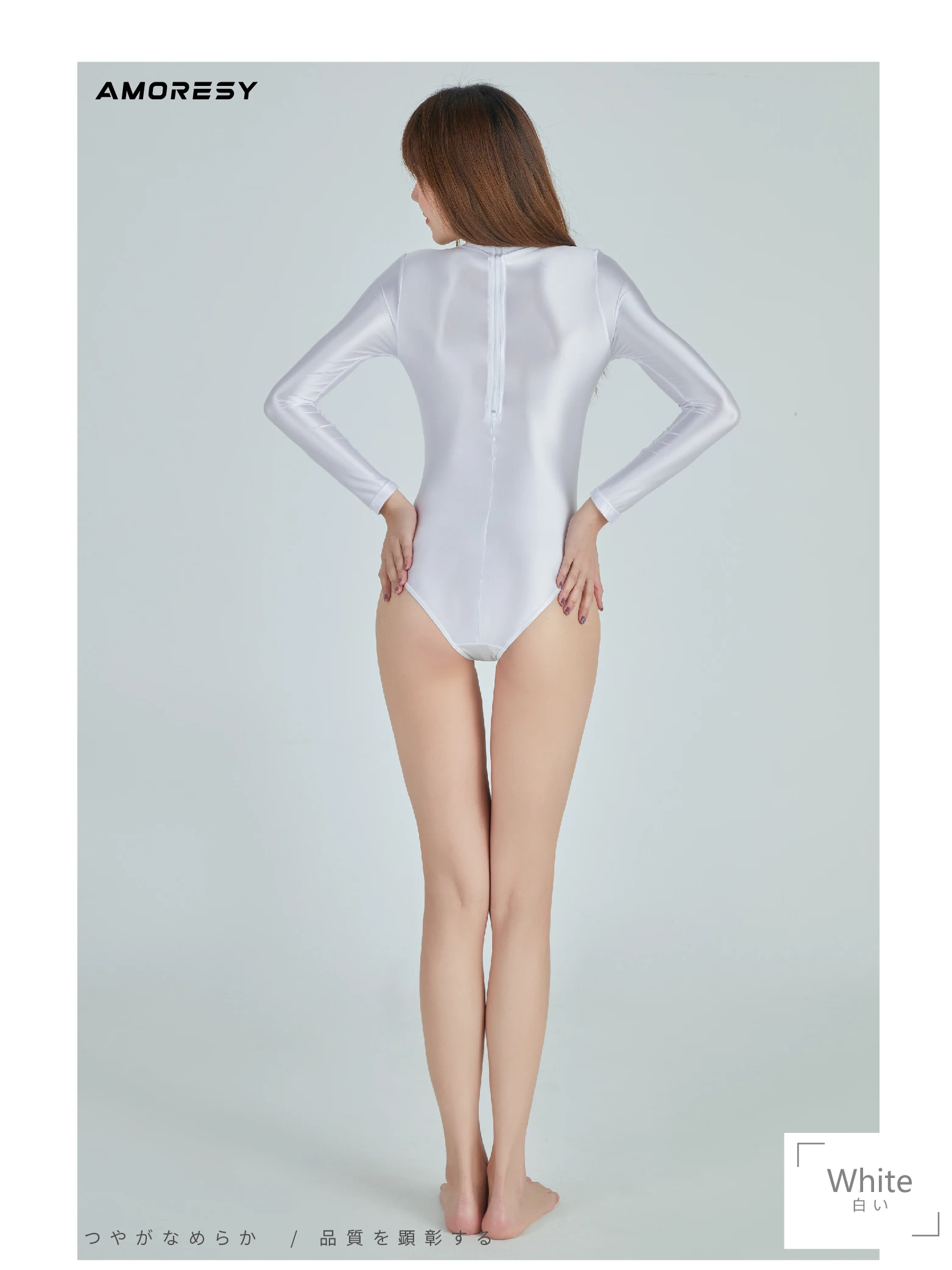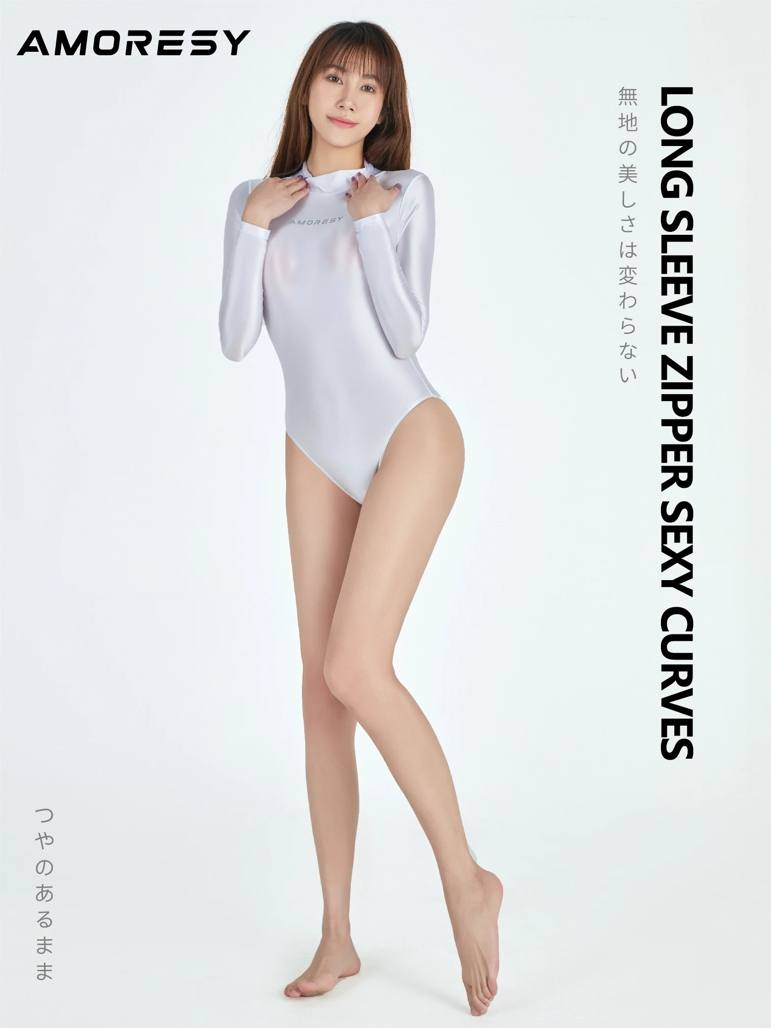 AMORESY Silky Sheen One-piece Bodice Crotch Long-sleeved Woman Solid Color Bottom Zipper Dead Body Swimsuit
