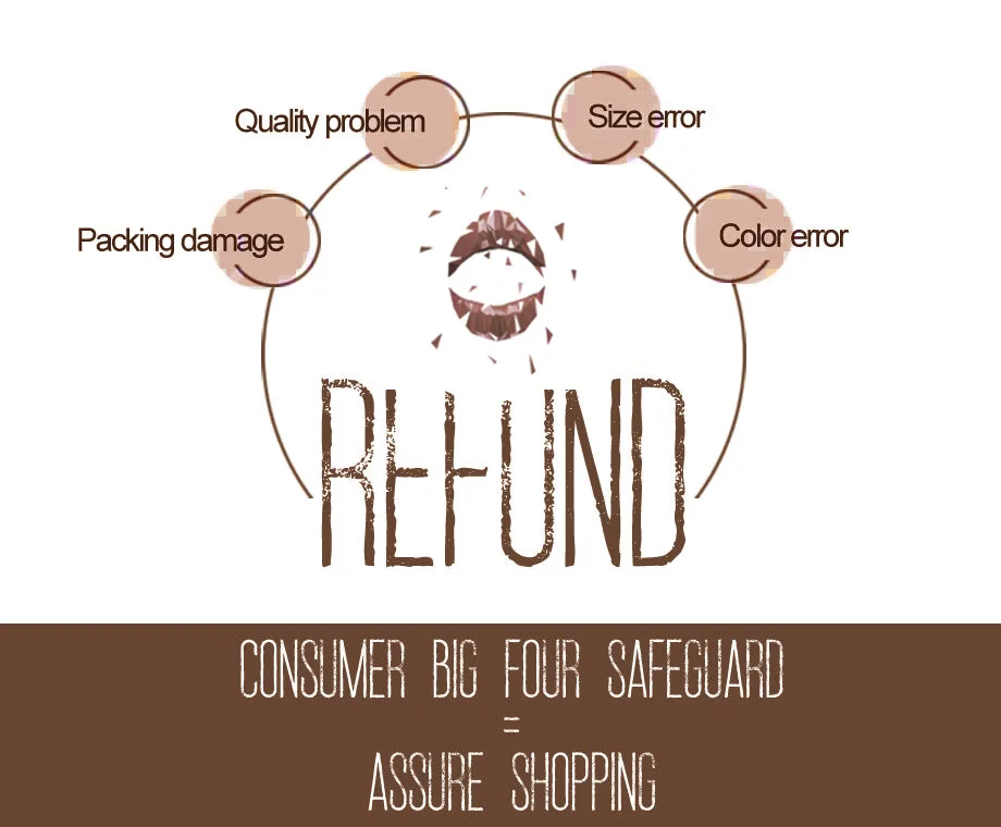 1. Consumer Big Four Safeguard=Assure Shopping.If there are any < Packing Damage>< Size Error> etc, please contact us for refund or replacement, as long as you are satisfied, nothing is a problem.