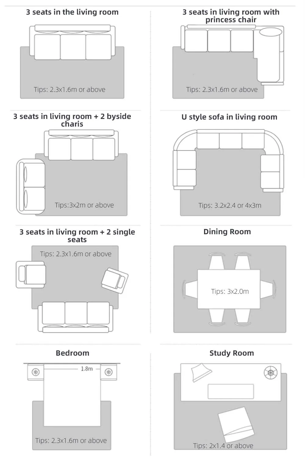 Tips: the carpet has the function of extending the space visually. lt is generally recommended to select the size