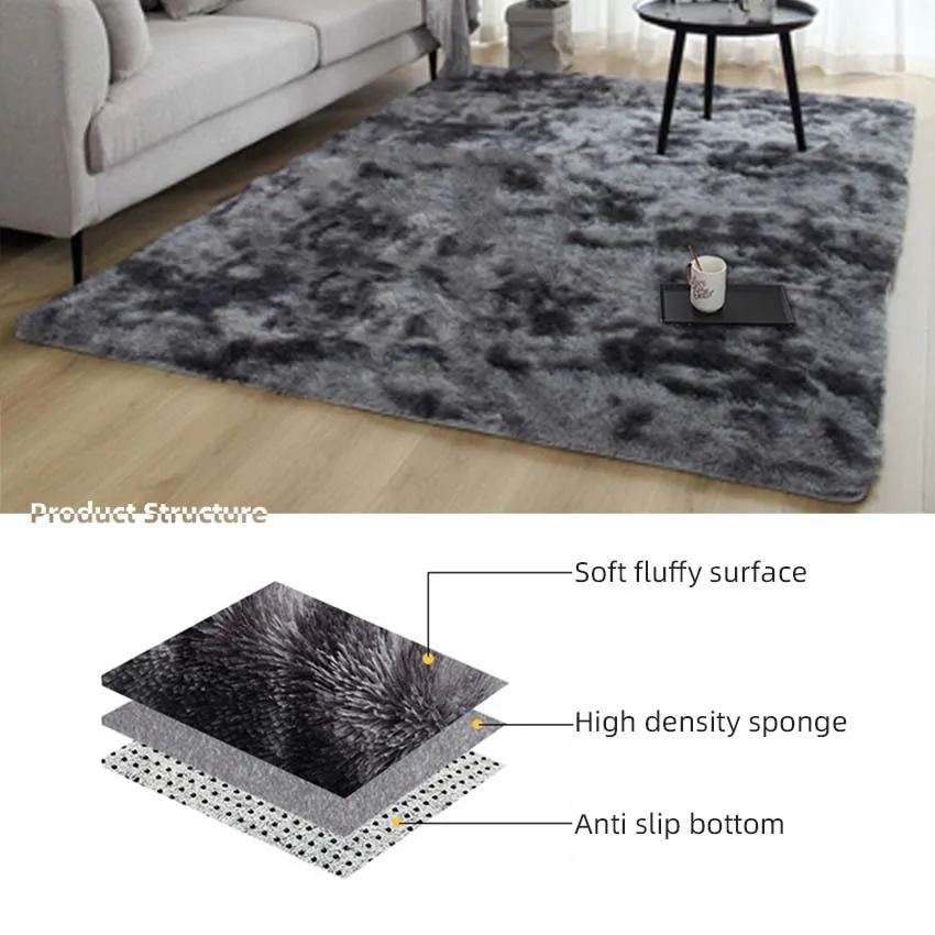 The home carpet is consisted with soft fluffy hair for the first layer, second is the high density sponge, bottom apply the non-woven fabric with PVC dots in case of slipping.