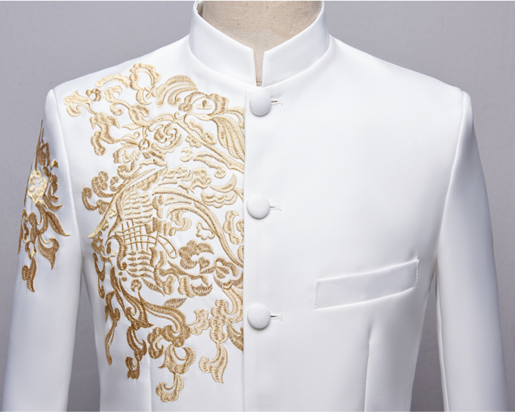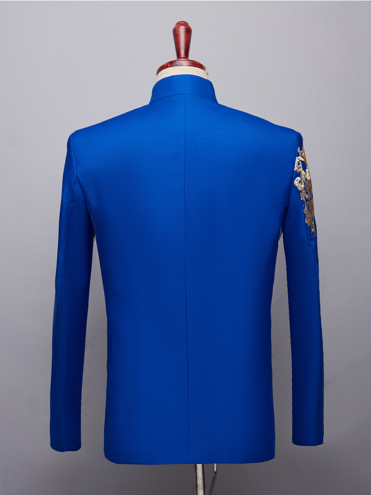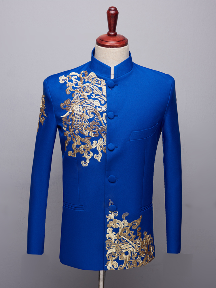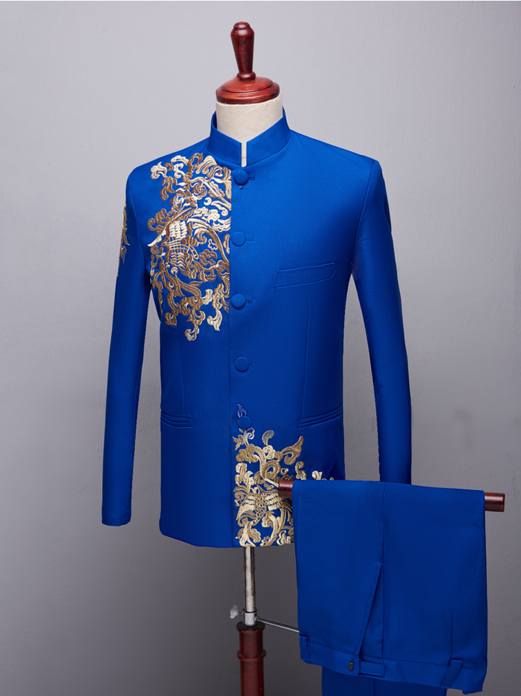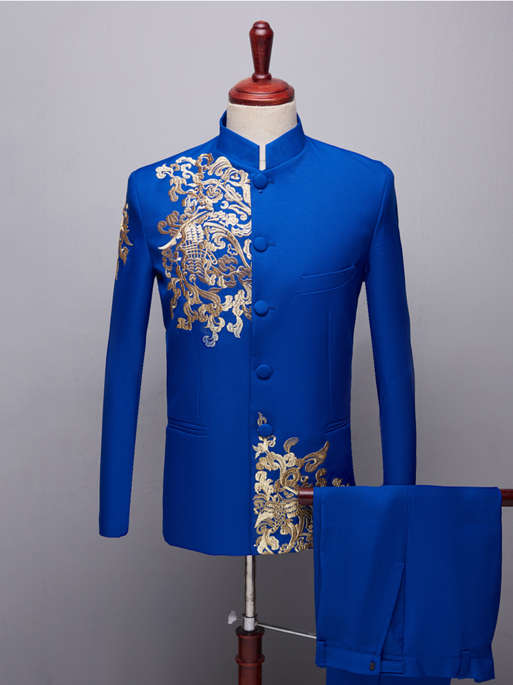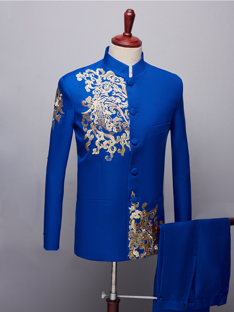 Blazer Men Chinese Tunic Suit Set With Pants Wedding Singer Star Style Dance Stage Cloth Style Formal Dress Stand Collar Blue