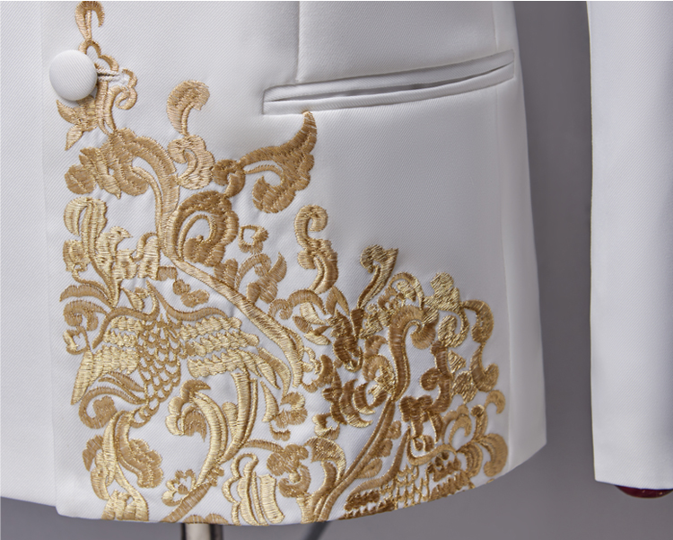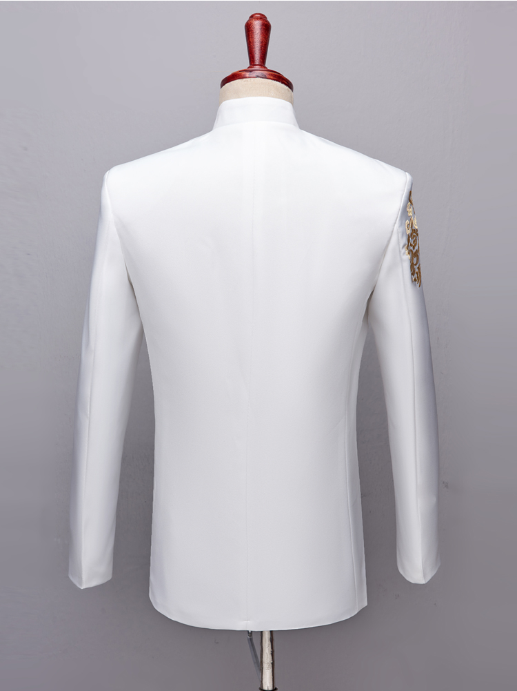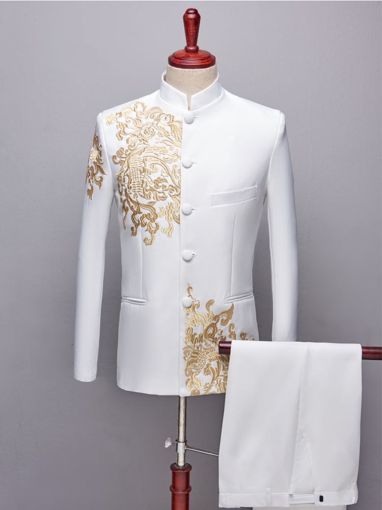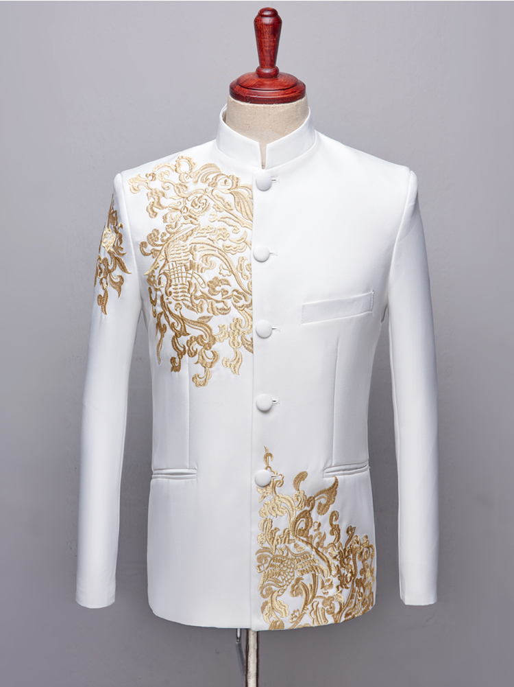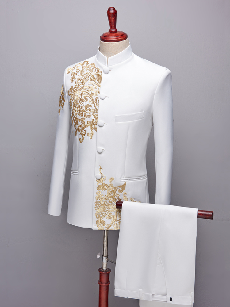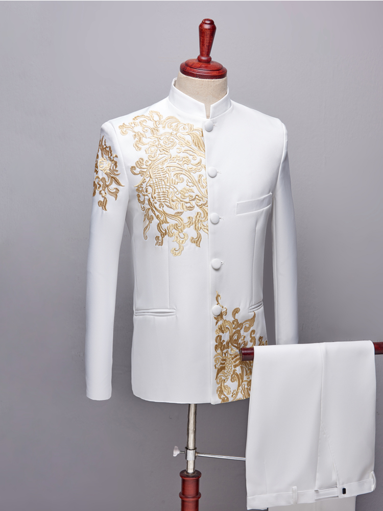 Blazer Men Chinese Tunic Suit Set With Pants Wedding Singer Star Style Dance Stage Cloth Style Formal Dress Stand Collar Blue