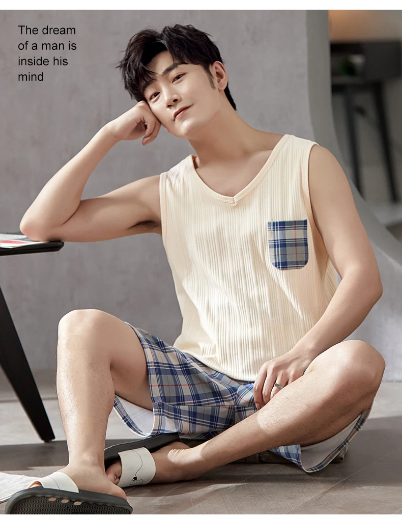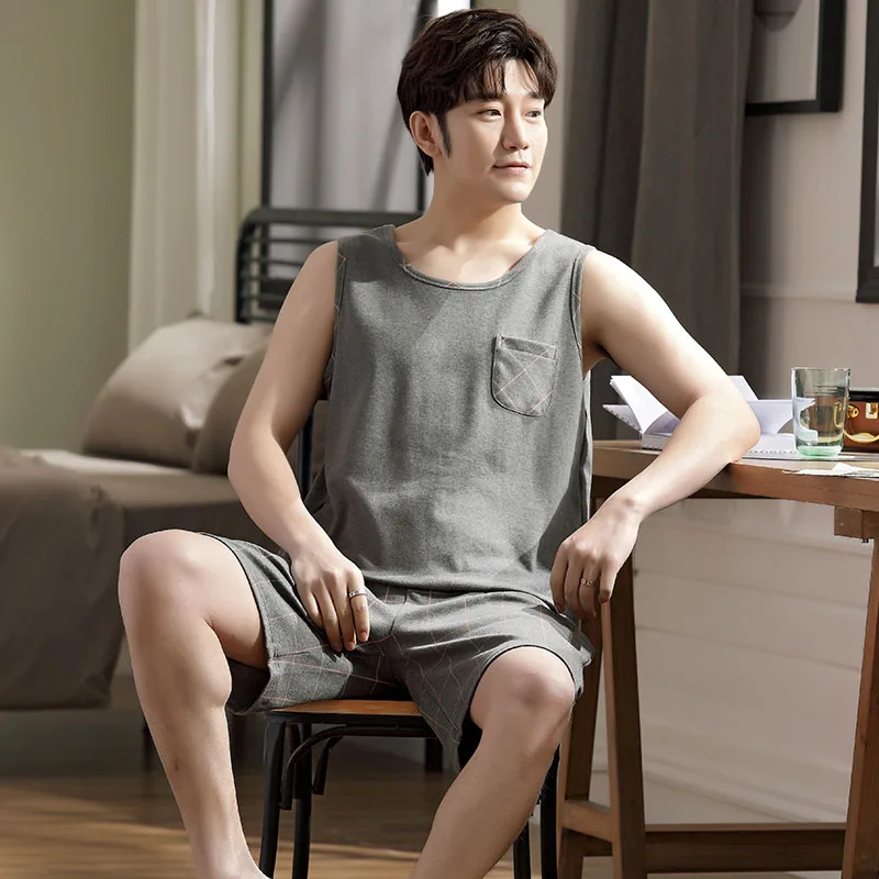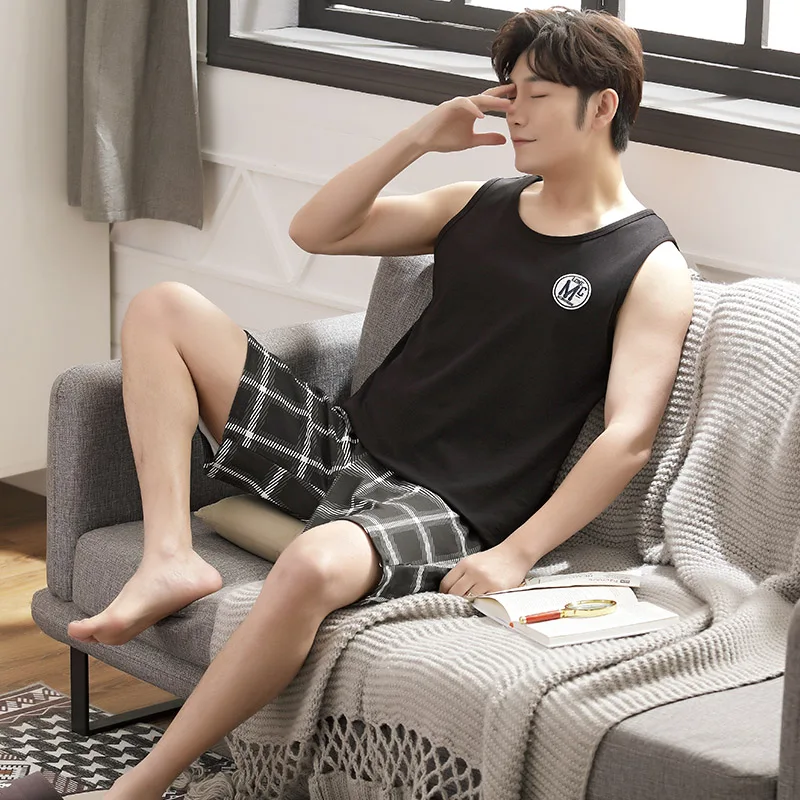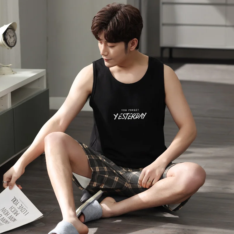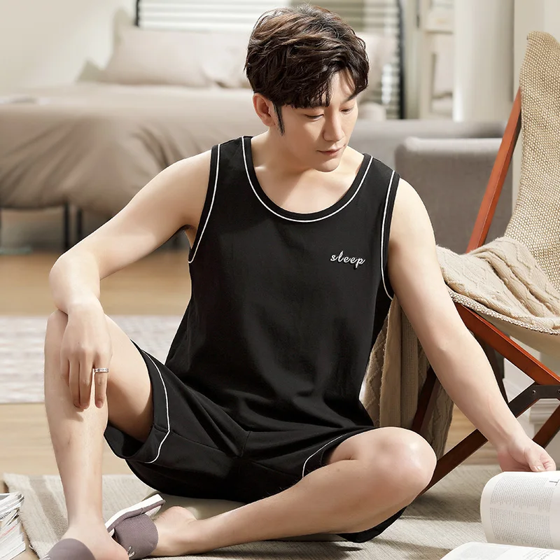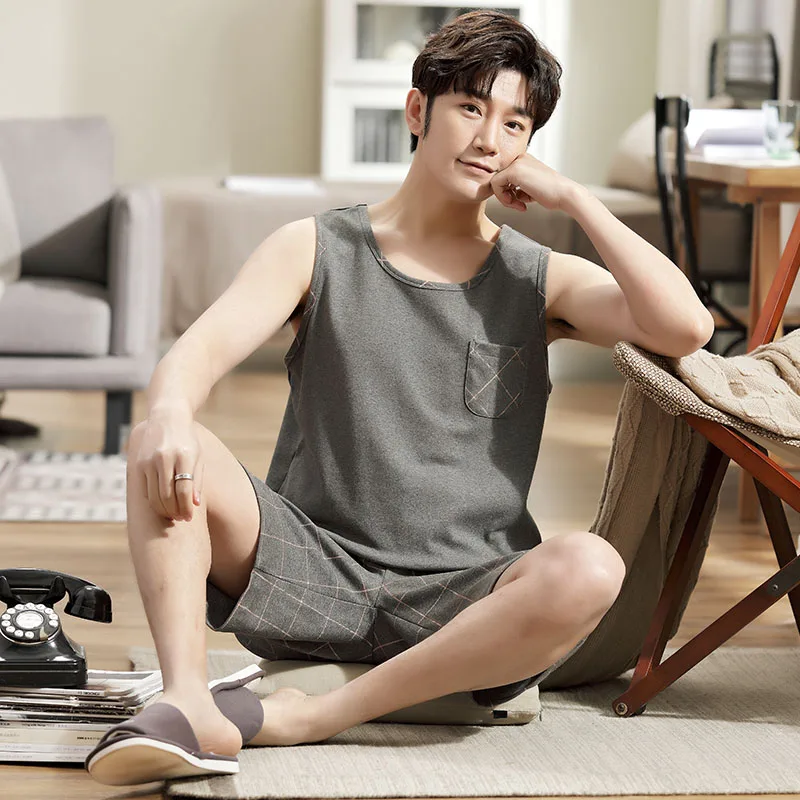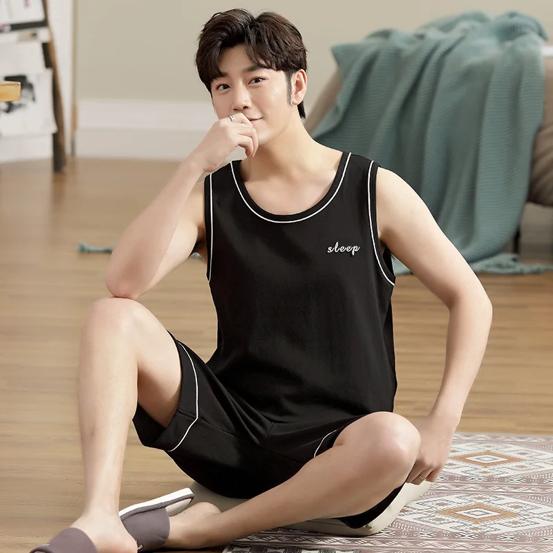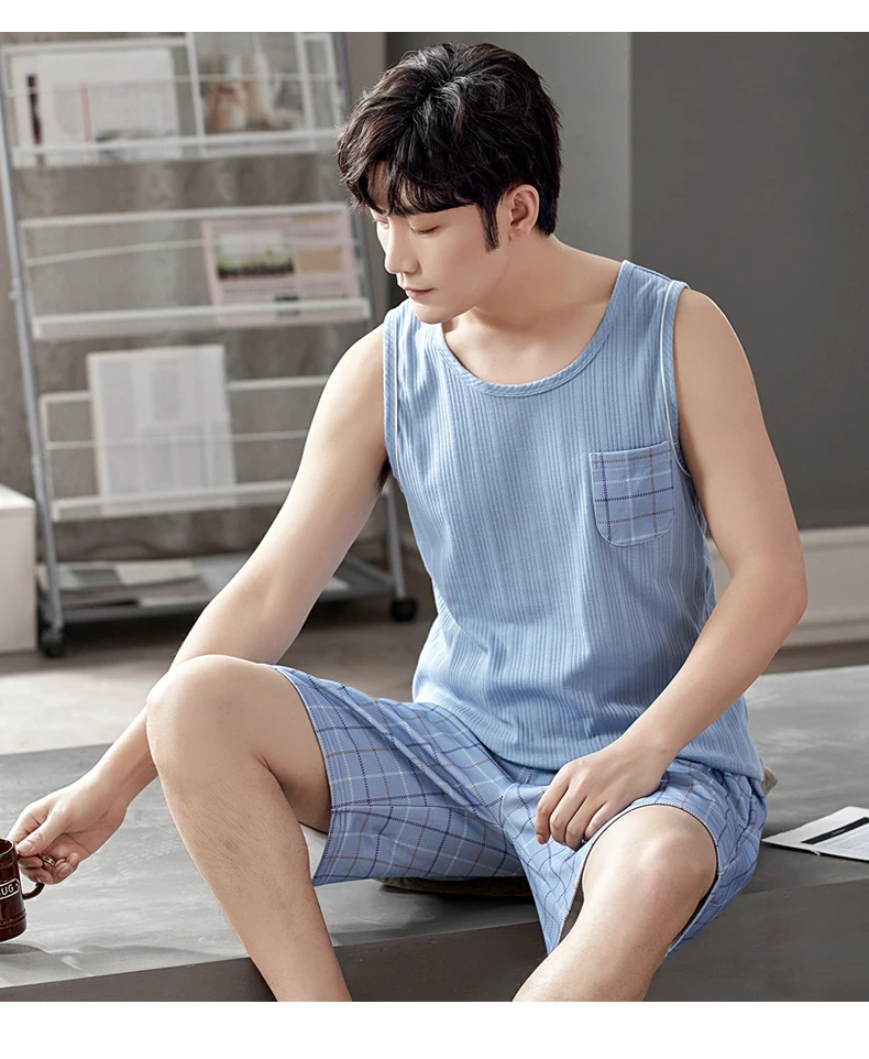 Boy Male Vest Pants Pajamas Sleeveless Vest Pant Pyjamas Undershirt Sleepwear Nightwear Elastic Waist Man's Jams 6535 Cotton HDE