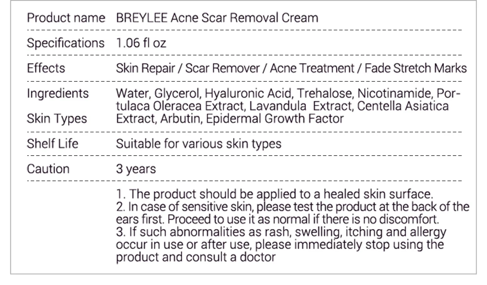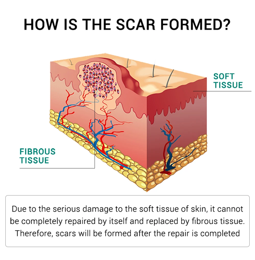 3. If such abnormalities as rash, swelling, itching and allergy occur in use or after use, please immediately stop using the product and consult a doctor. Due to the serious damage to the soft tissue of skin, it cannot be completely repaired by itself and replaced by fibrous tissue. Therefore, scars will be formed after the repair is completed.Visibly reduces appearance of scars