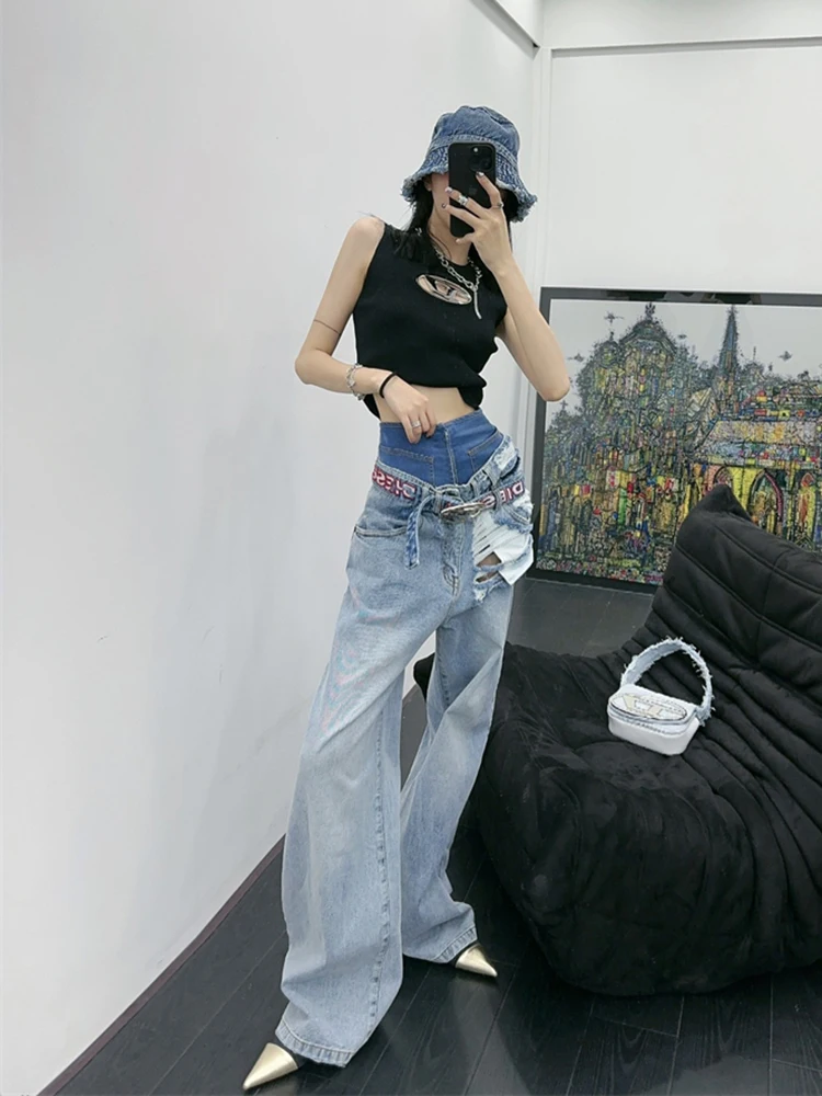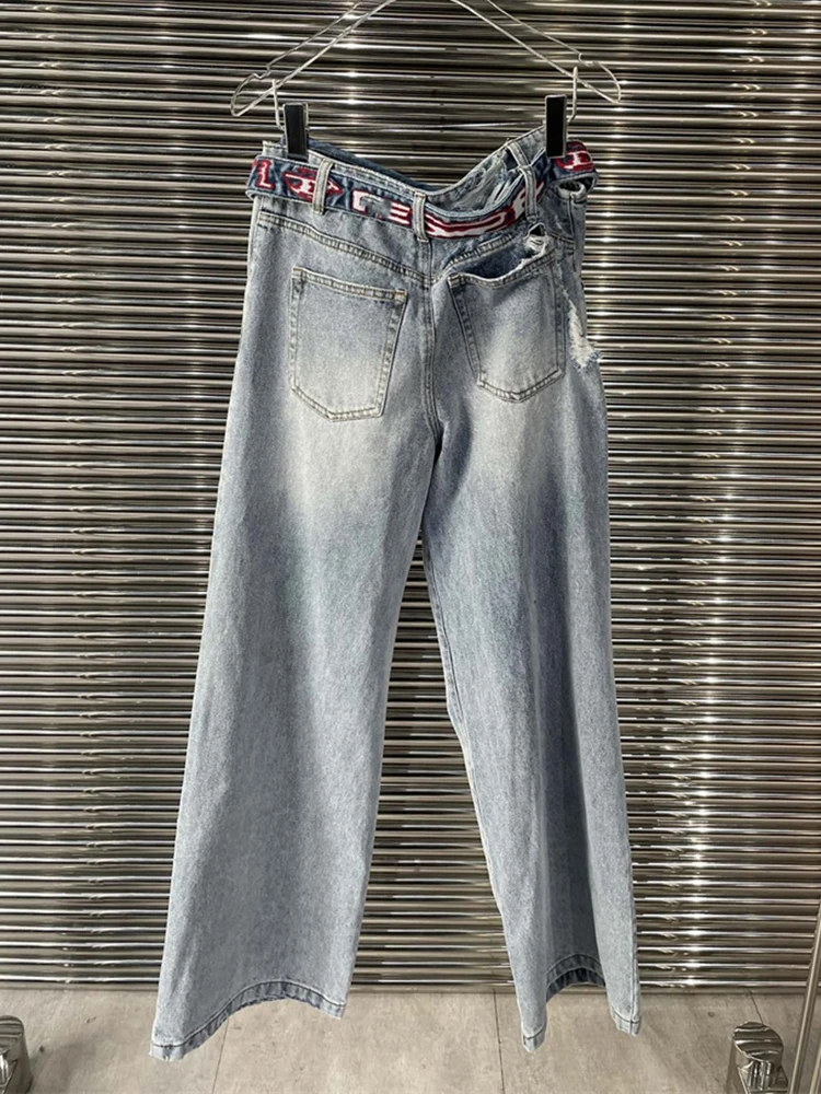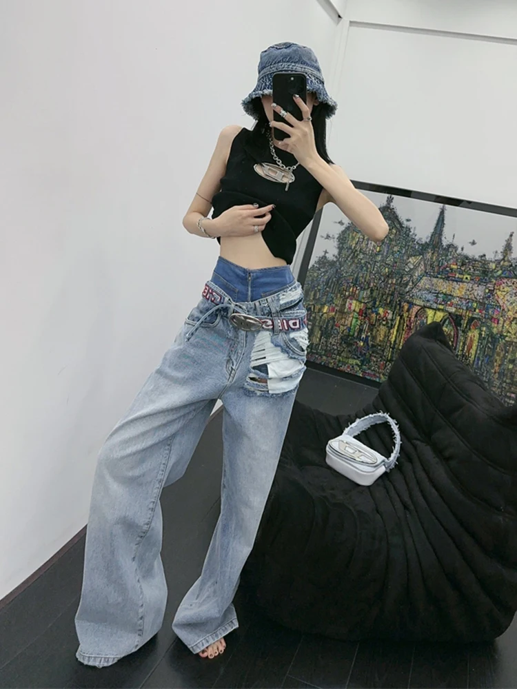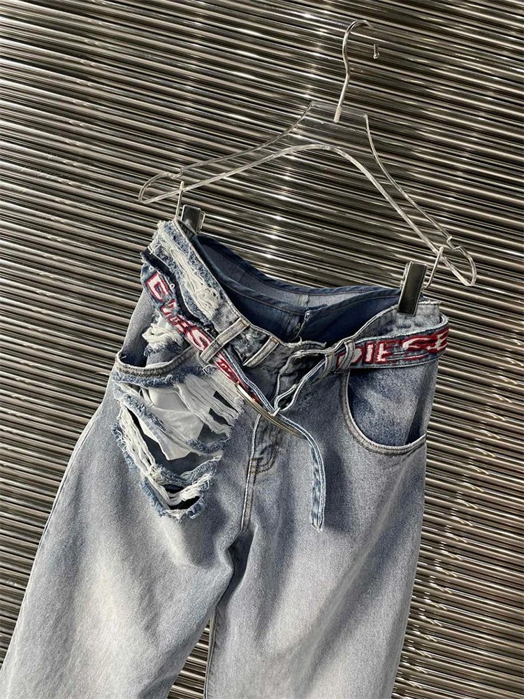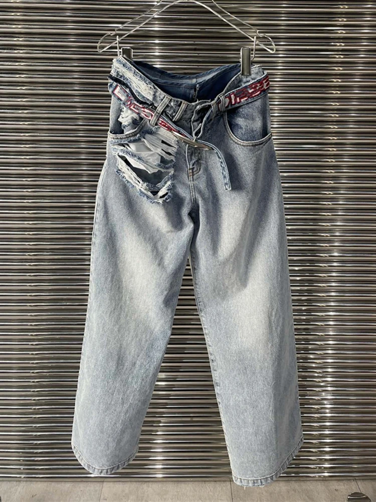 CHICEVER Hole Hollow Out Denim Pant For Women High Waist Patchwork Belt Loose Streetwear Wide Leg Pants Female Spring Clothing