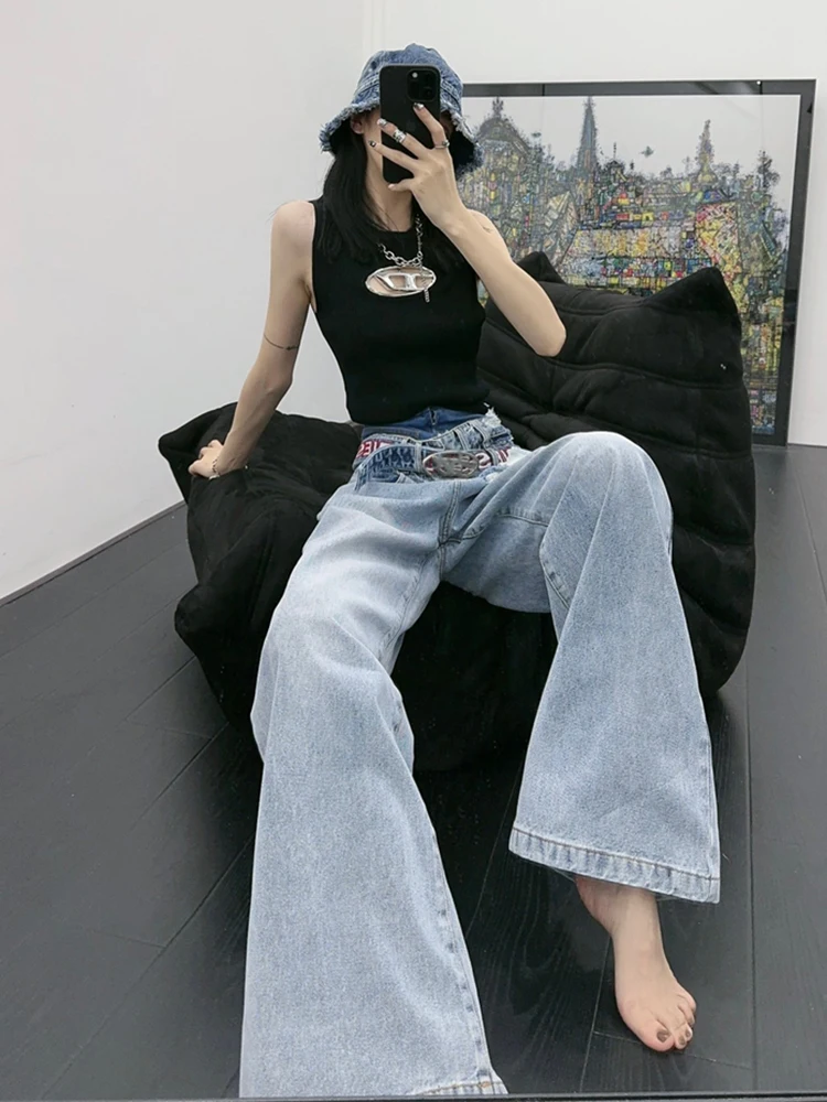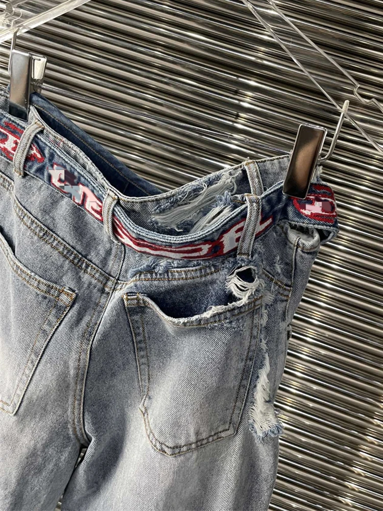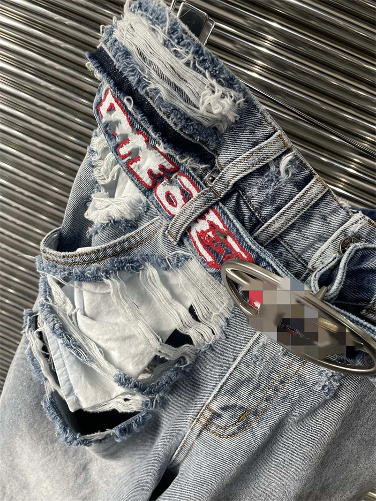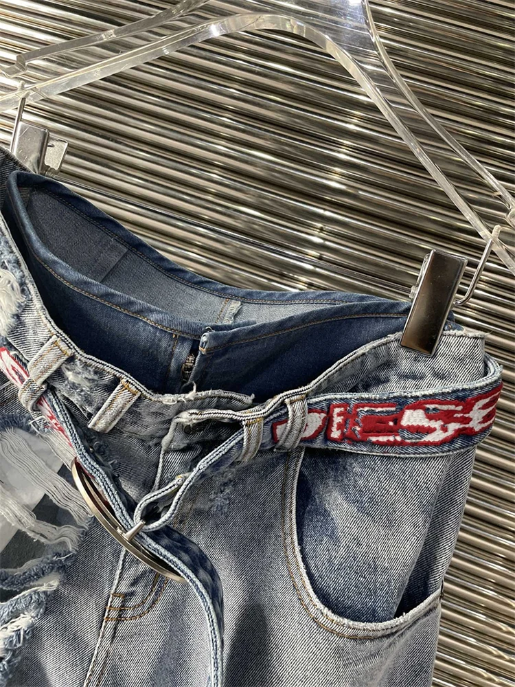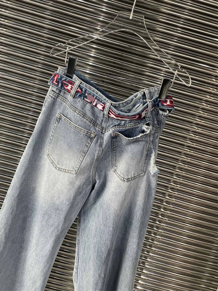 CHICEVER Hole Hollow Out Denim Pant For Women High Waist Patchwork Belt Loose Streetwear Wide Leg Pants Female Spring Clothing