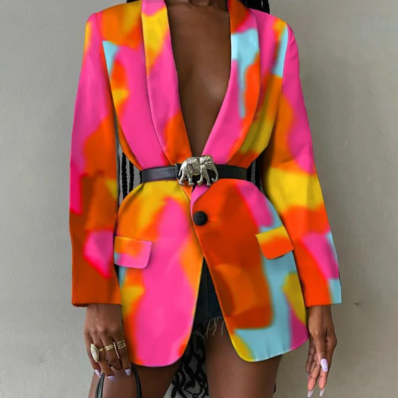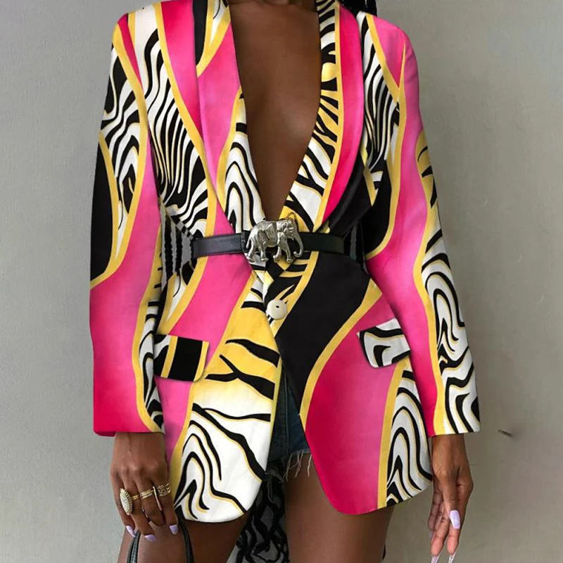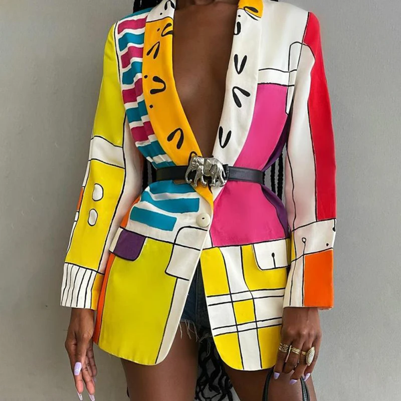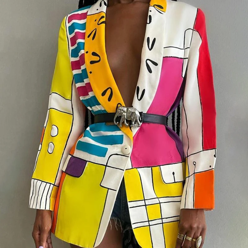 CHICEVER Sexy Print Colorblock Blazers For Women Notched Collar Long Sleeve Straight Jackets Female Autumn Clothing 2021 Fashion