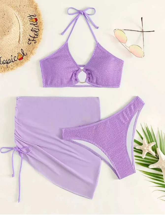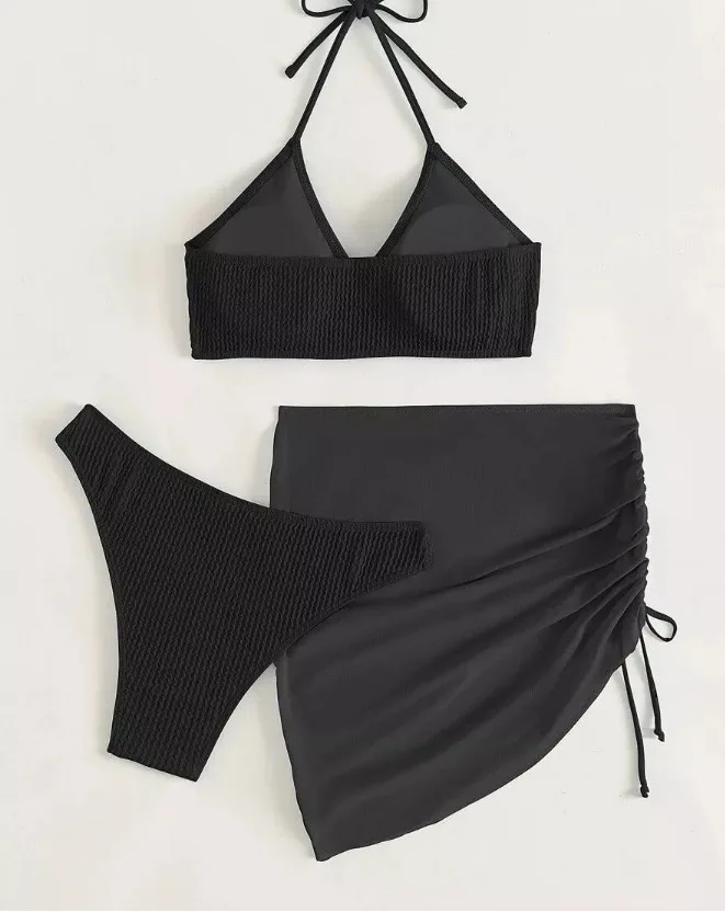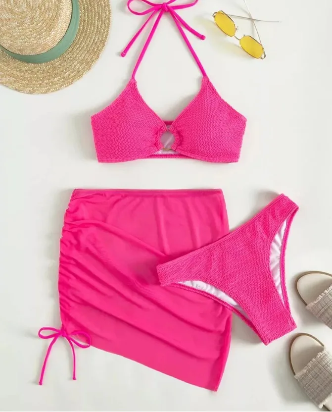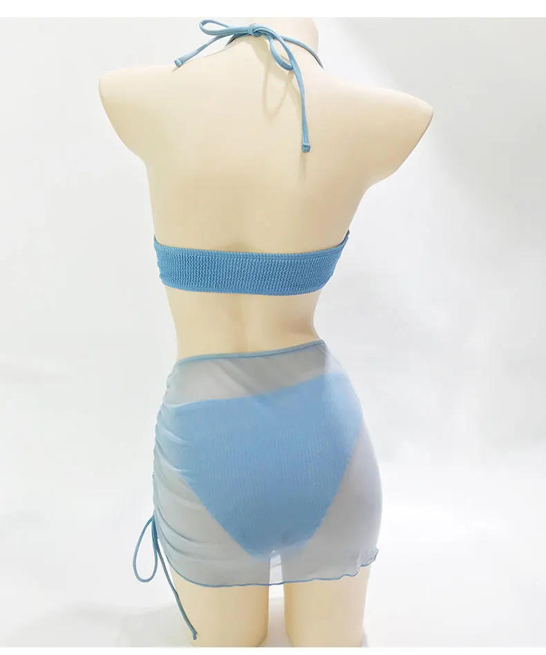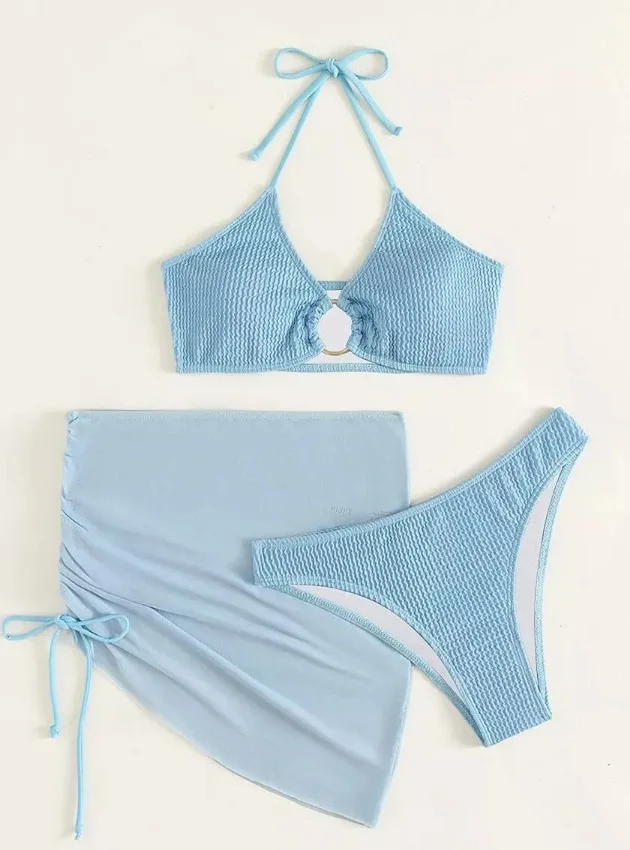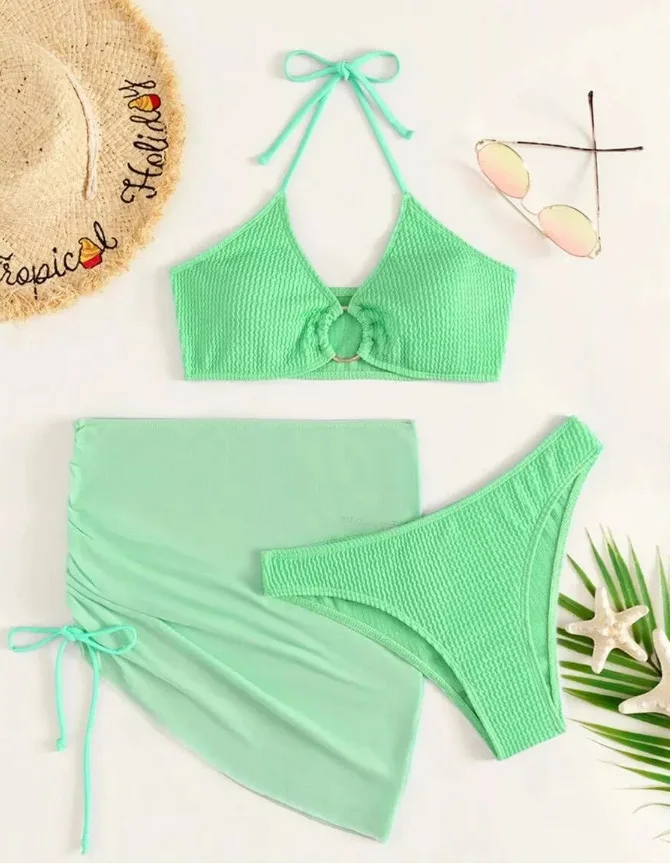 Cikini Women Halter Micro Ribbed Bikini 3 Pieces Set Mesh Swimsuit High Waist Swimwear Sexy Solid Beachwear Bathing Suit Biquini