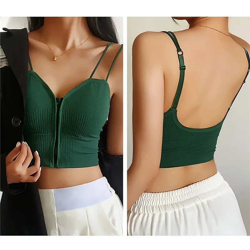 Crop Top Women Sexy Elastic Camis Sleeveless Short Tank Top Backless Top Knitted Front Zip Top Beauty Back Bra Sports Bra