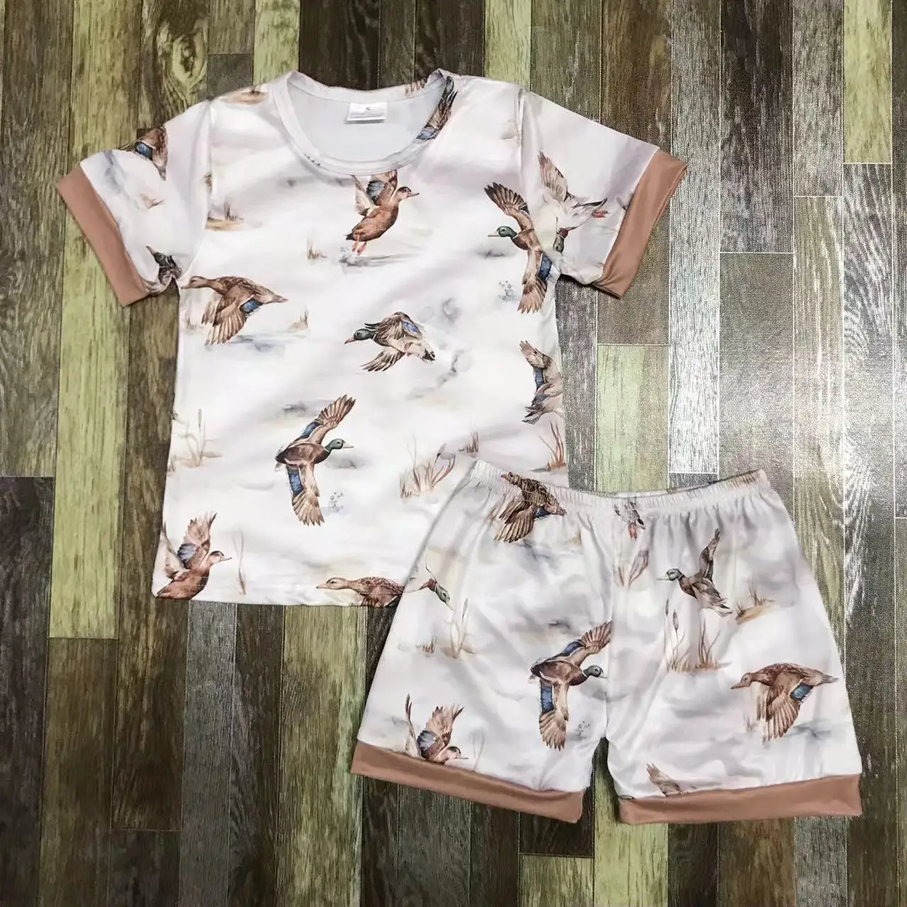 Cute boy mallard pattern crewneck brown lace shorts children's outfit 11