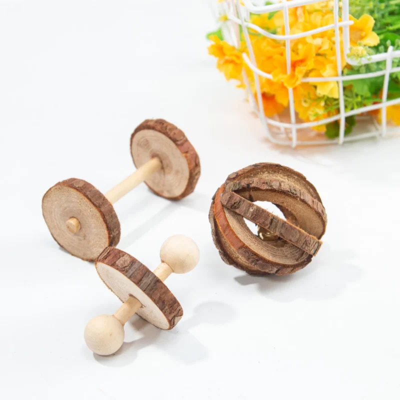 Cute Rabbit Roller Toys Natural Wooden Pine Dumbells Unicycle Bell Chew Toys for Guinea Pigs Rat Small Pet Molars Supplies