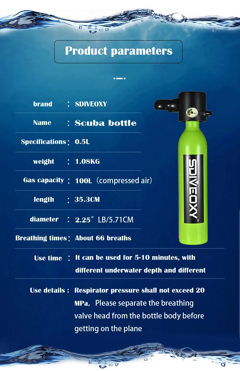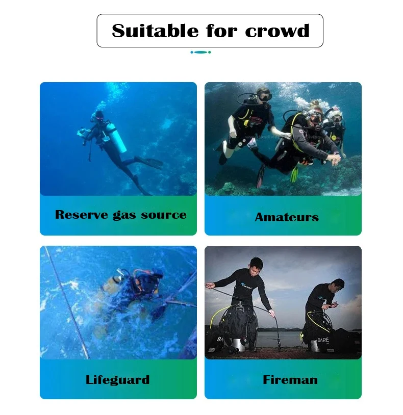 It is recommended for beginners or amateur diving enthusiasts to use this product within 5 meters of water depth. Professional divers are recommended as spare oxygen tanks for water depths up to 30 meters
