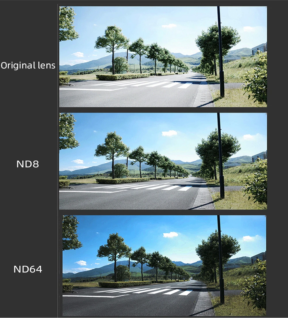 – You can get more freedom to control the aperture and shutter, bring more creative space for exposure methods, and effectively prevent overexposure. The number behind ND represents the ability of the ND lens to block light