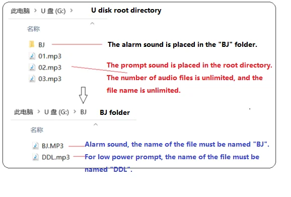 2. The “BJ” folder in the “U disk” respectively stores “alarm sound” and “low power indicator”, which can also be replaced.
