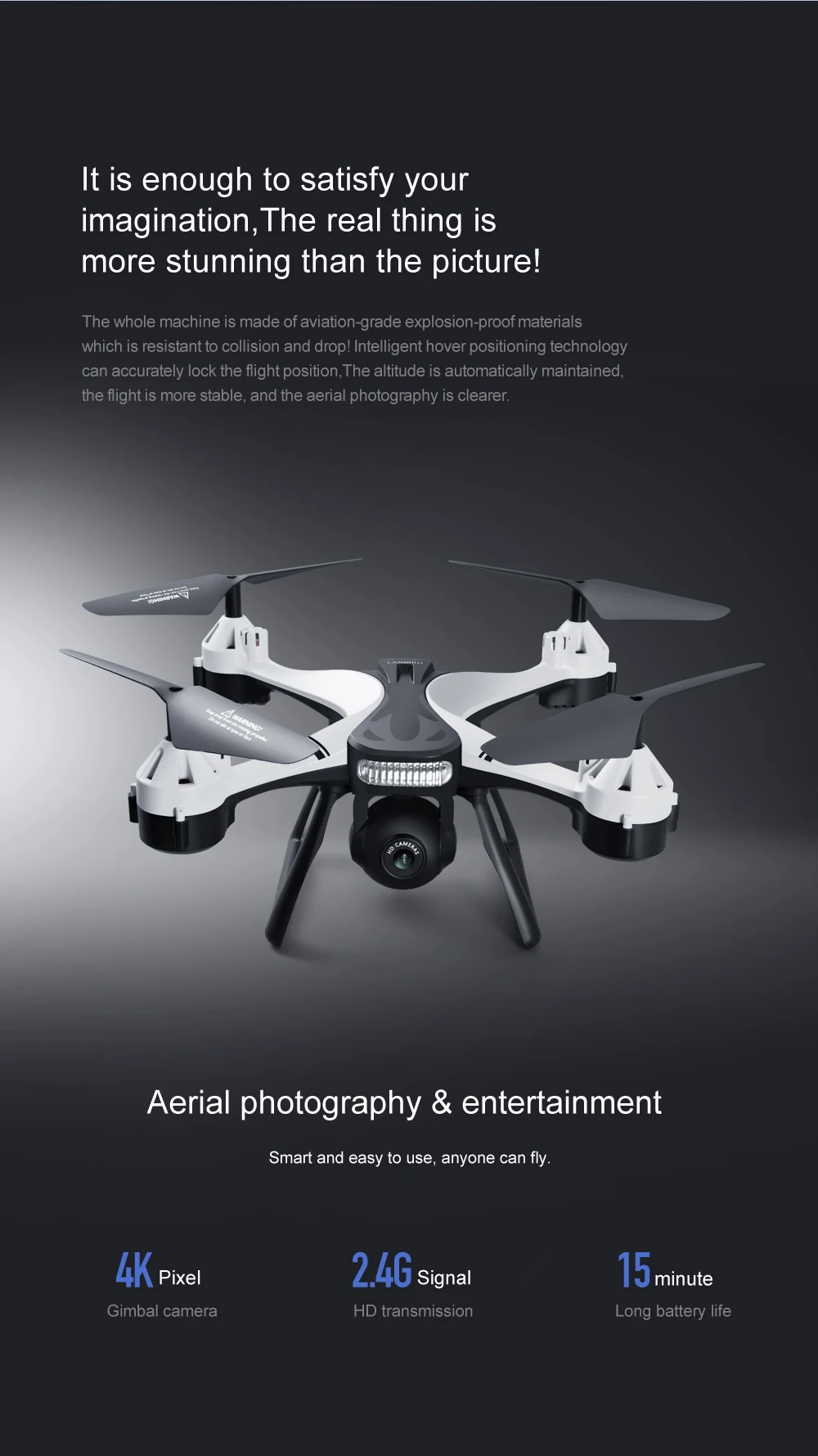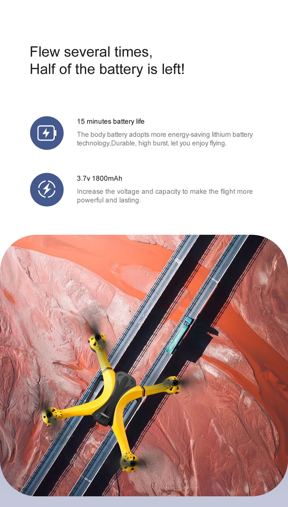 -This RC Drone is equipped with a large capacity modular battery of 1800mAh, can be used for 12-15 minutes after a full charging, easy to replace.