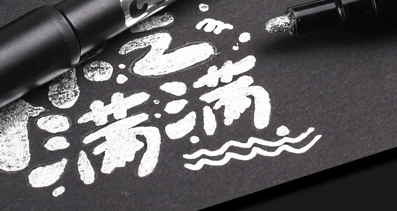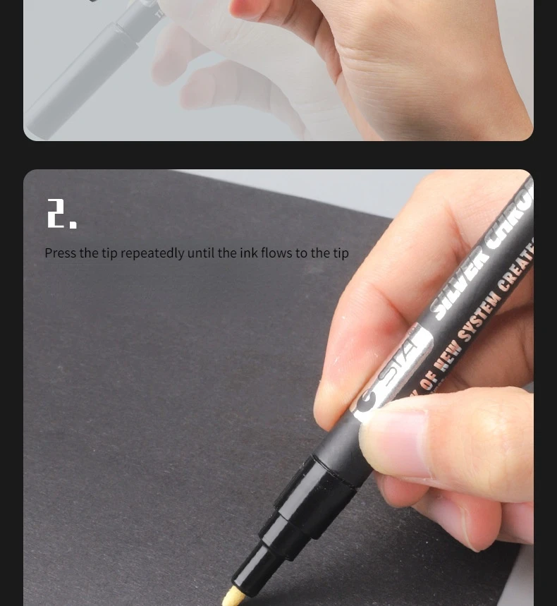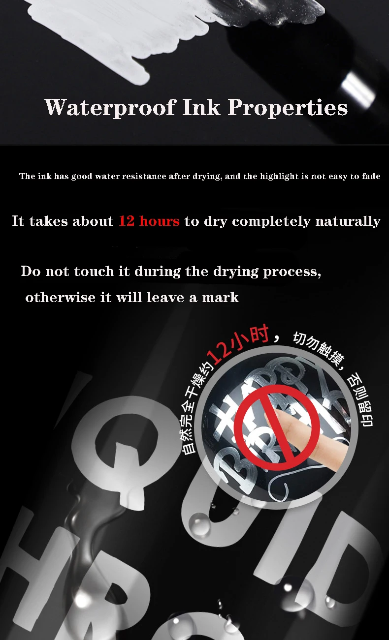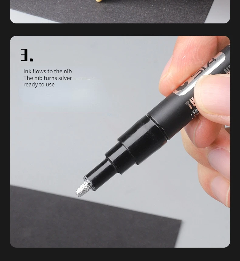 How to use: 1. Shake the pen up and down before each use to mix the ink evenly. 2. Press the tip up and down for 3-4 seconds to release the air. 3. Press the nib down and back to saturate the nib with ink before use. Do not touch when not dry