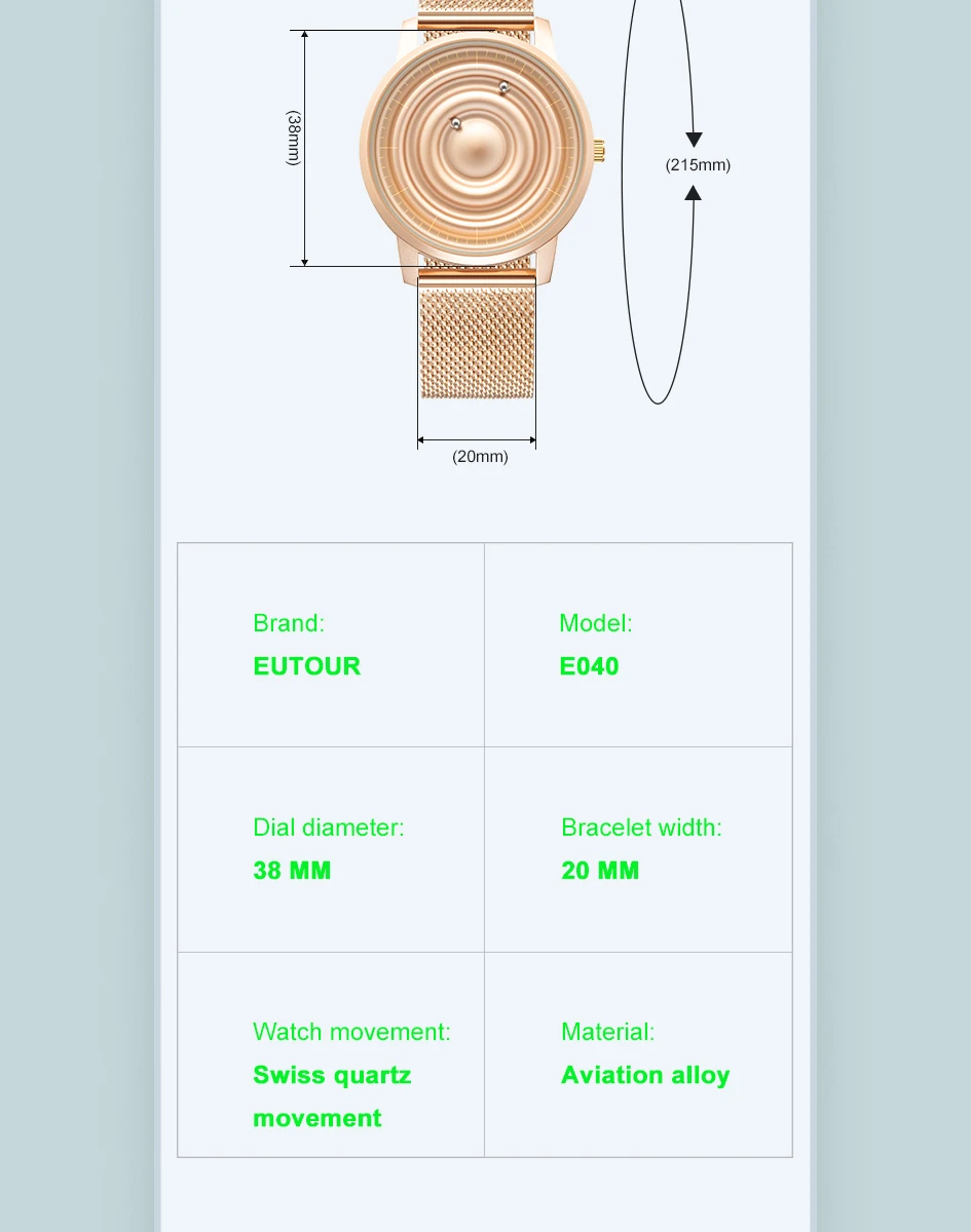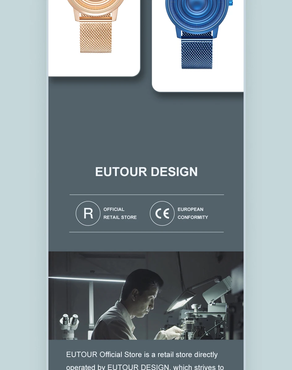 Tired of the same old boring watch design? Worst of all, every watch works the same. We Eutour decided to disrupt the entire industry by creating spectacular watches that turn heads everywhere you go. Our daring design allows people to tell time with touch and sight.