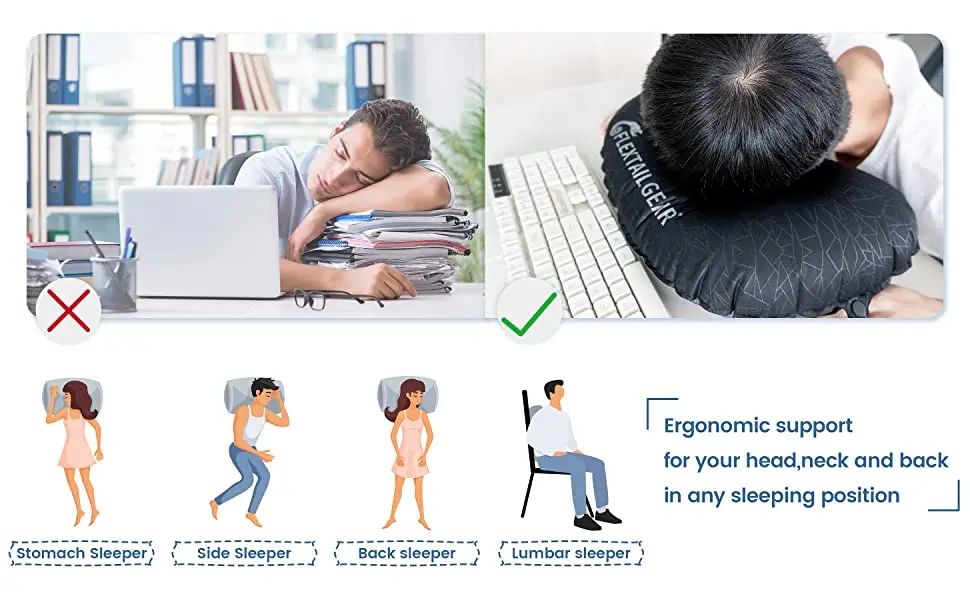 4.Humanity Designed: Inflates to 16.9″ x 10.6″ x 3.9″(43 x 27 x 10 cm) in providing a full support for your neck, head, back, or lumbar. Ergonomically designed for superior neck and back support while you travel—sleep like at home. With the unique technology in this compact and light pillow, you are able to adjust firmness to your personal sleep preference. The inflatable air pump perfect for any trip whether by car, train or airplane.