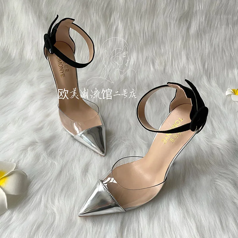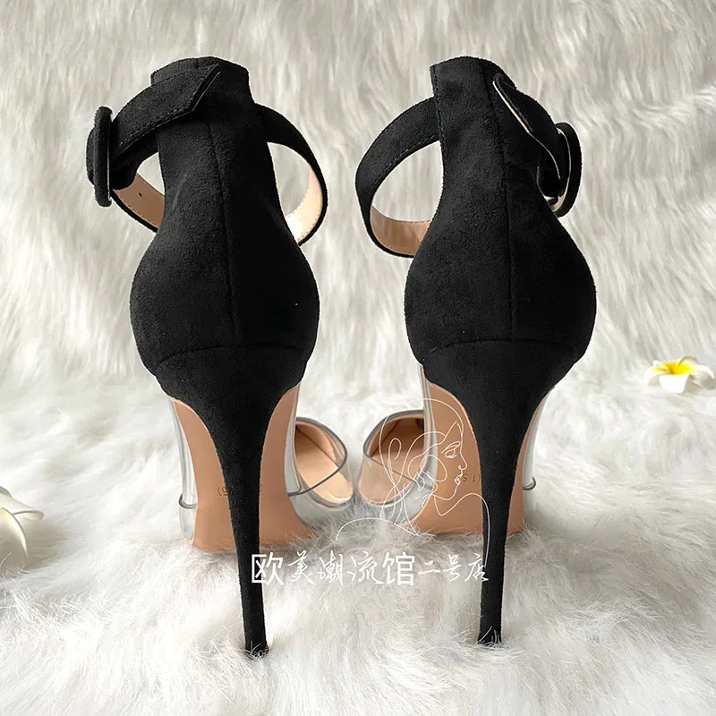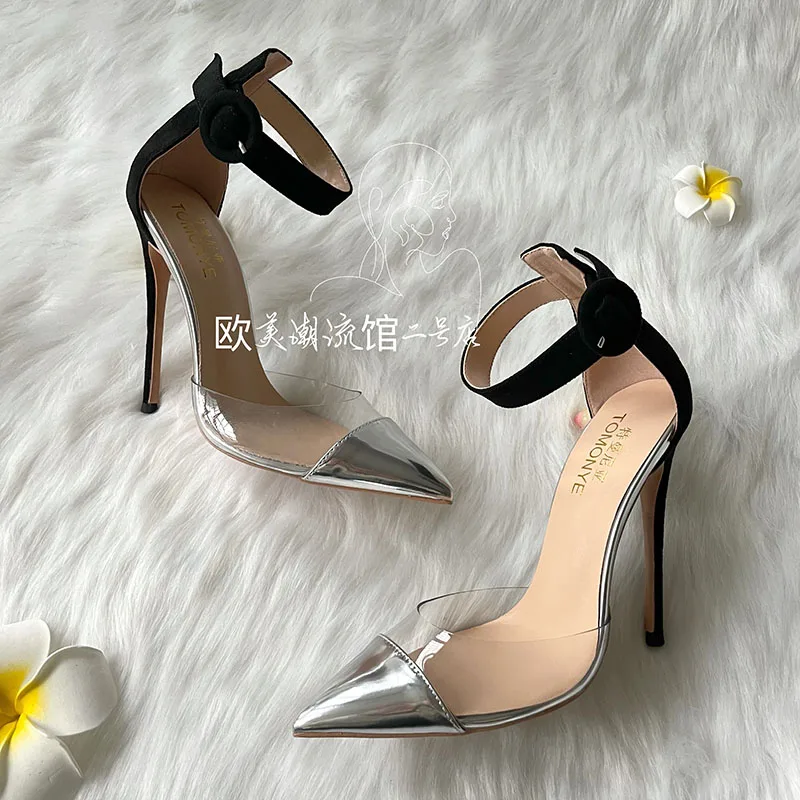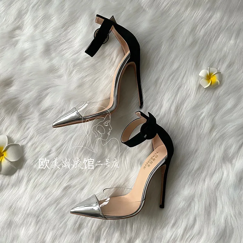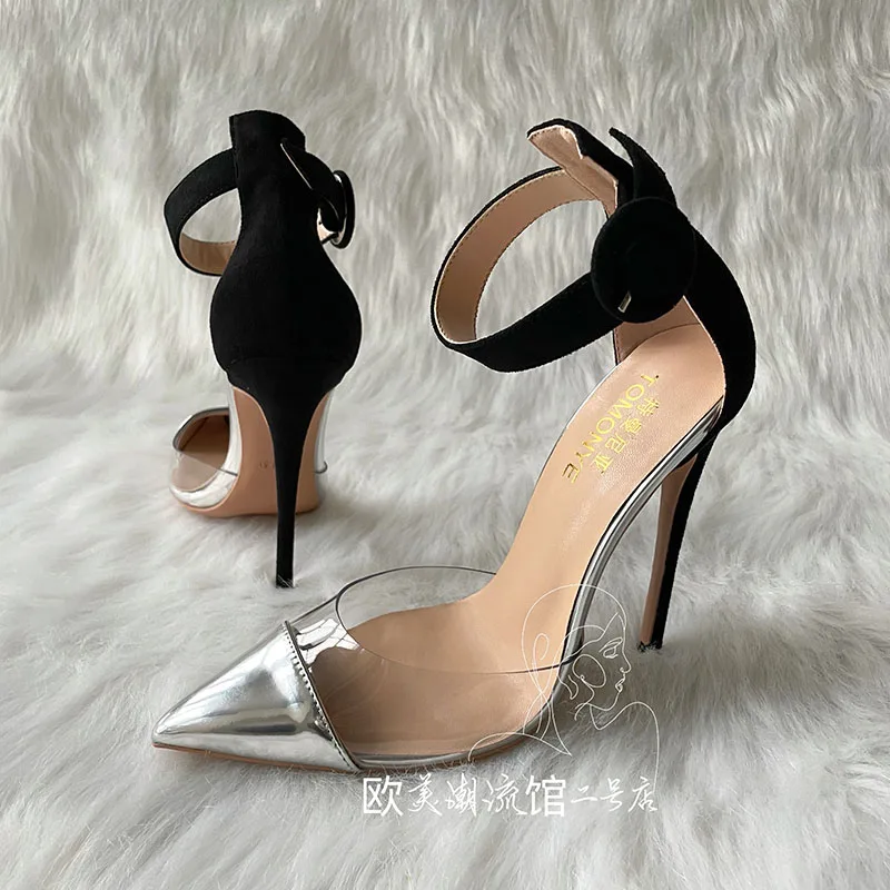 Free Shipping TOMONYE Silver PVC Pointed Toe Two Piece Black Suede With Ankle Strap Women Lady 120mm High Heel Shoes Pump