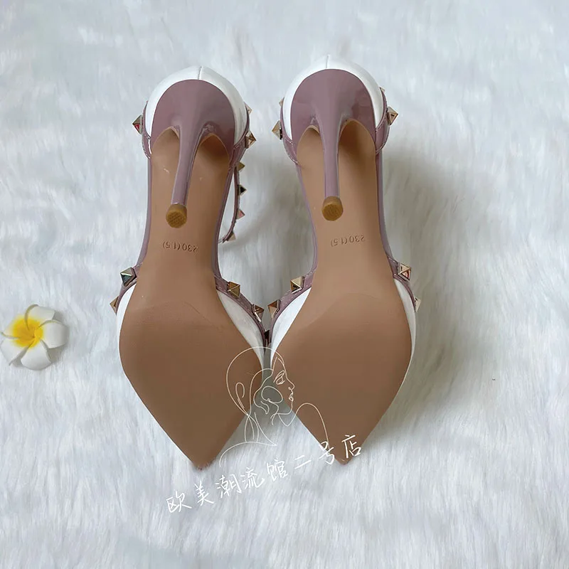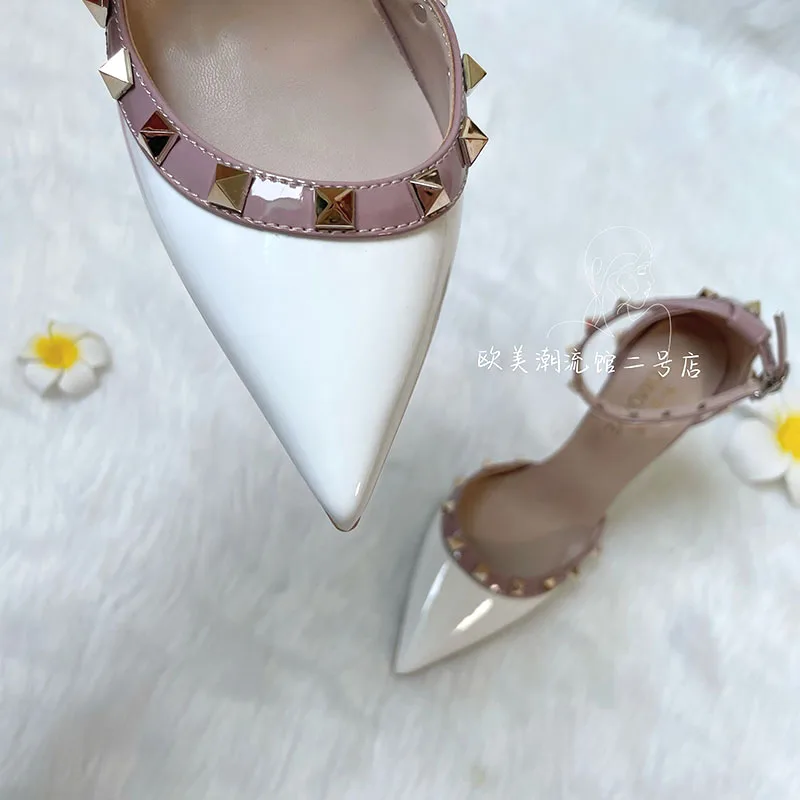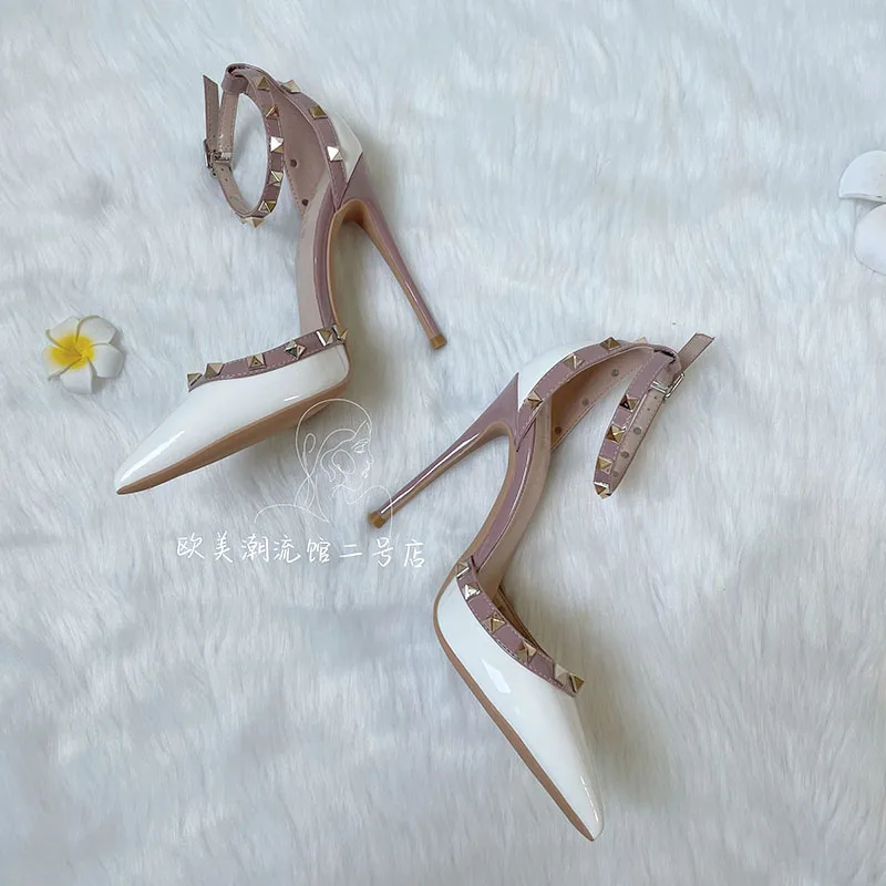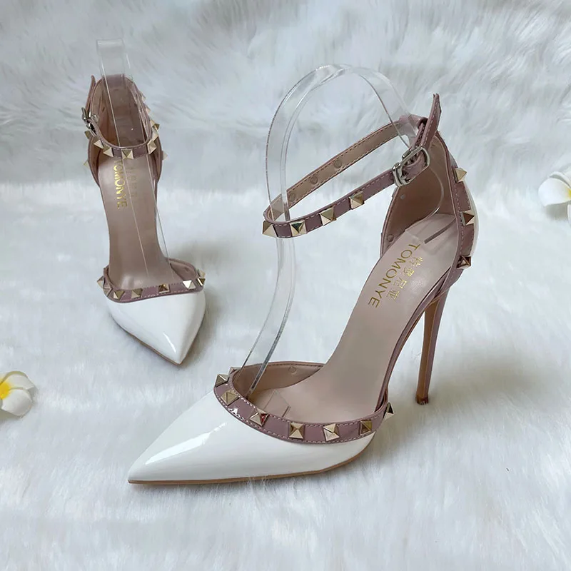 Free Shipping TOMONYE white patent with stud ankle strap cut in the middle 12cm High Heel Shoes for Evening Dress pump