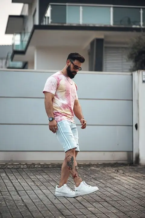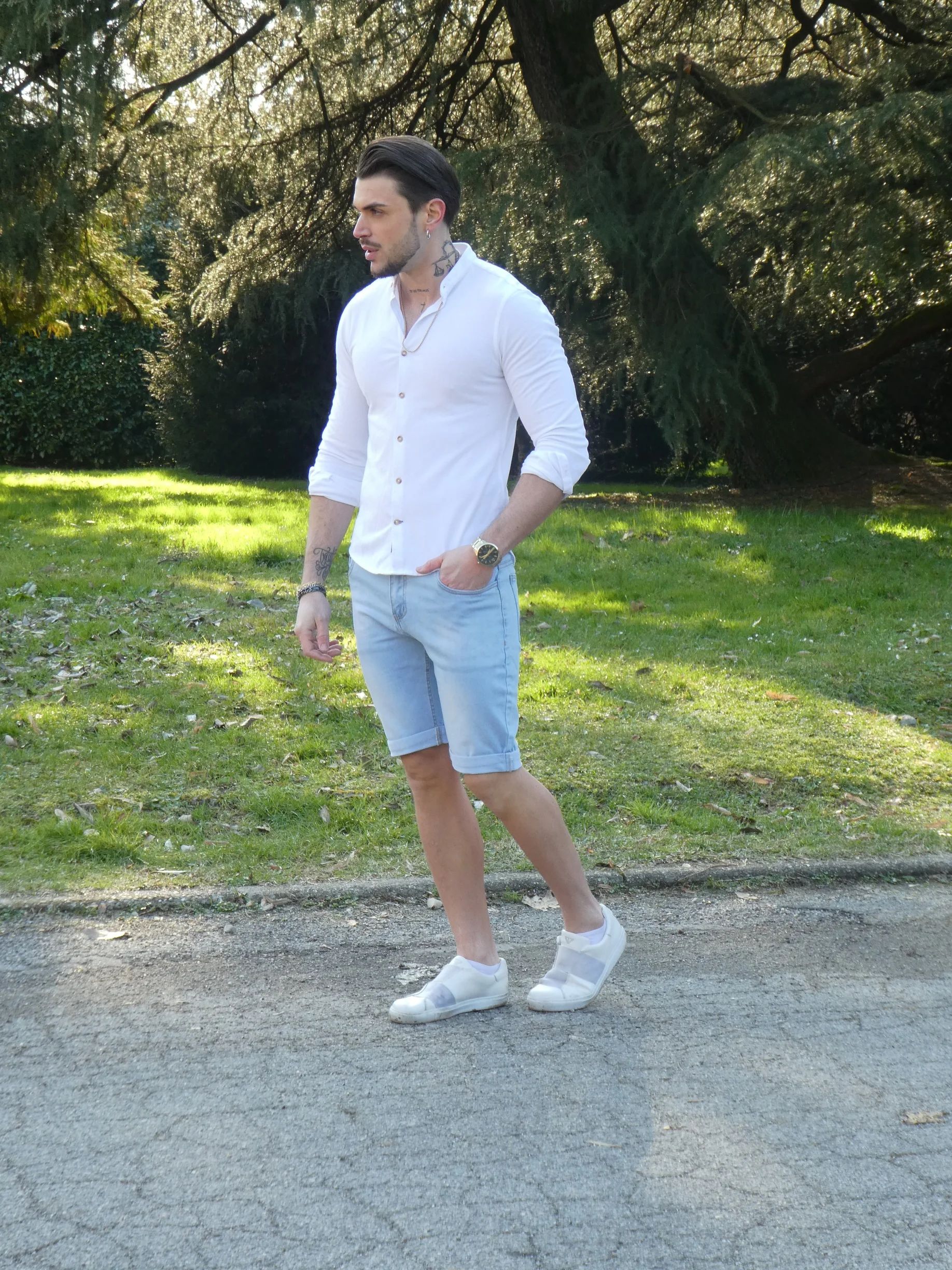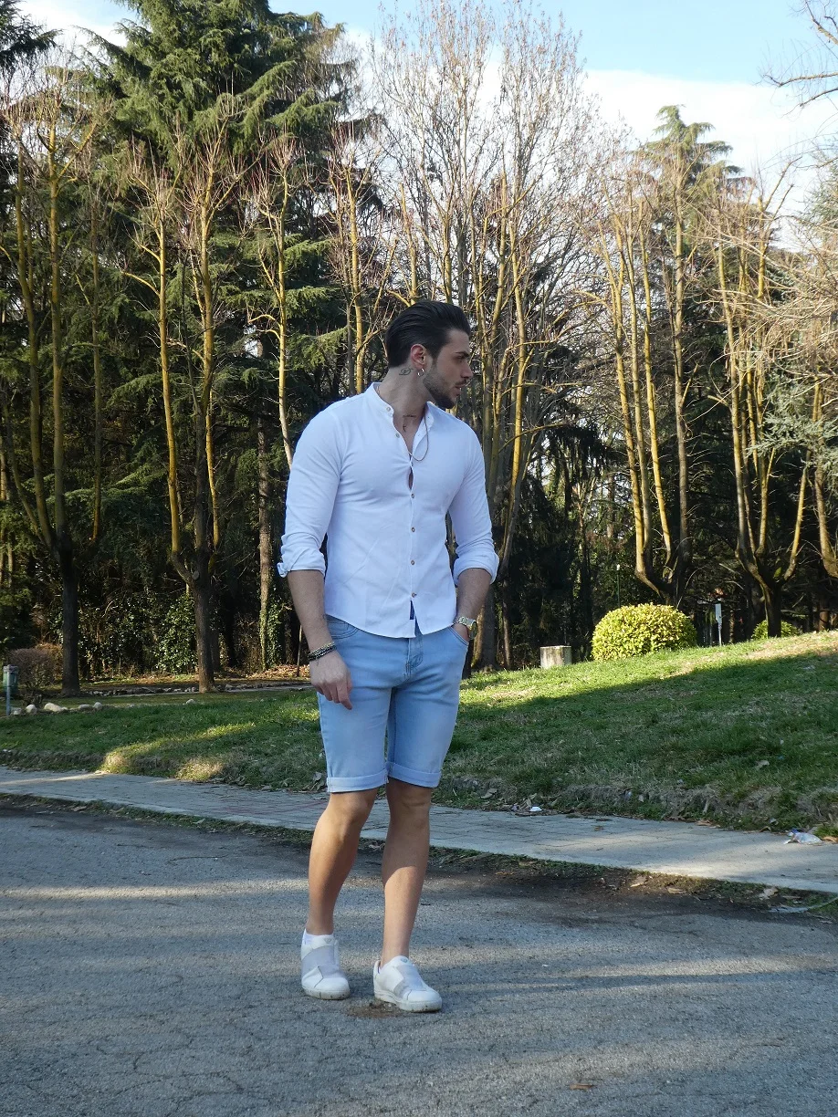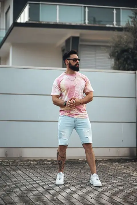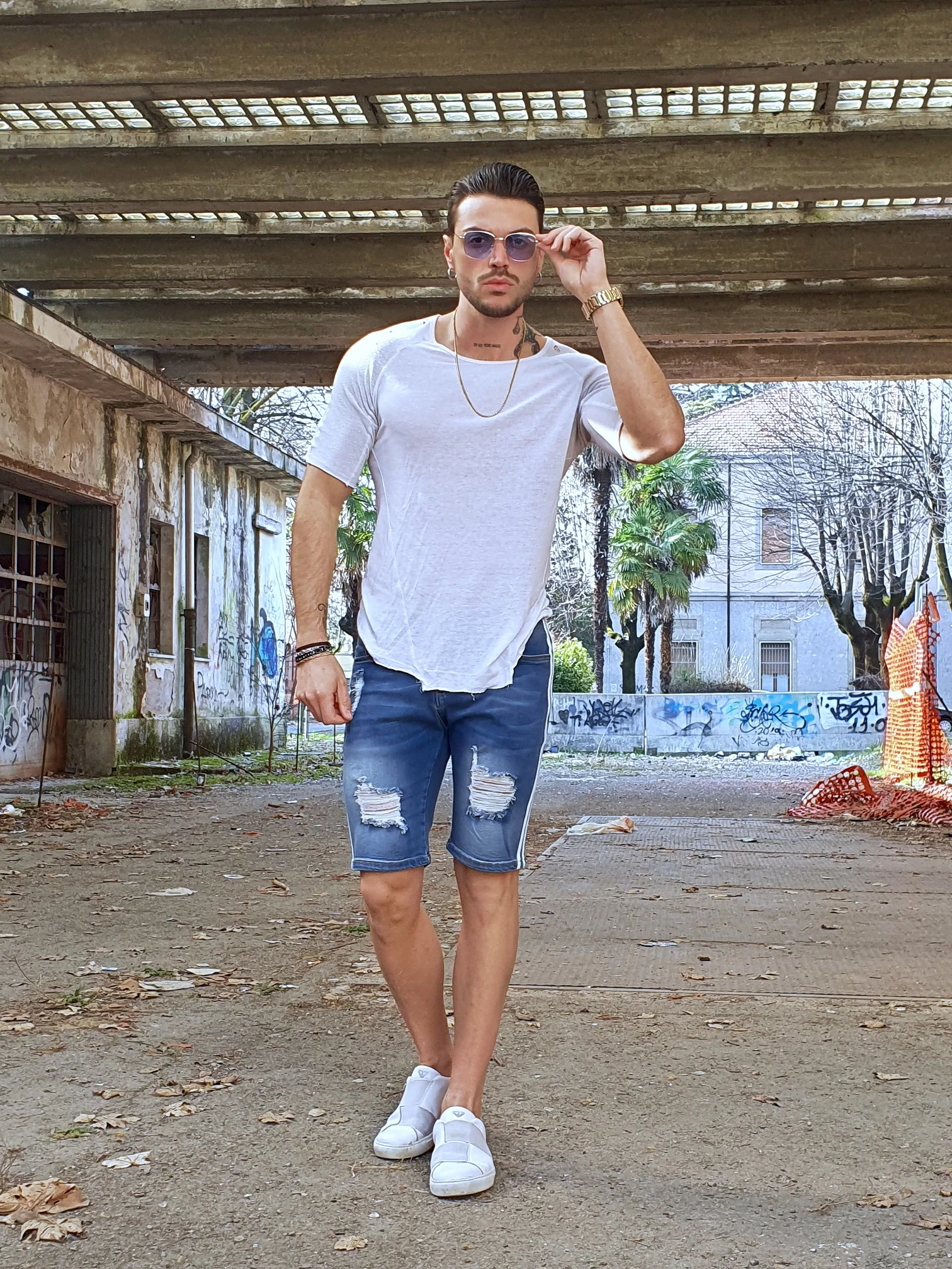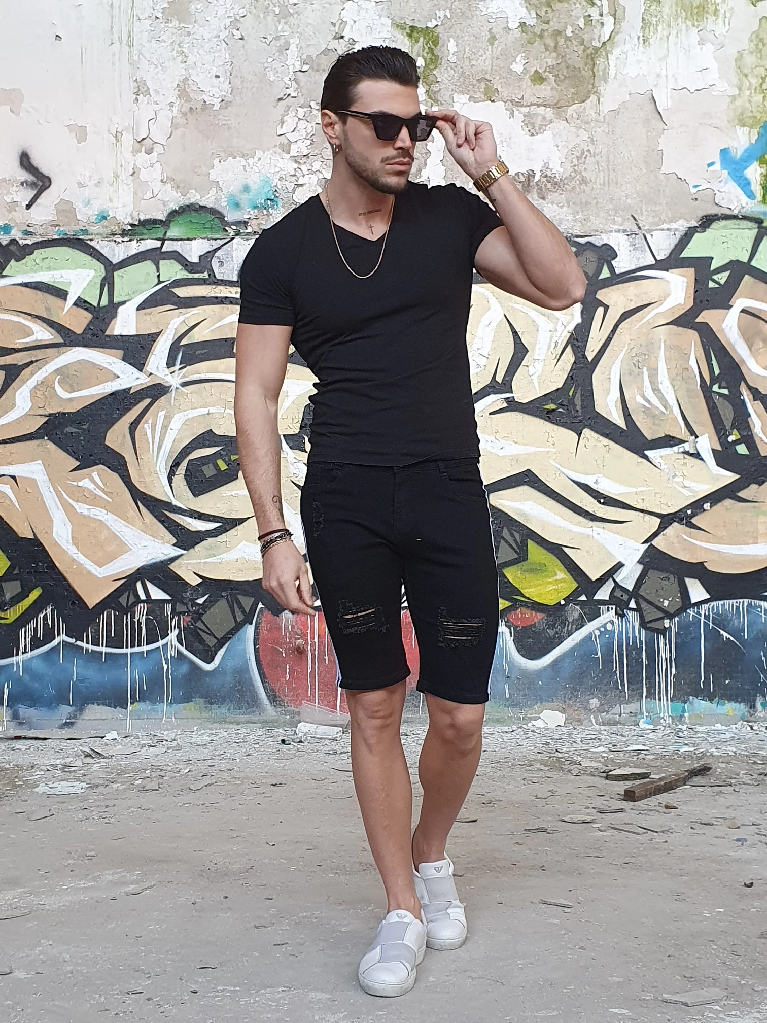 Hipster slim fit denim shorts, fashion ripped short jeans design.
