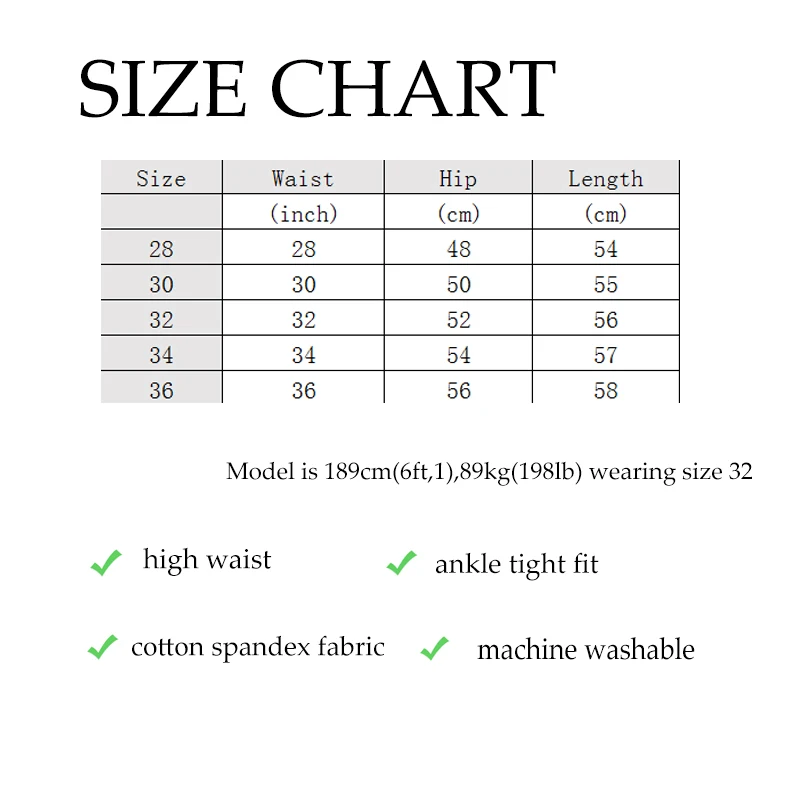 Our size is different with amazon size chart, please compare our size chart before order. Model is 6’2″, 196lb, size medium top and is wearing size 32.