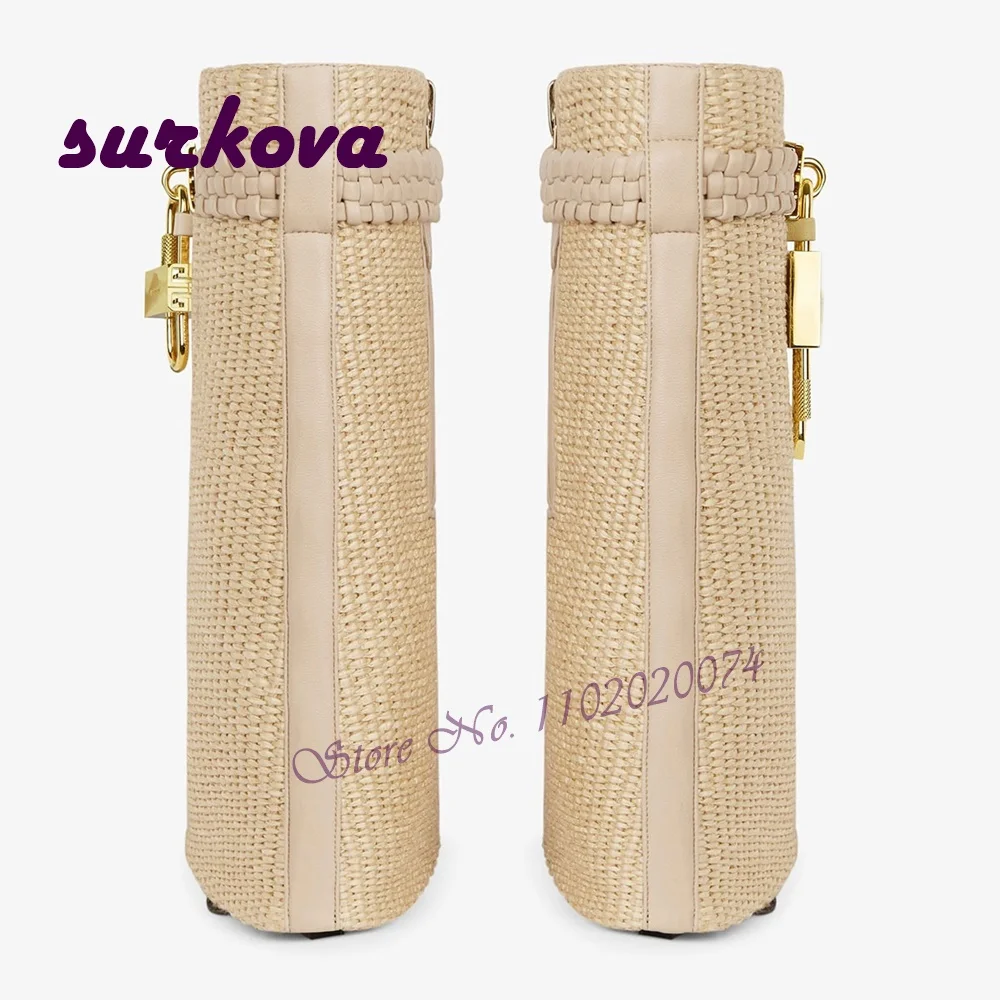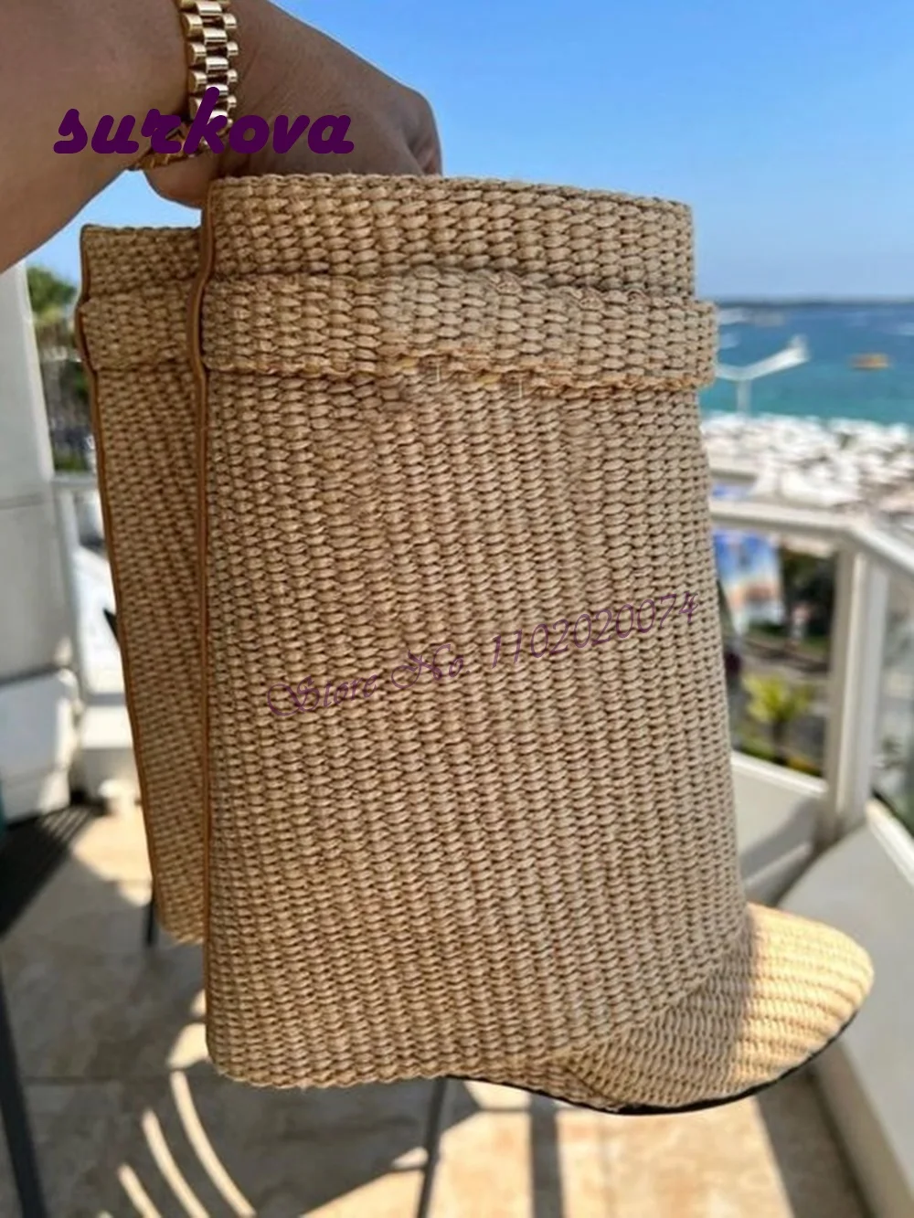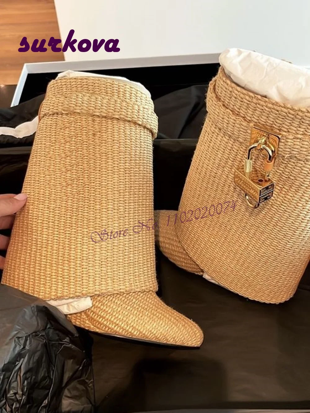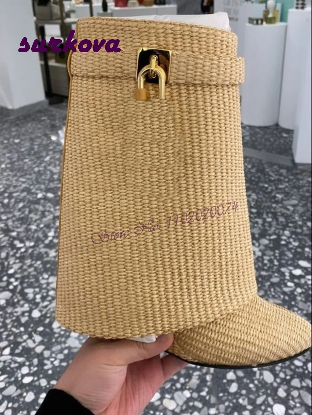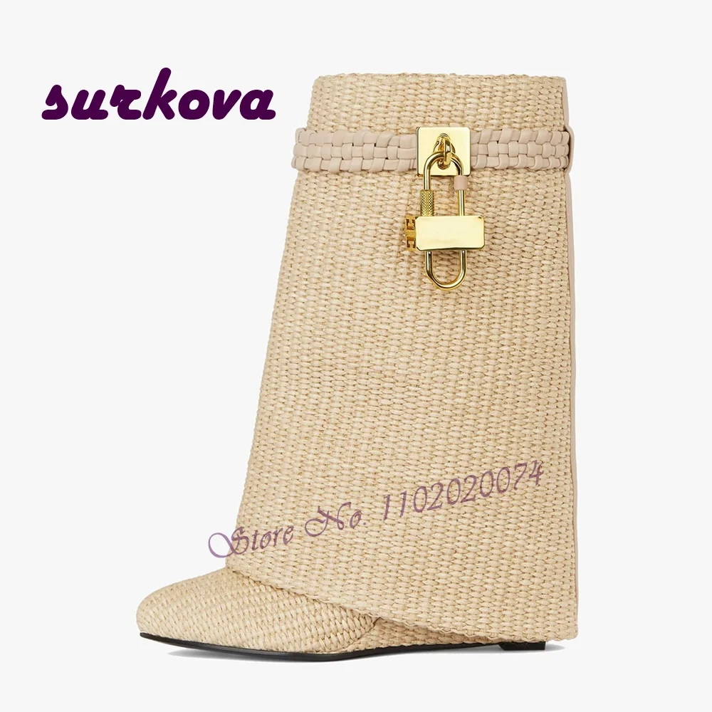 Knitted Padlock Mid-Calf Boots Round Toe Wedges Side Zipper Women's Boots Solid 2023 New Arrival Party Runway Shoes Sexy Casual