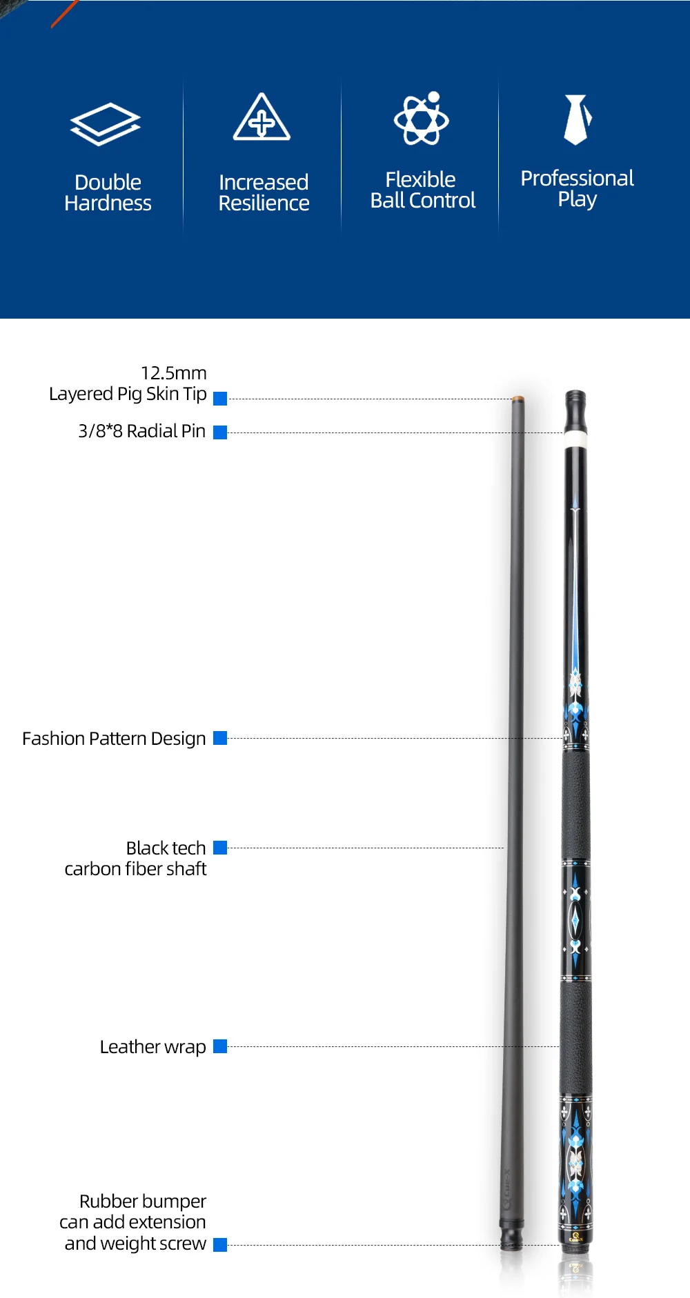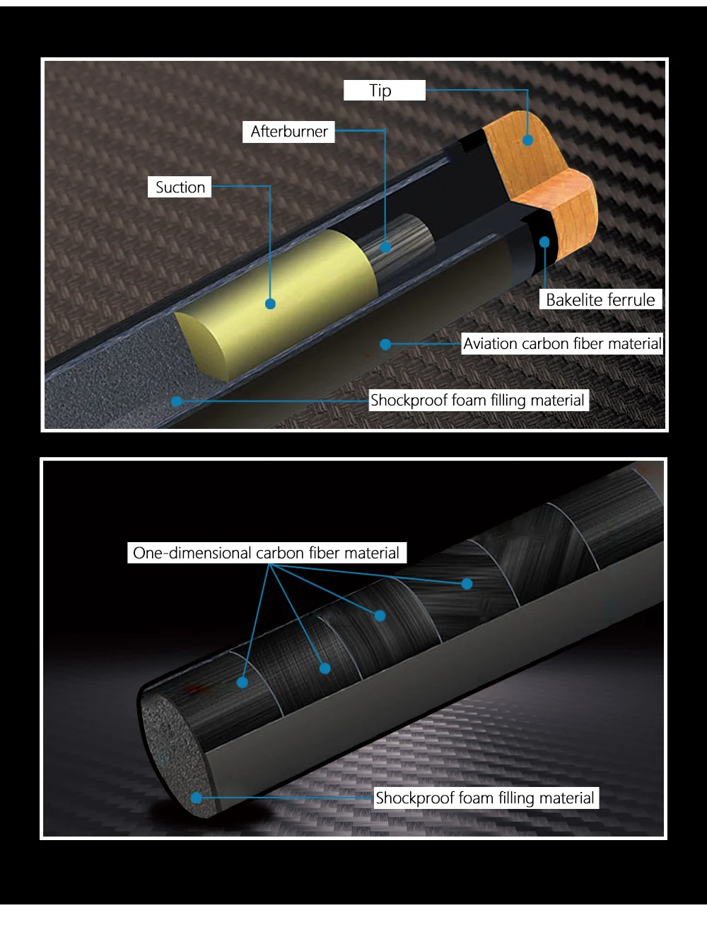 Butt is made of 5 carbon fiber sheets embedded in it to improve stability and not easy to deform.Butt stained with Unique Pattern, 3-section black Leather Wrap, sweat-wicking and non-slip.