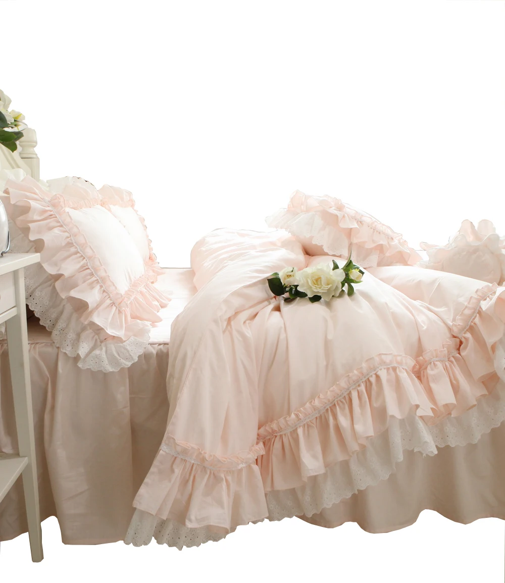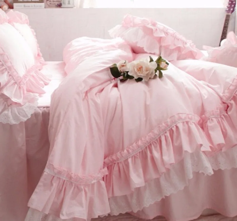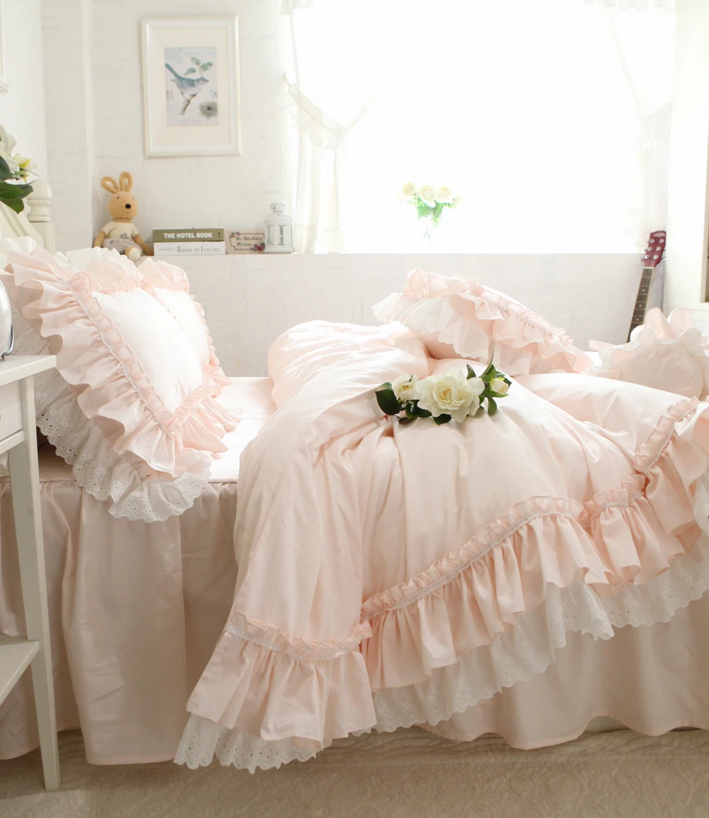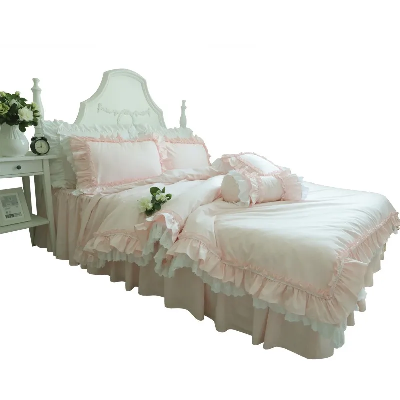 Korean Pure Cotton Pink Luxury Princess Wedding Beding 4pcs Sets King Queensize European Duvetcover Bedskirt Comforter Cover Set