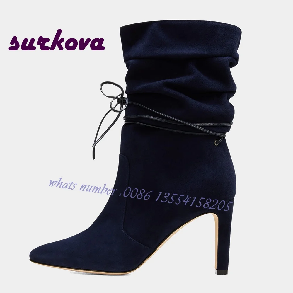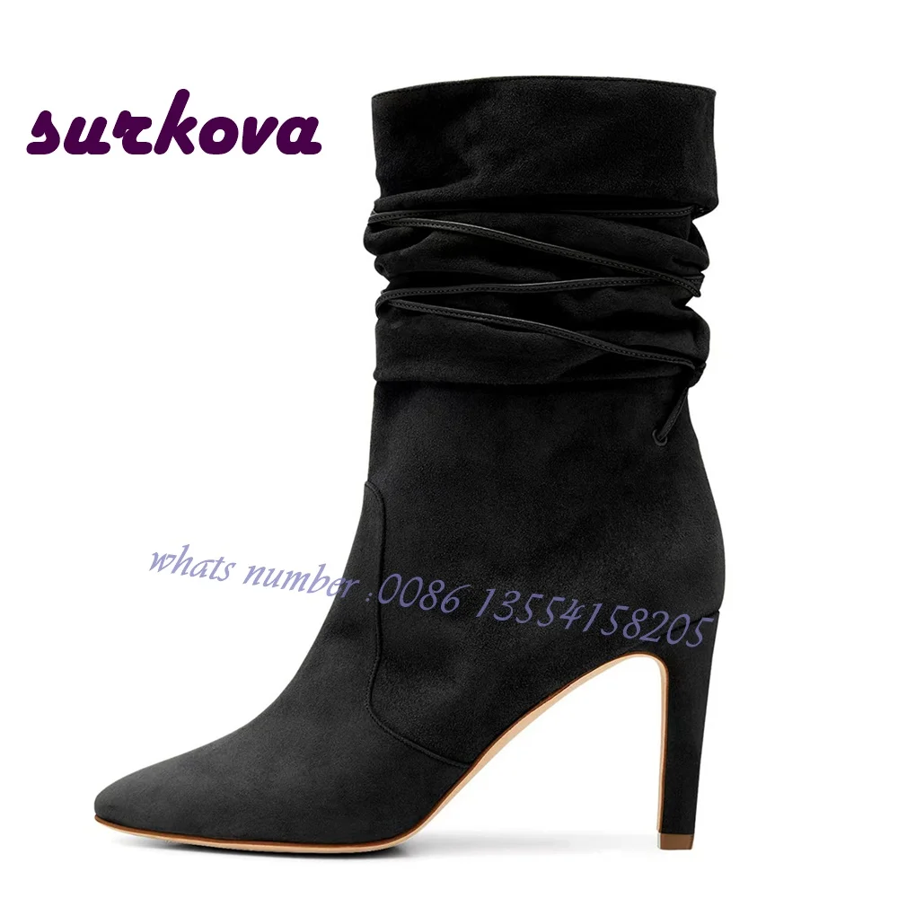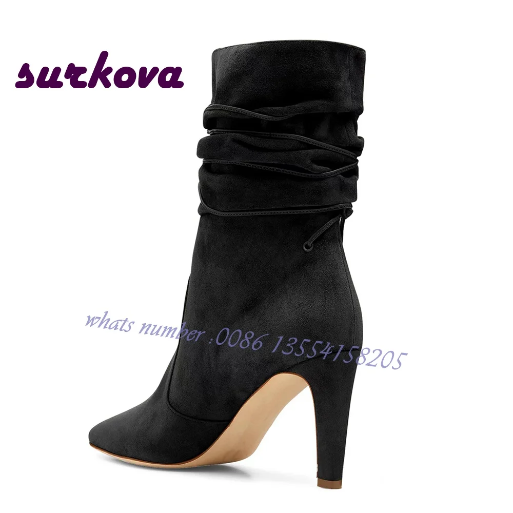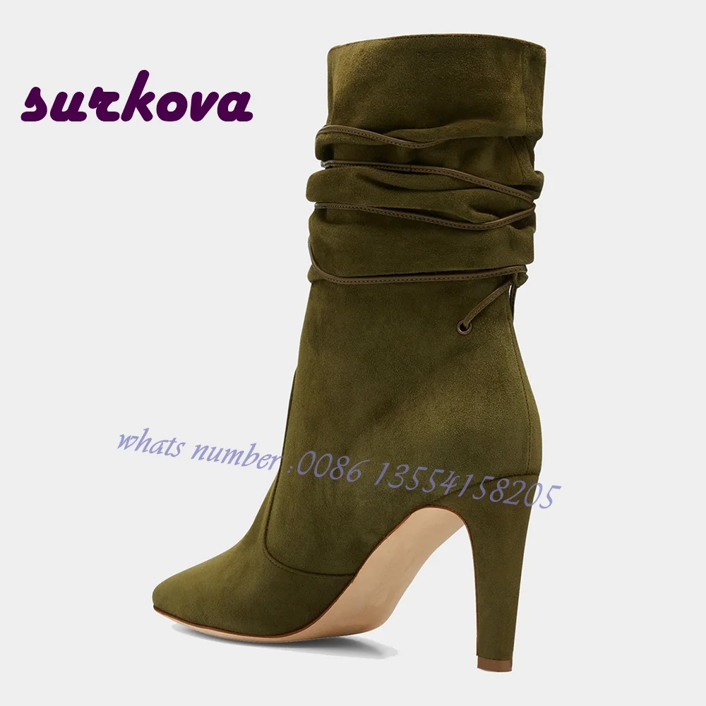 Lace Up Suede Pleated Boots Casual Pointy Toe Cross Strappy Mid Calf Boots Winter Stiletto Heels for Women Slip on Elegant Shoes