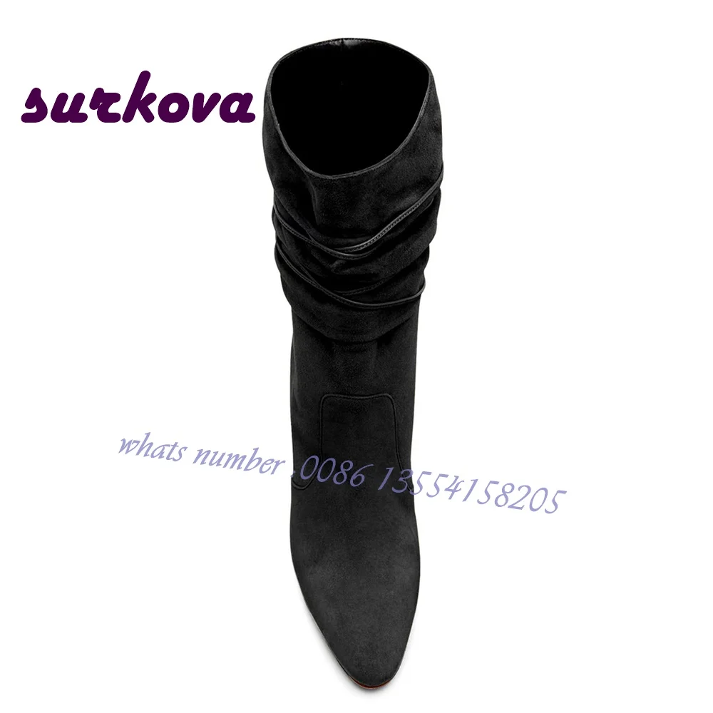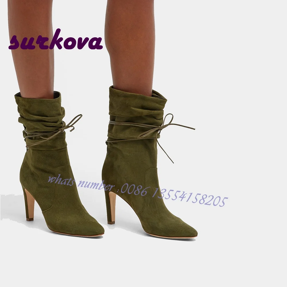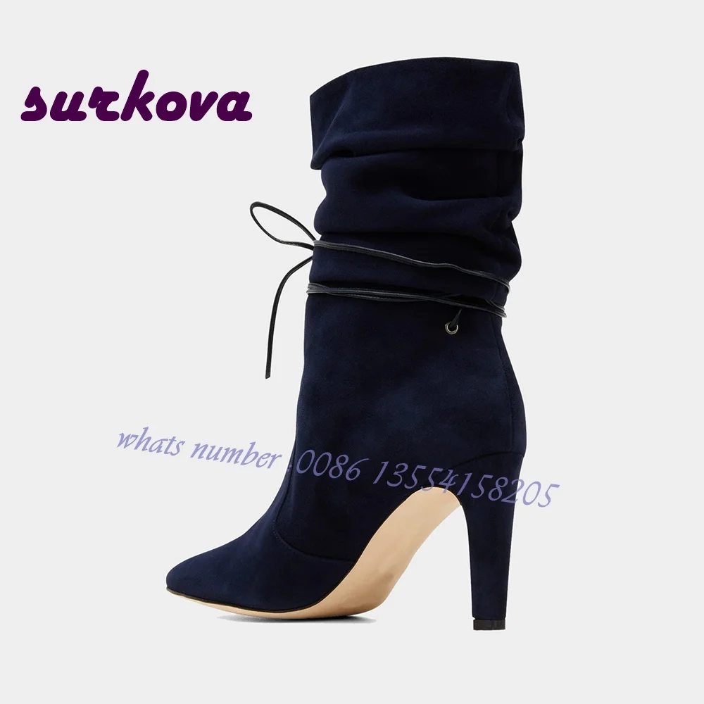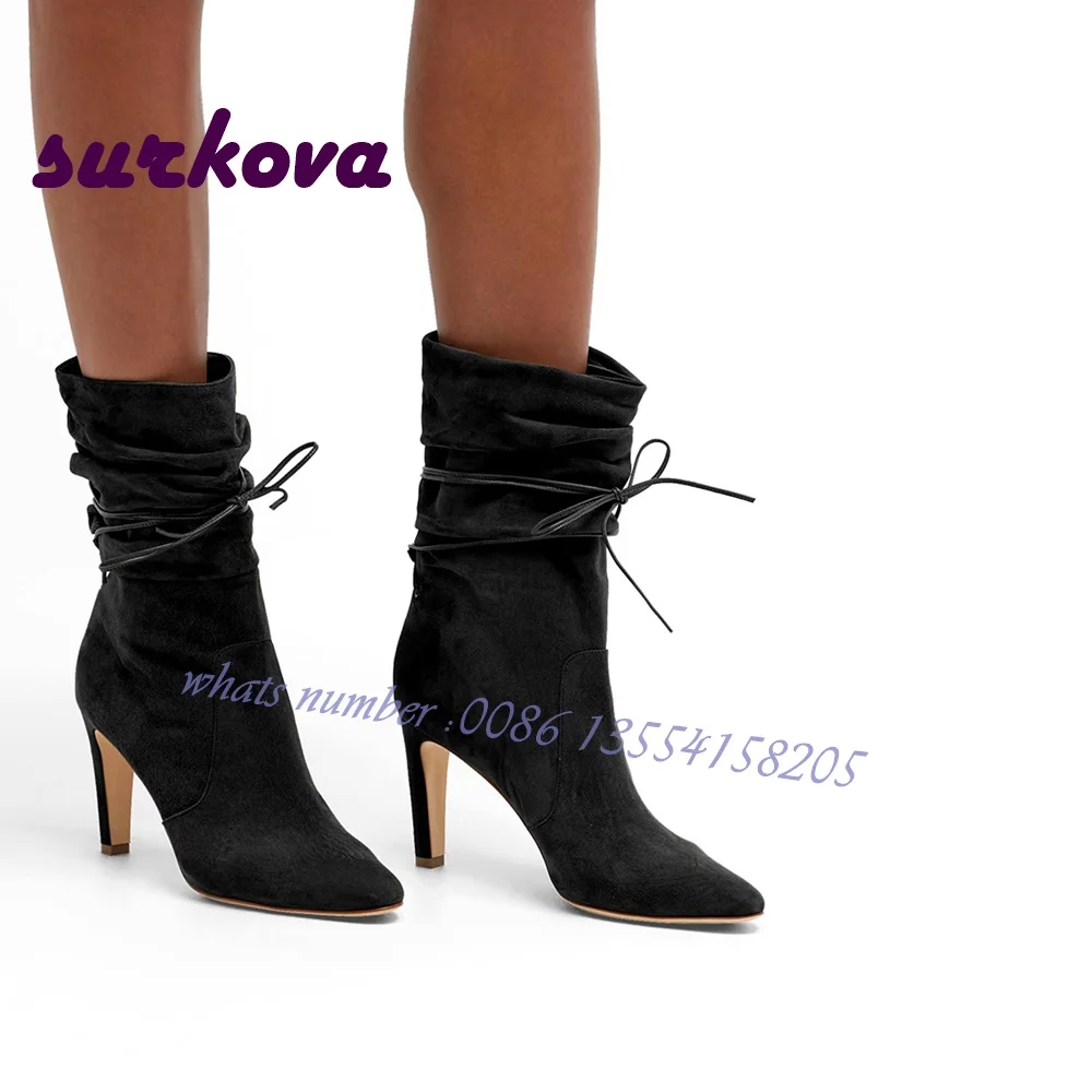 Lace Up Suede Pleated Boots Casual Pointy Toe Cross Strappy Mid Calf Boots Winter Stiletto Heels for Women Slip on Elegant Shoes