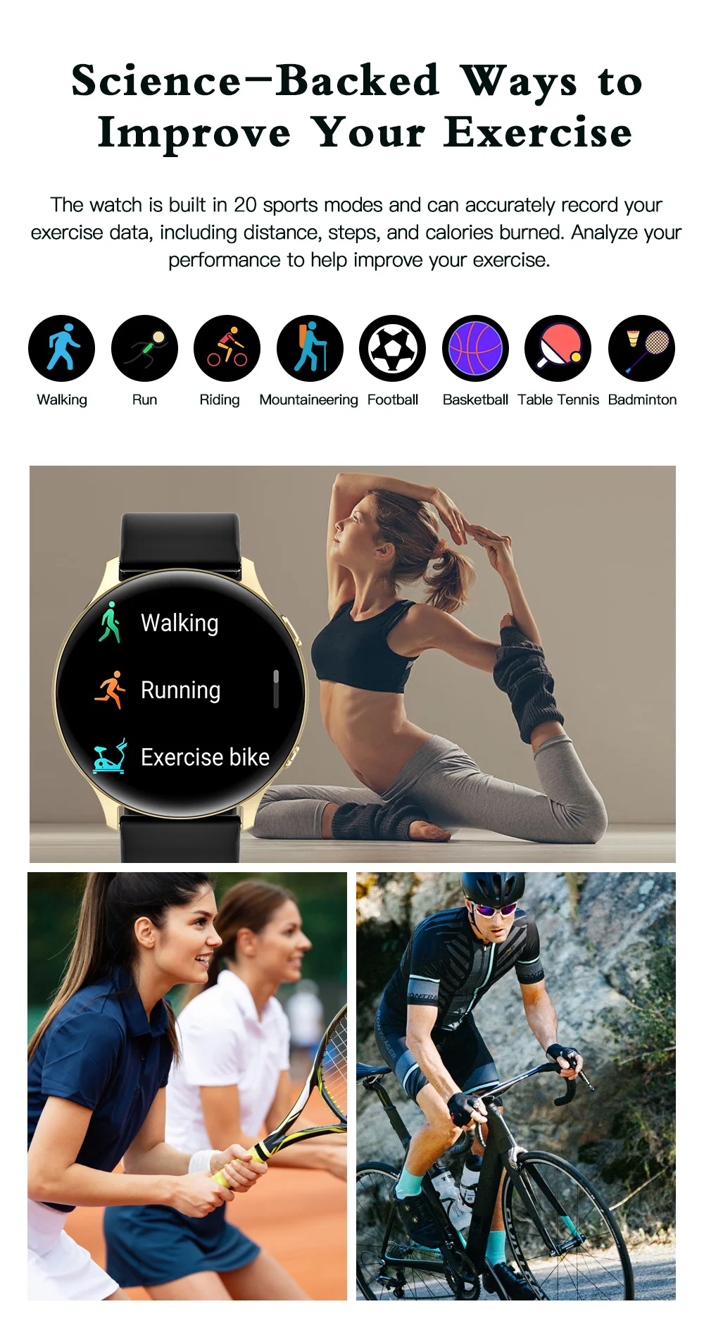 Step counting, calorie, distance, multi-sport mode can support 20 sports modes ((walking, outdoor running, cycling, swimming, yoga, elliptical machine, basketball, football, badminton, table tennis, rugby, tennis, baseball, skipping rope) , climbing, long jump, hula hoop, volleyball, golf, sit-ups))