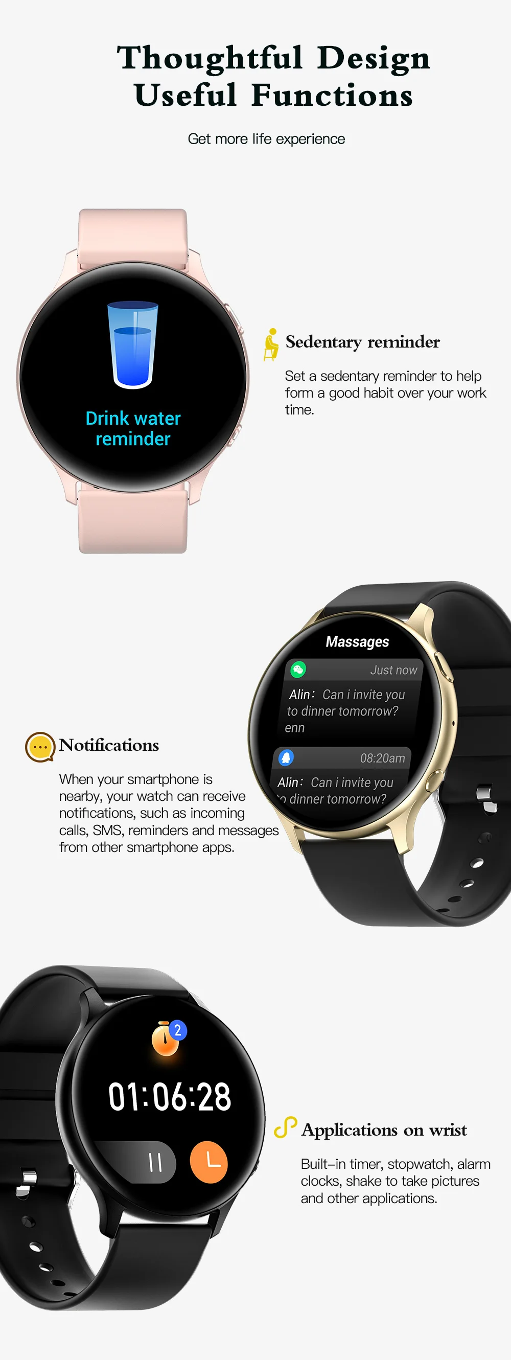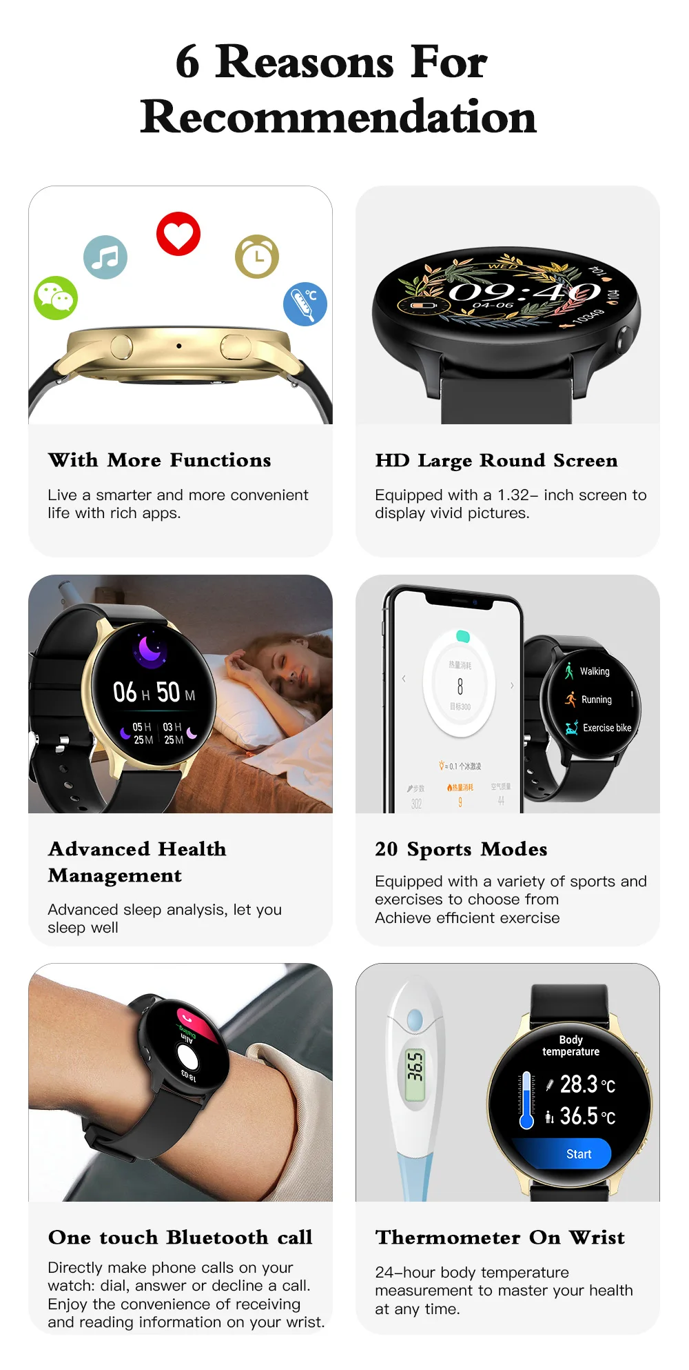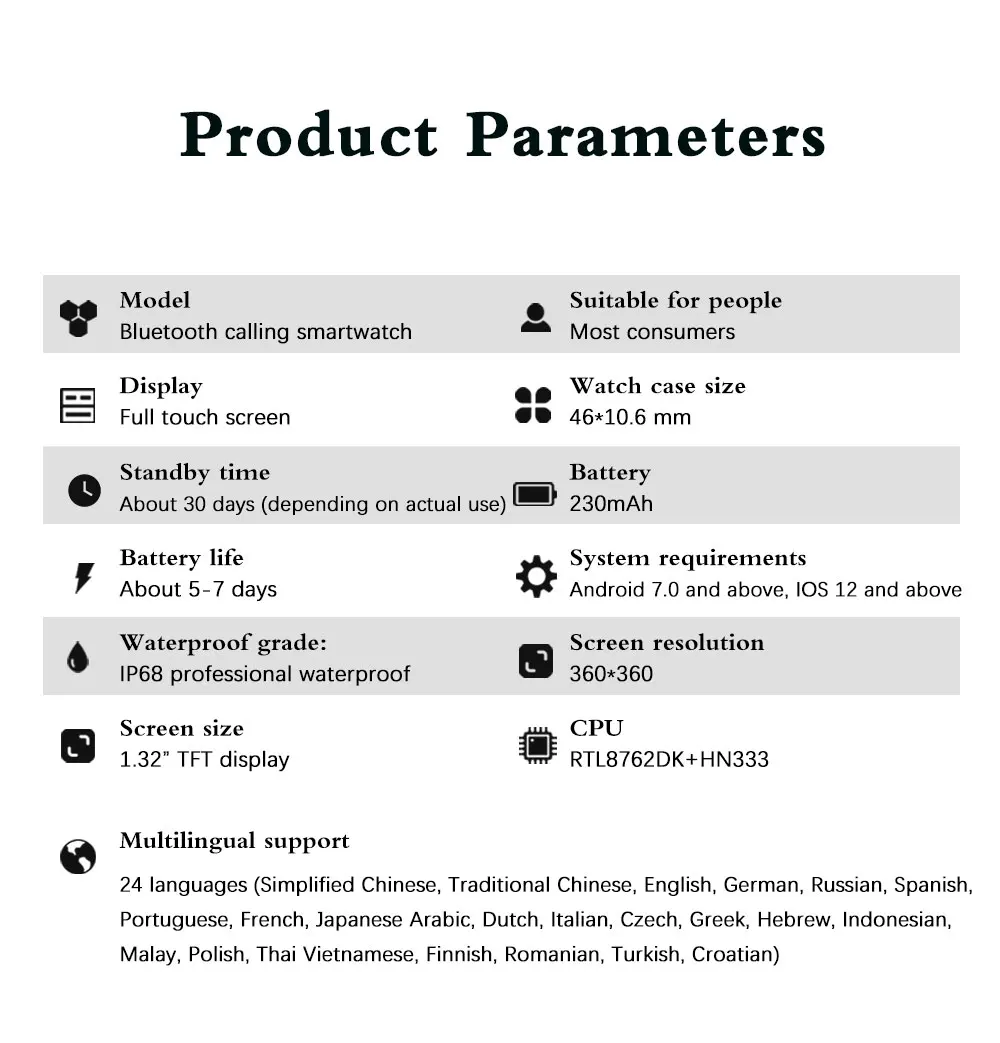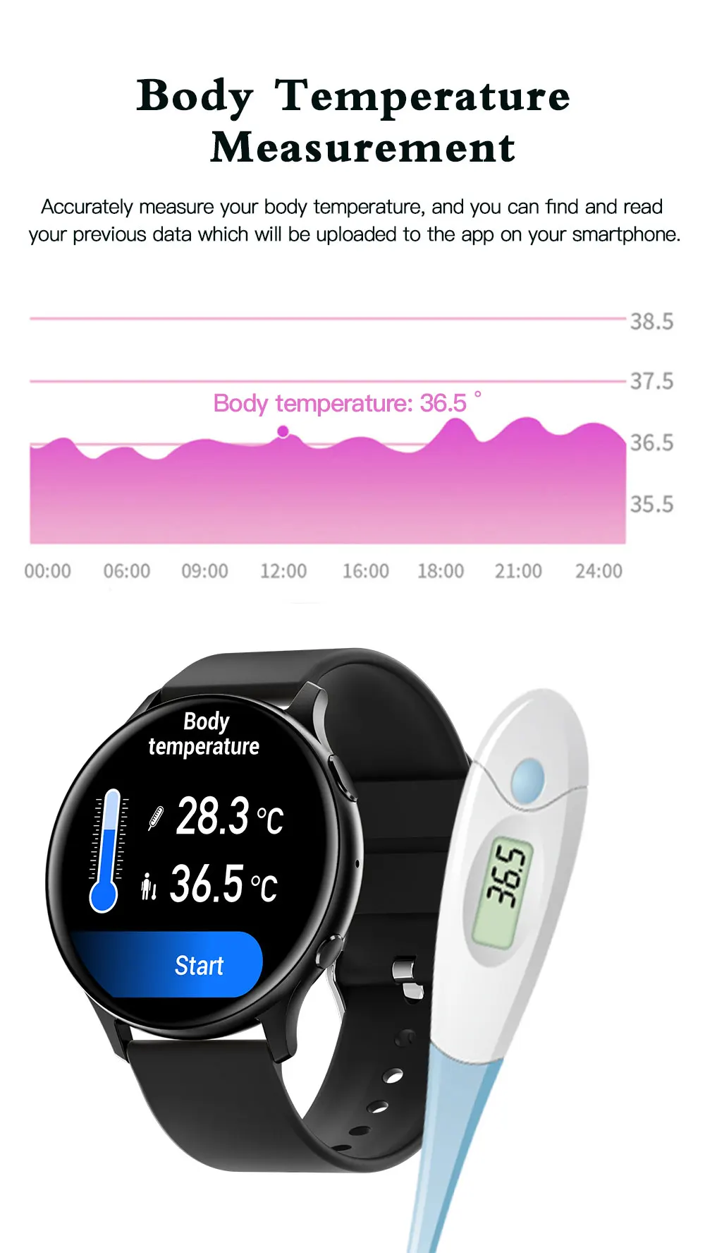 Body temperature monitoring, real-time heart rate, blood pressure, blood oxygen, sleep monitoring, health three rings,Incoming call message reminder, stopwatch, timer, alarm clock, weather, shake photo, music control, turn wrist to brighten screen, sedentary drinking water reminder, find watch, multi-languagencoming call/SMS content push