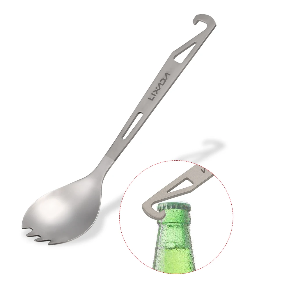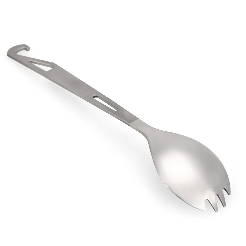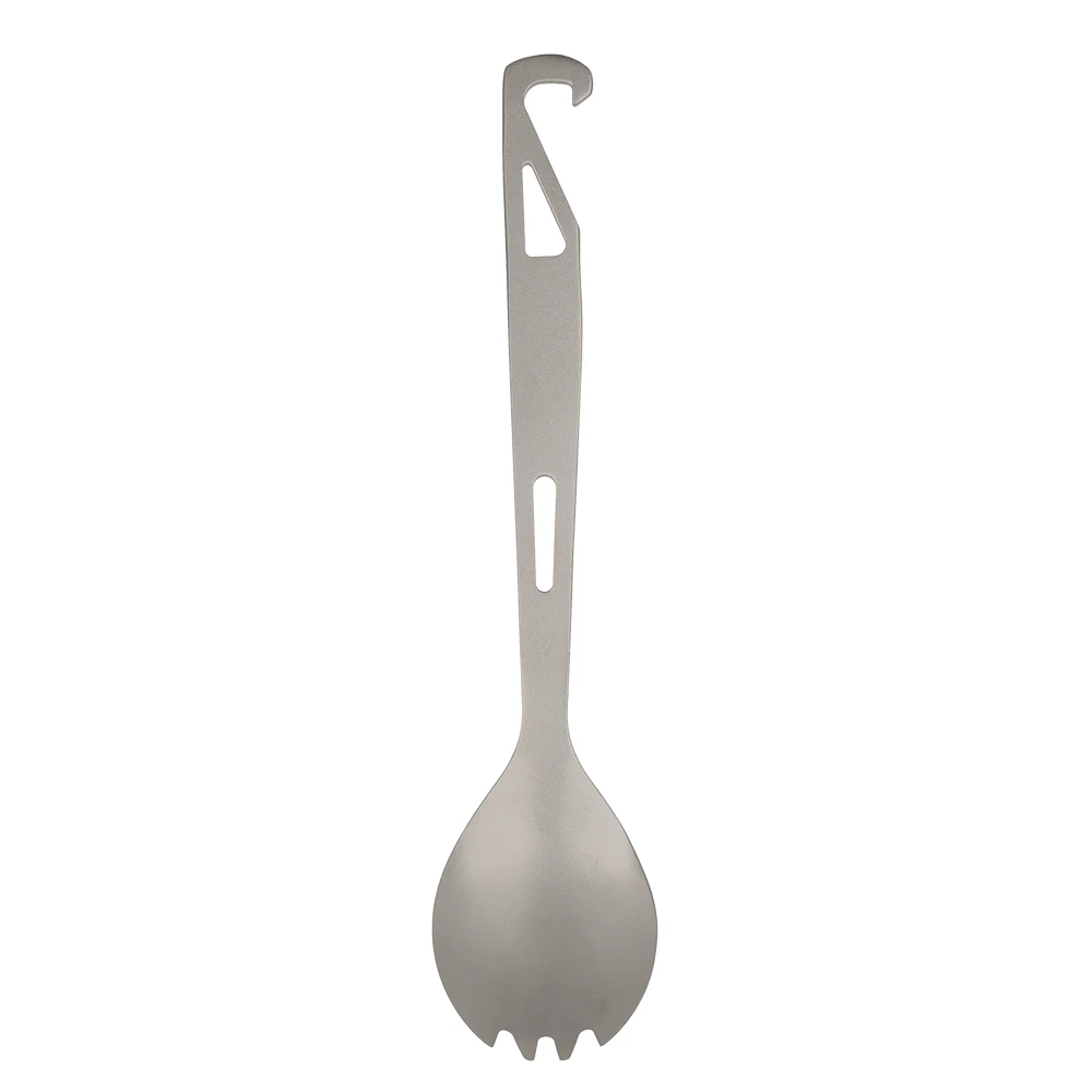 This spork integrates the functions of fork, spoon and bottle opener. It is made of titanium, lightweight and durable, great for outdoor camping, hiking, backpacking.