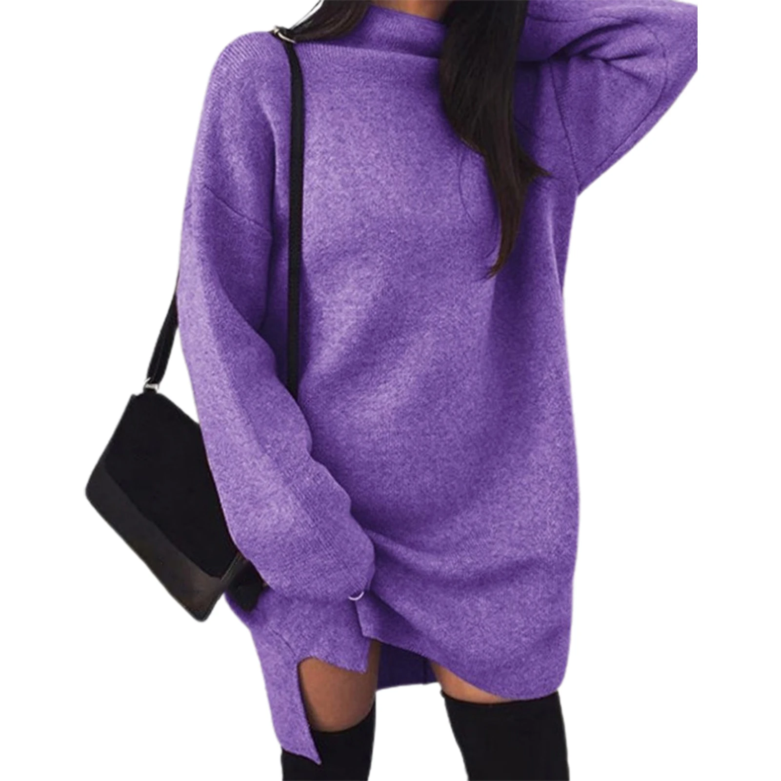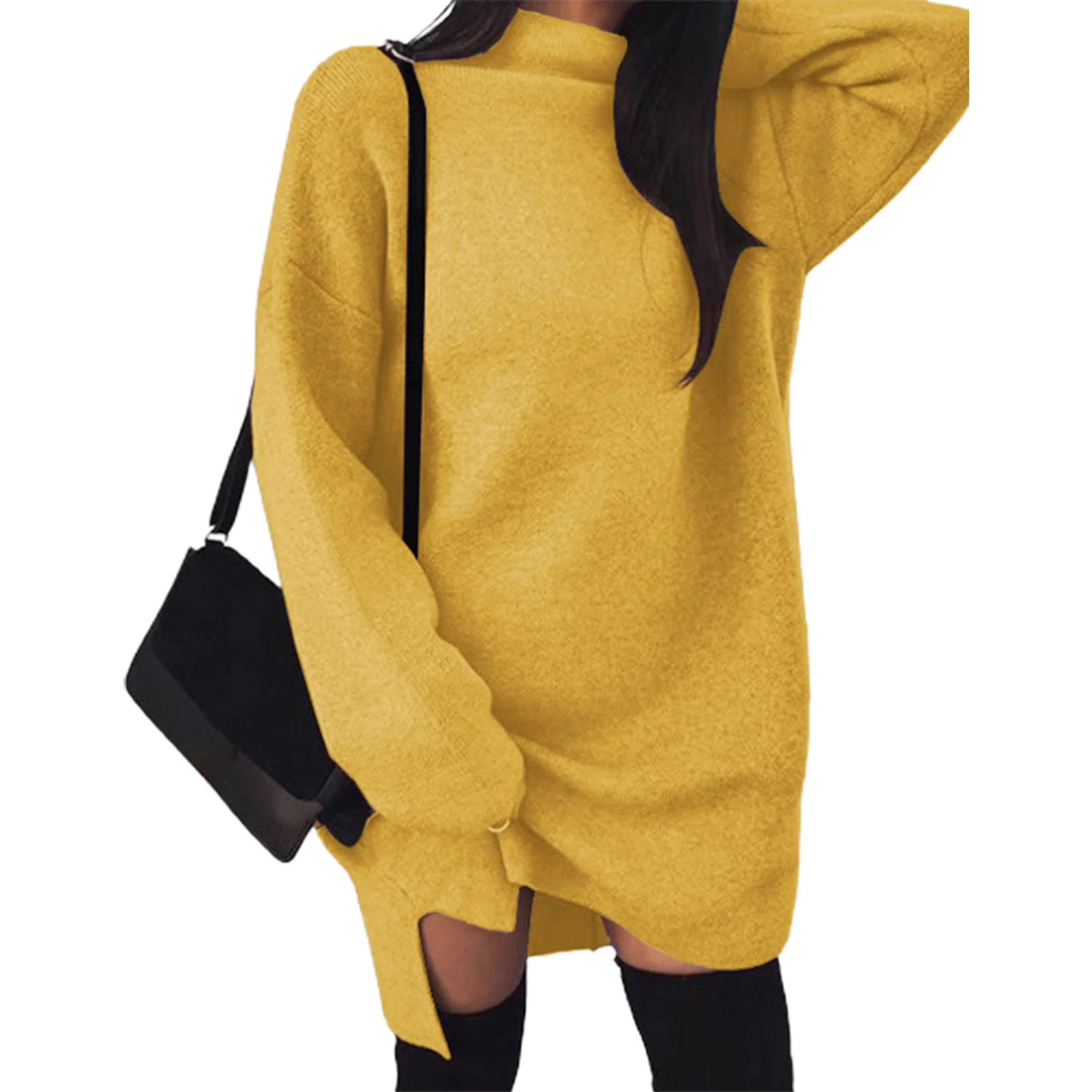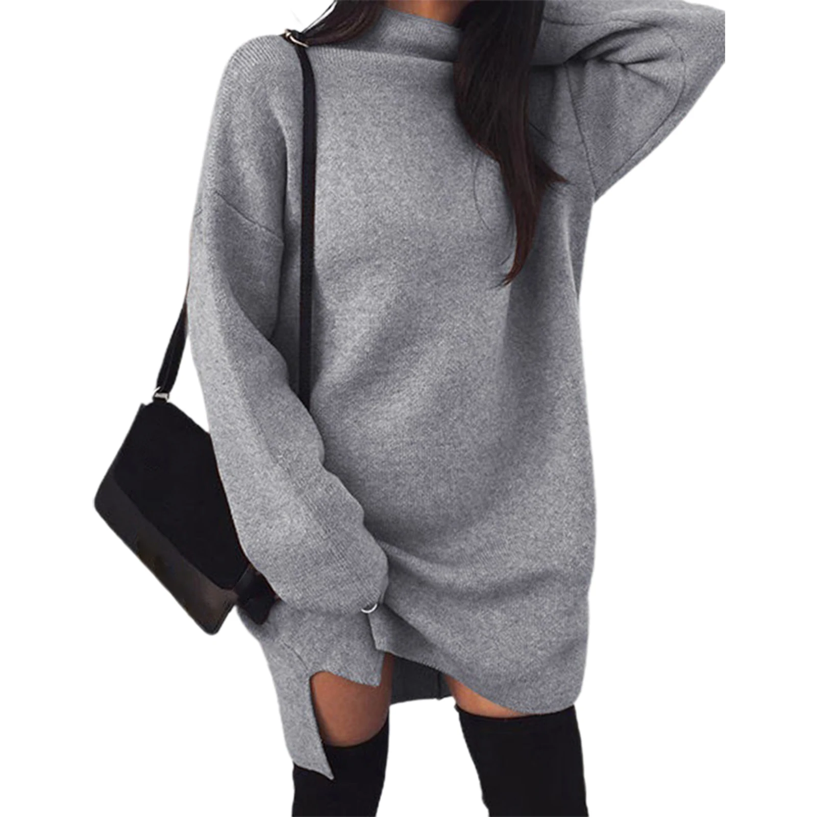Women Autumn Turtleneck Long Sleeve Warm Loose Knitted Sweater Knee-length Dress