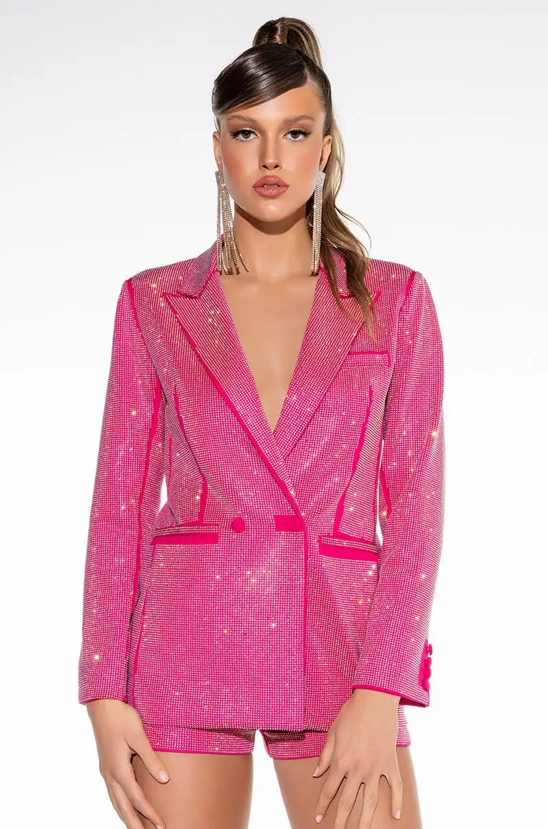Luxury glitter rhinestone embellish bling crystal sparkly diamond pantsuit reflective pink blazer birthday party club stage top