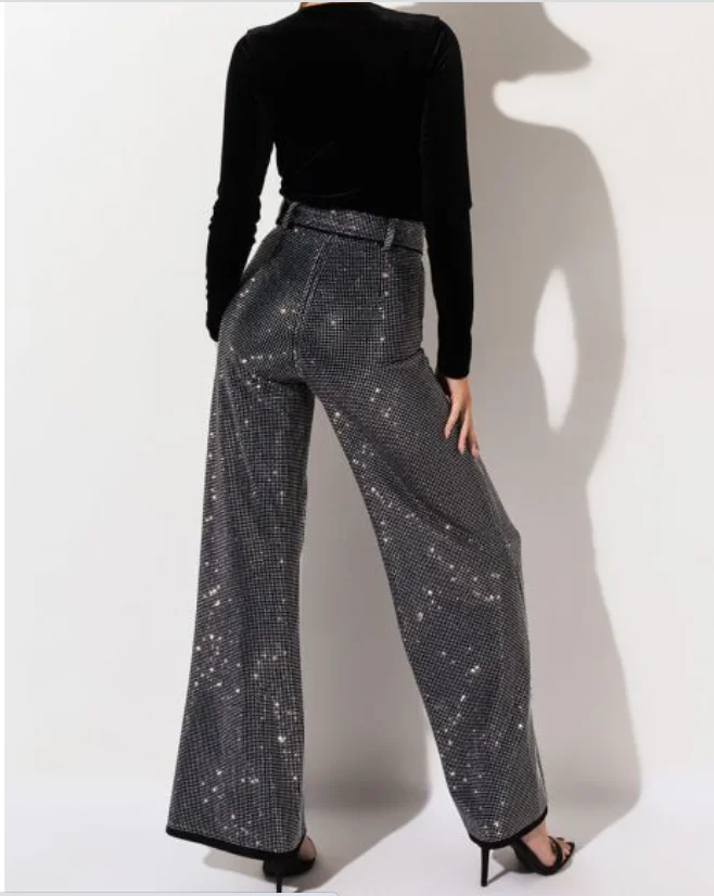 Luxury vintage high waist stretch plus size wide leg pant glitter rhinestone bling crystal diamond party birthday Trousers