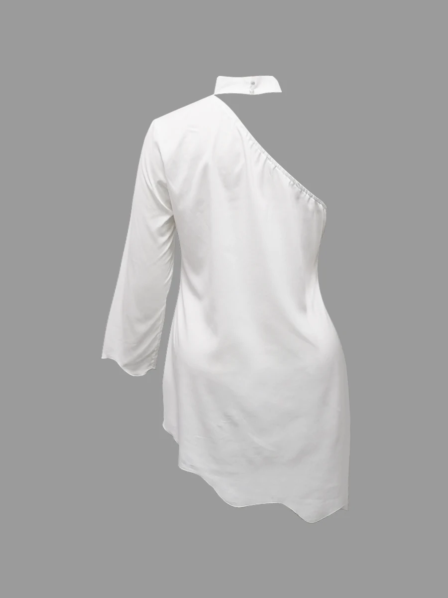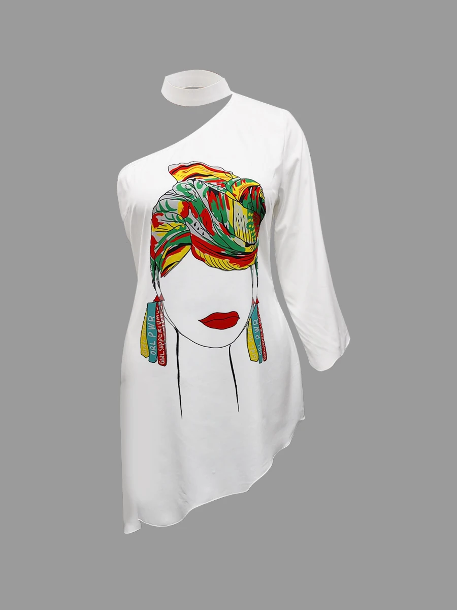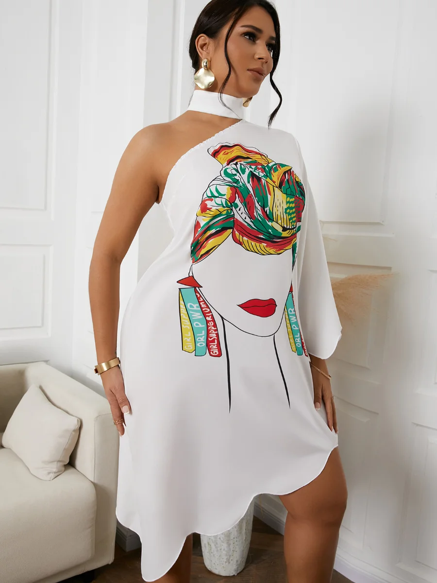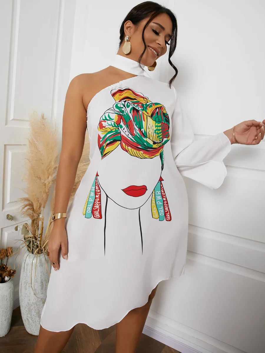 LW Dress Women 2022 Asymmetrical Ruffle Print One Shoulder Hollowed-out Sexy One-Sleeve Vestidos White Outfits