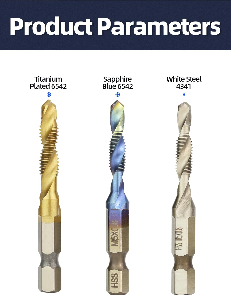 Tap Diameter: M3x0.5mm, M4x0.7mm, M5x0.8mm, M6x1.0mm, M8x1.25mm, M10x1.5mm