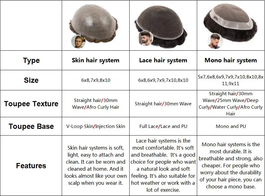 Skin hair systems has the most natural hairline. The hair on the base is v-looped, so it is knot free, keeps the most authentic appearance, and is easy to clean and attach. It can be worn and cleaned at home. Because it is very thin, it has low density of bearing hair, so it is very light. Lace hair systems is the most comfortable. It’s soft and breathable. It’s suitable for hot weather or work with a lot of exercise. It won’t hurt your skin on the top of your head. The bleached knot is used at the front of the base to keep your real hairline. Mono hair systems is the most durable. It is breathable and strong. It can carry a large density of hair, so it is relatively heavy. It is usually combined with a large area of NPU to ensure that it adheres firmly and has a front hairline that cannot be explored.