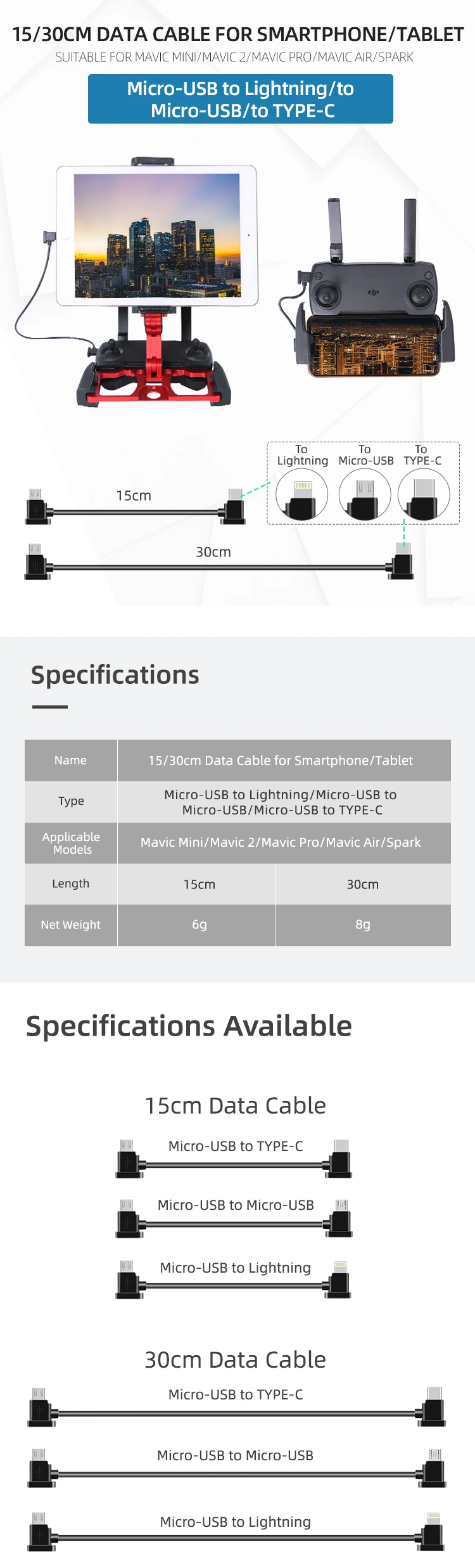 Micro-USB to Lightning/TYPE-C/Micro-USB Data Cable Smartphone Tablet 15/30cm Line For DJI MAVIC MINI/ SE/MAVIC 2/MAVIC AIR/Spark