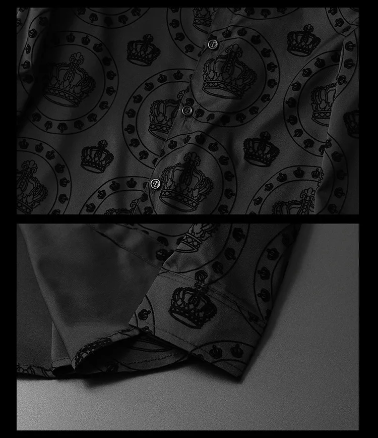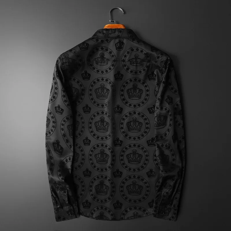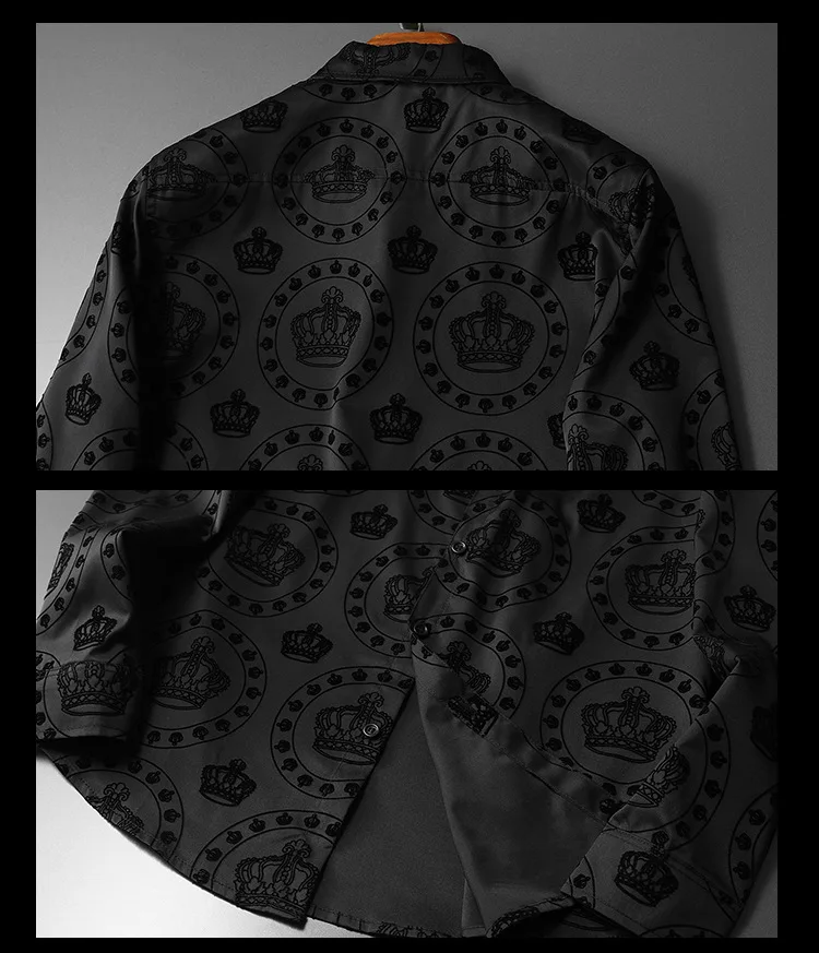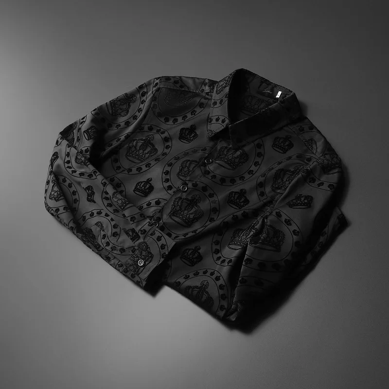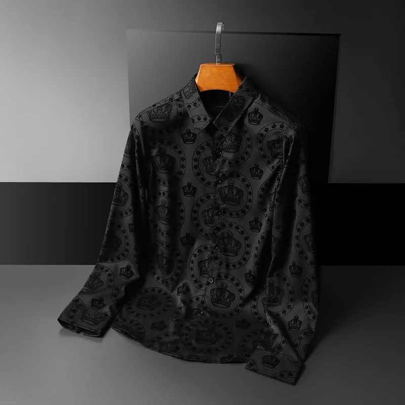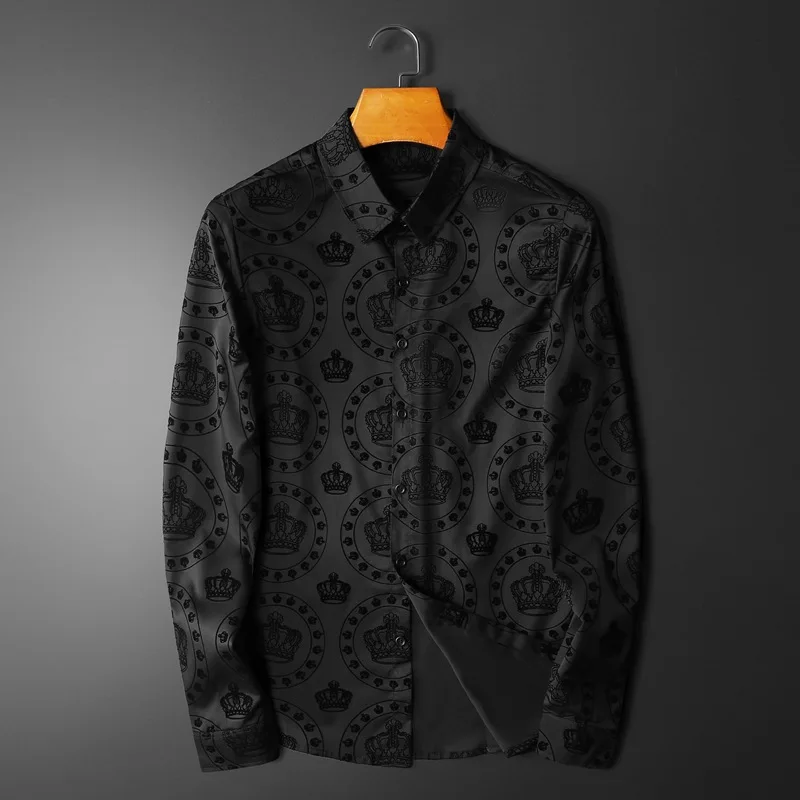 New 2022 Men 3D luxurious Classic Black Crown Flocking Fashion Cotton Casual Shirts Shirt high Pocket Long-sleeves S 5XL #A648