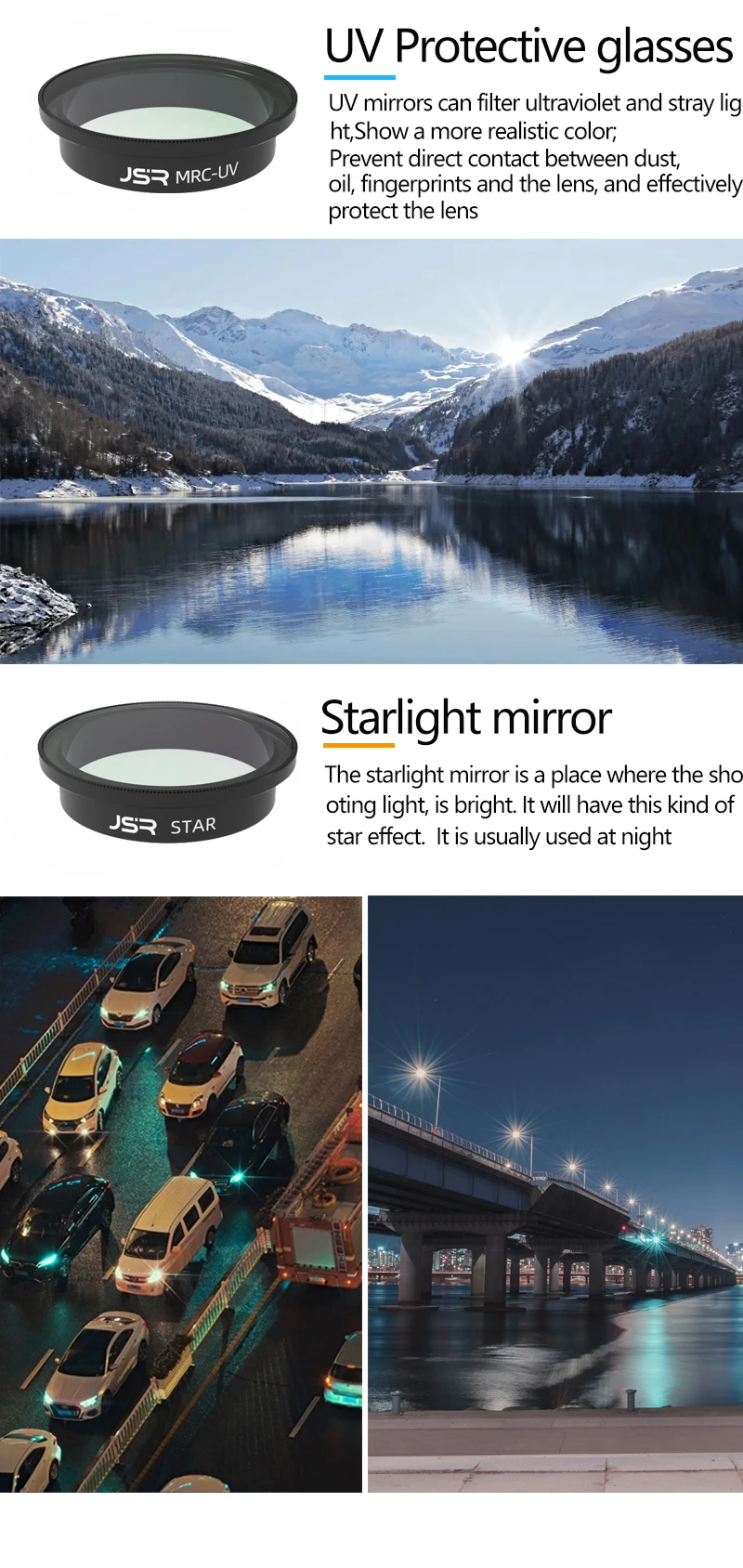 3. ND Filter: Picture: Strong light environment, prevent overexposure, resist scattered light, increase color saturation, and make the picture more transparent and bright. Realize large-scale effects such as fog-like flowing water and night light track. Video: Decrease the shutter speed so that the video picture has proper motion blur and looks more comfortable.