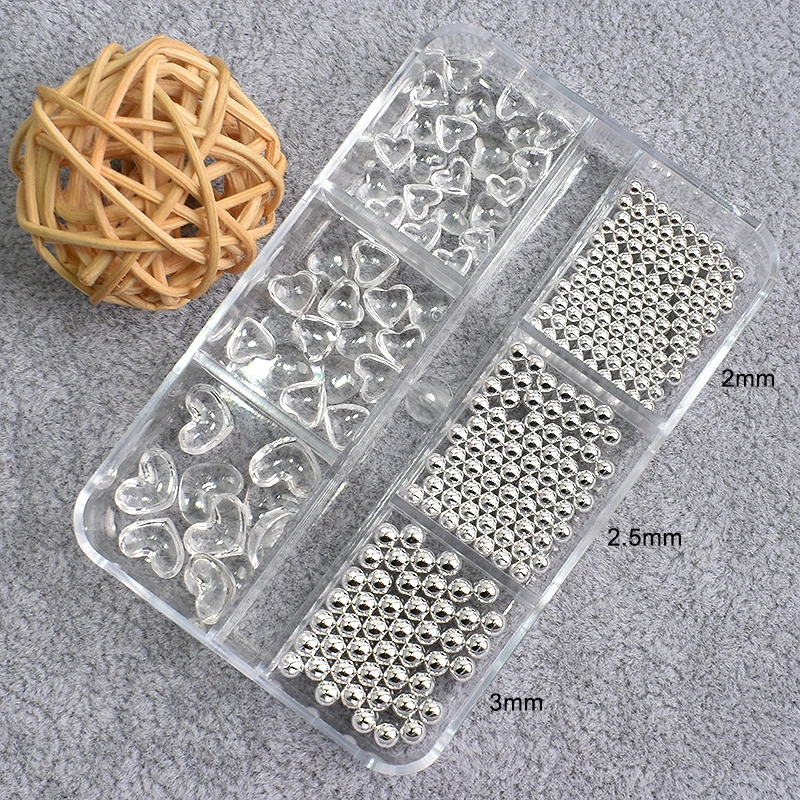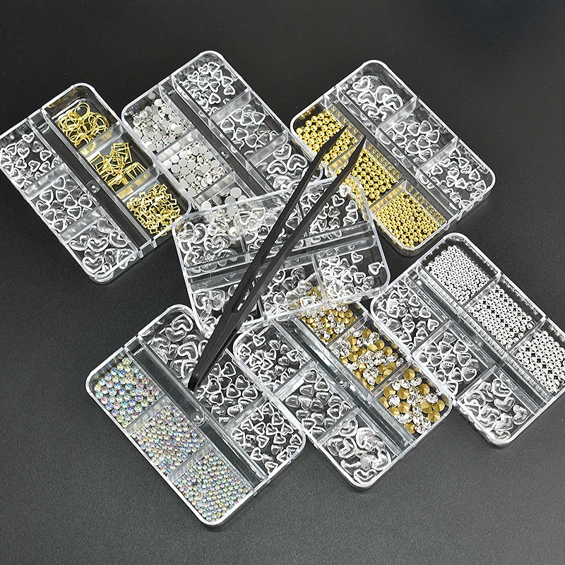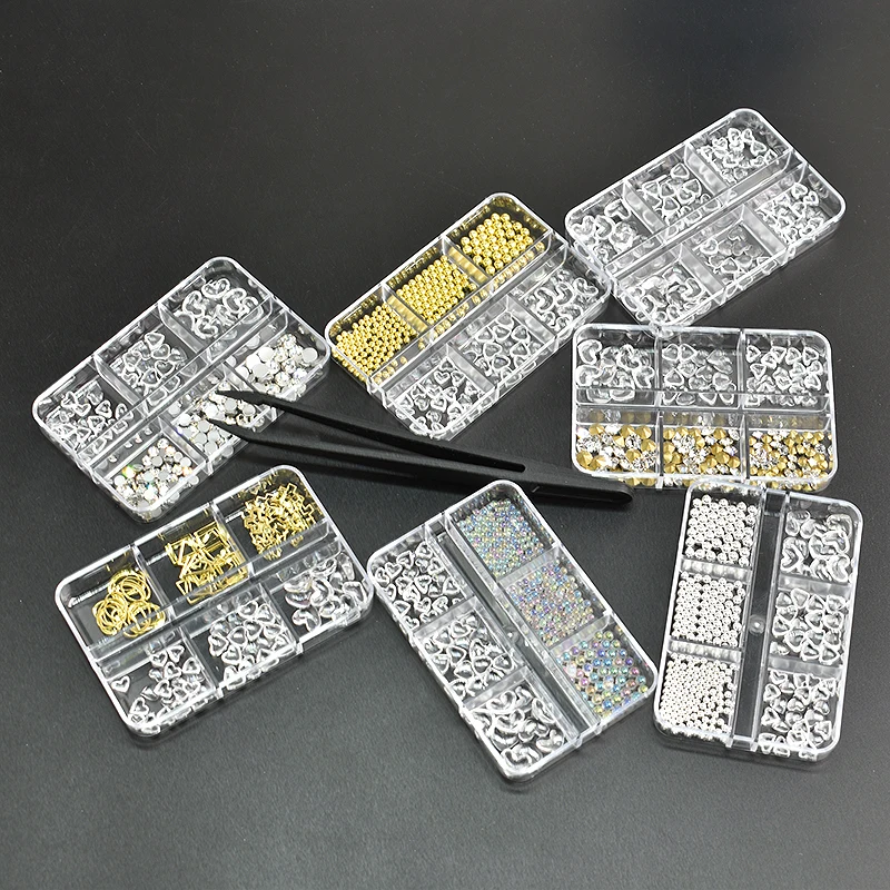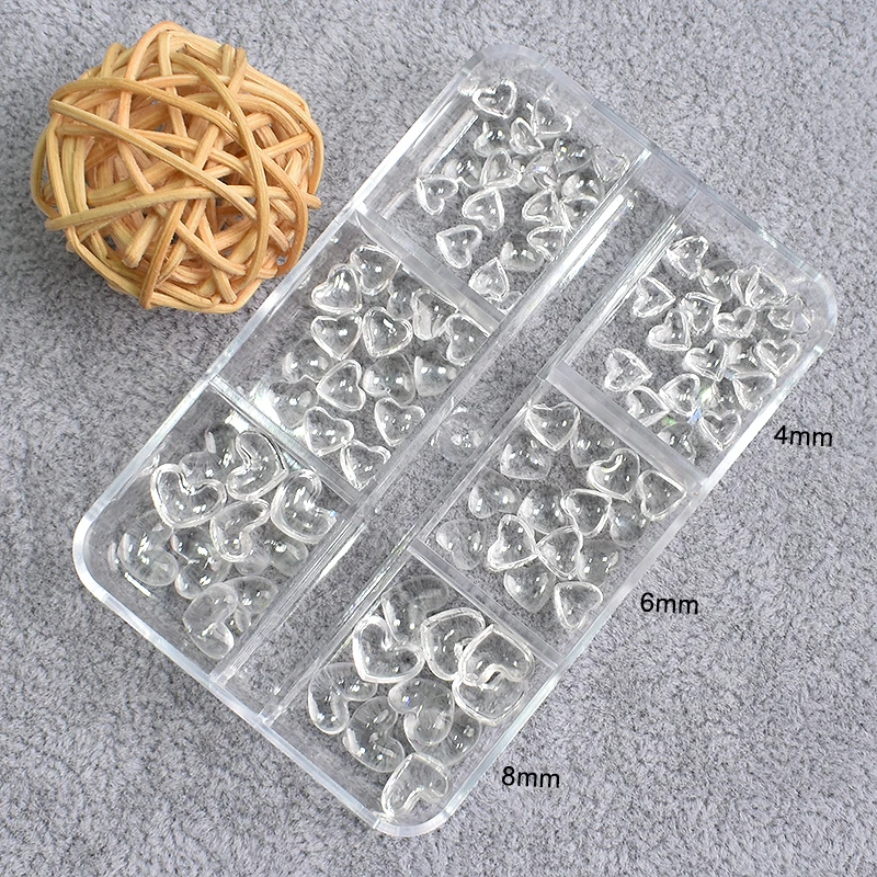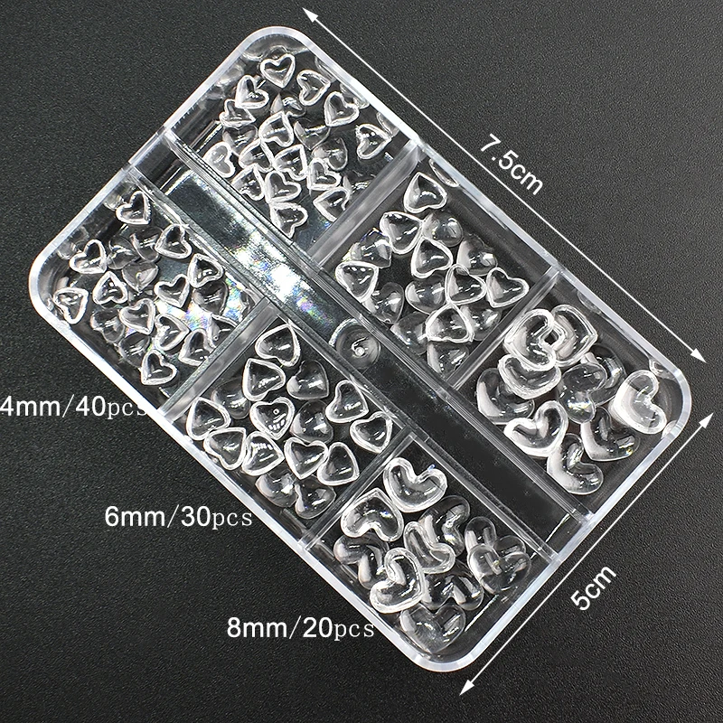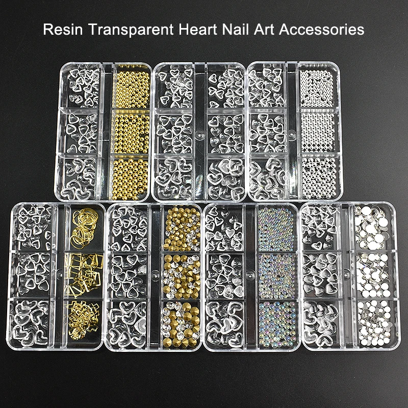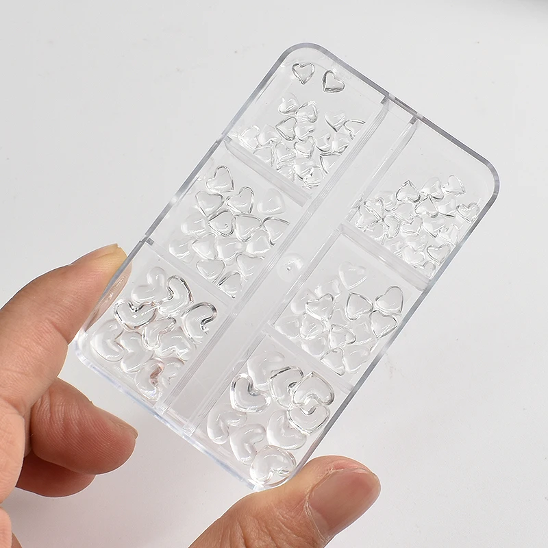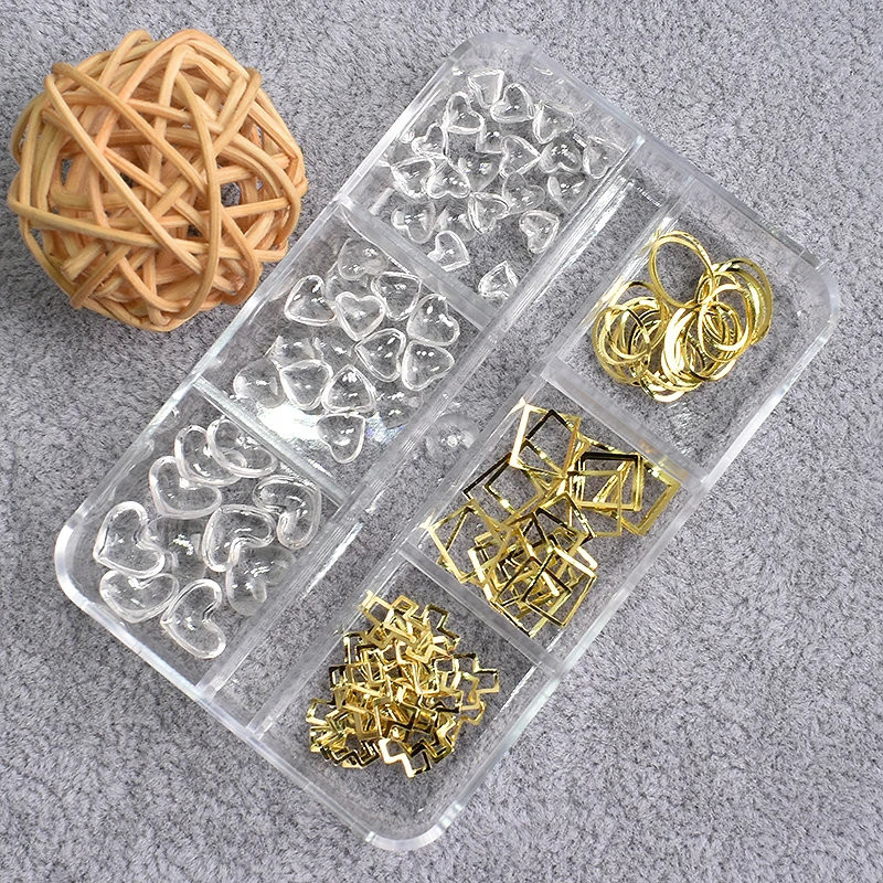 Packing: 6-compartment box: transparent heart-shaped mix and match various nail accessories