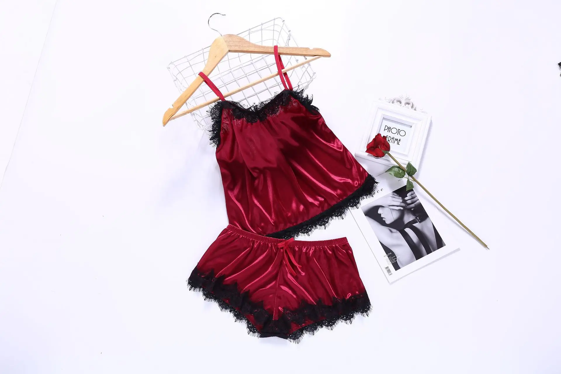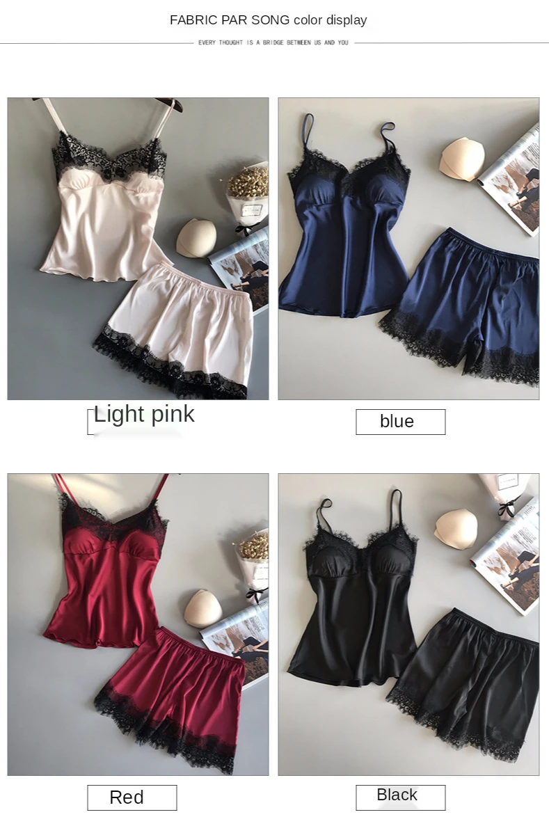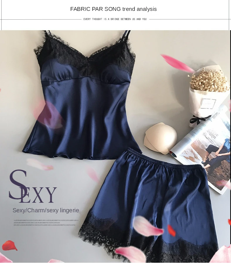 New Women Pajama Sexy Lace Silk Pyjama Set Lingerie Home Clothes For Female Solid Pijama Ladie 2PCS Shorts Sleepwear Pajama Suit