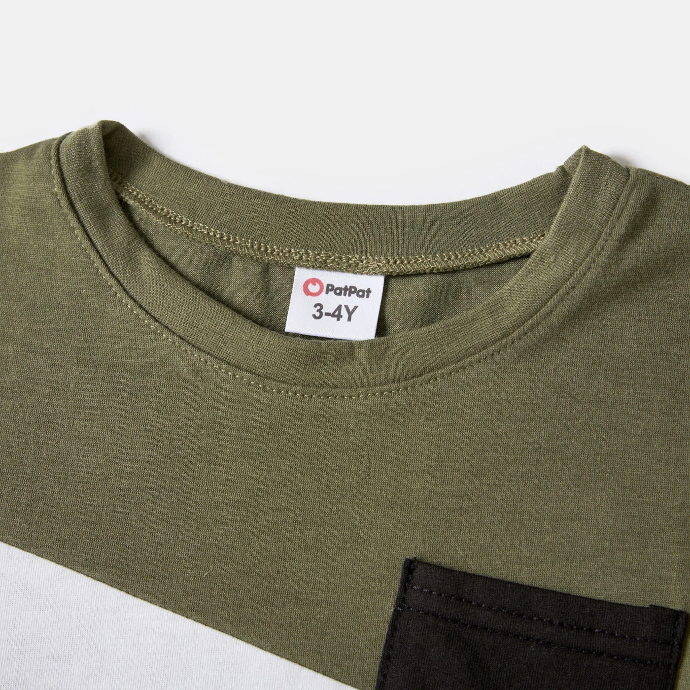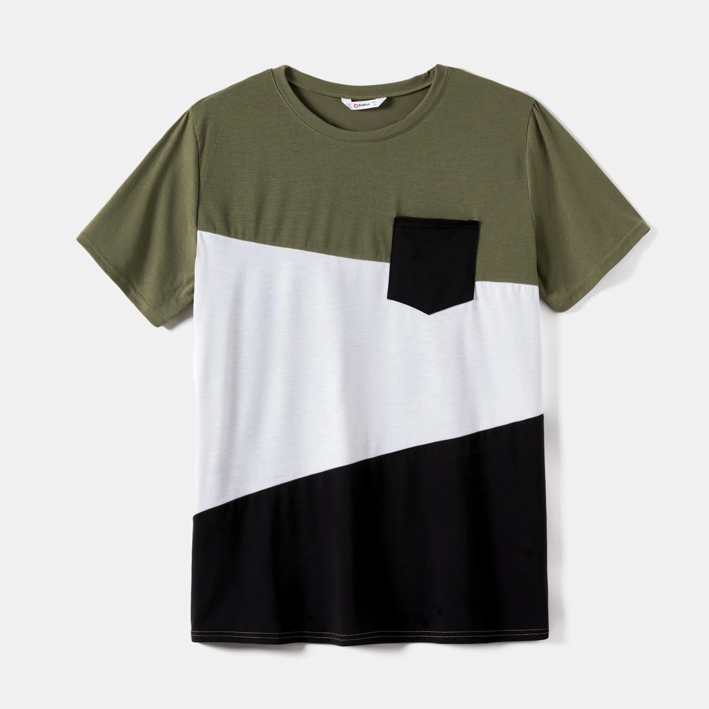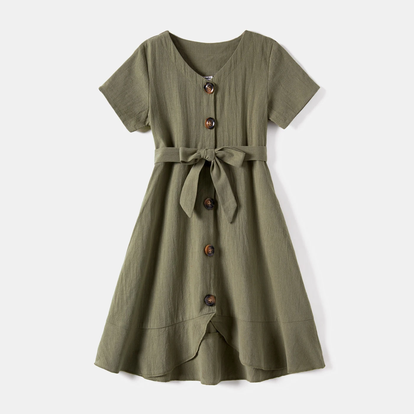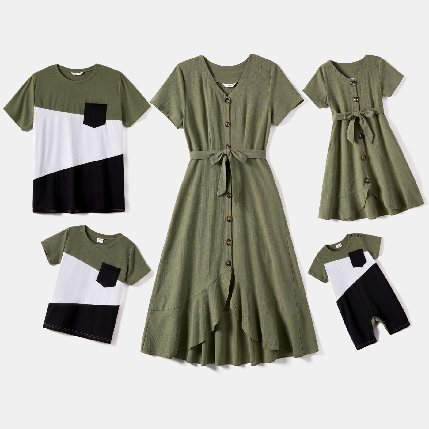 PatPat Family Matching Outfits 100% Cotton Short-sleeve Button Front Belted High Low Hem Dresses and Colorblock T-shirts Sets