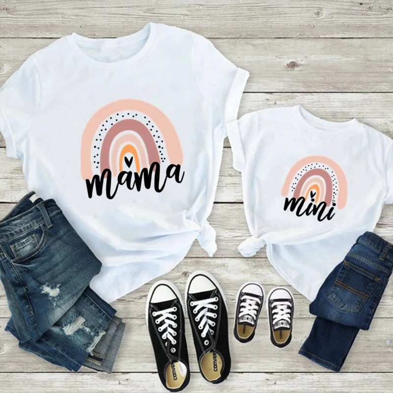 Pink Rainbow Mama and Mini Family Matching Tshirts Summer Short Sleeve Family Look T-shirts Mother and Daughter Fashion Clothes