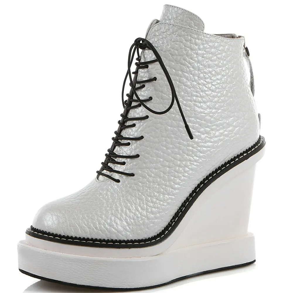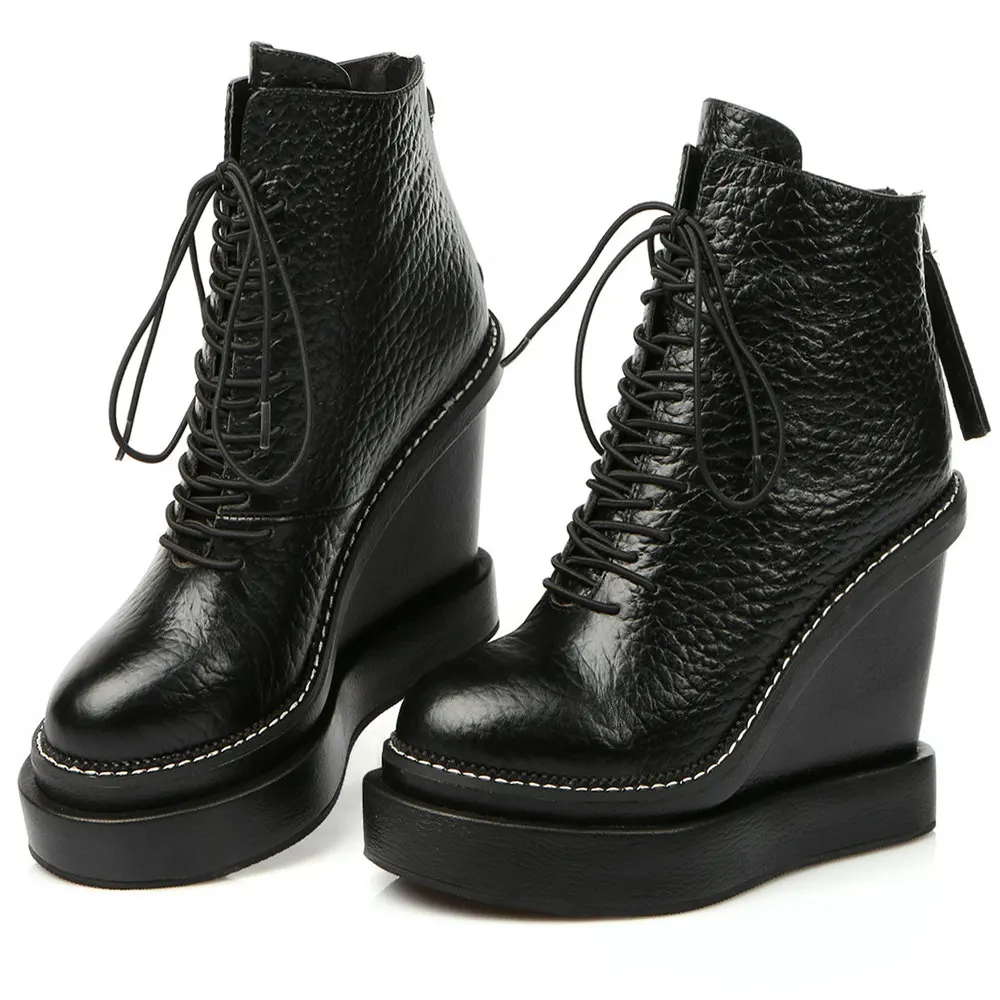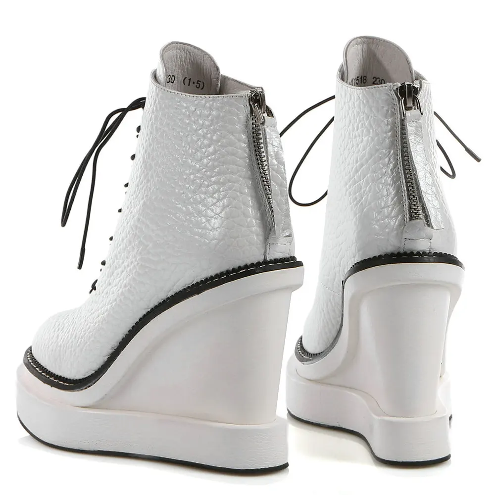 Platform Pumps Shoes Women Lace Up Genuine Leather Wedges High Heel Motorcycle Boots Female High Top Round Toe Fashion Sneakers