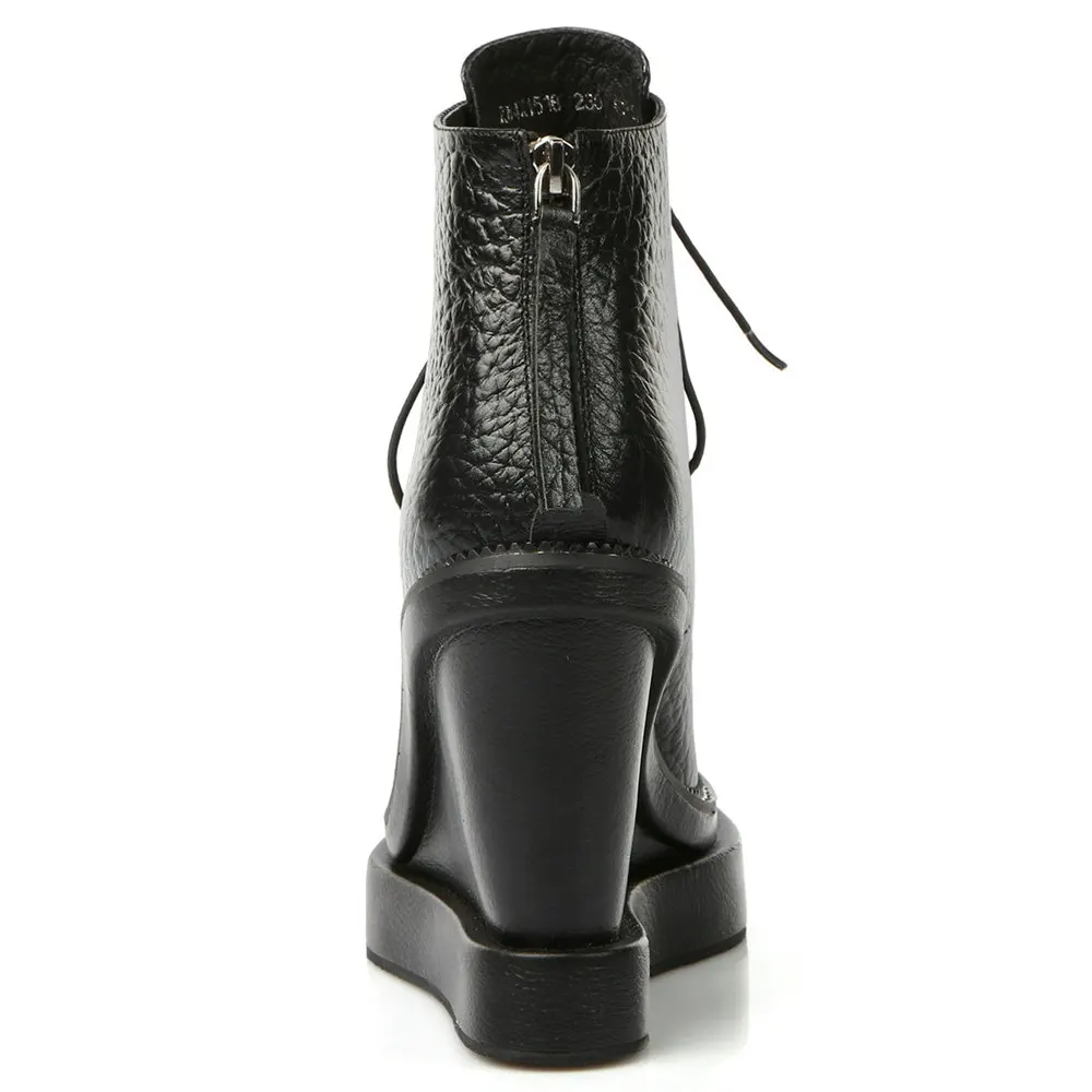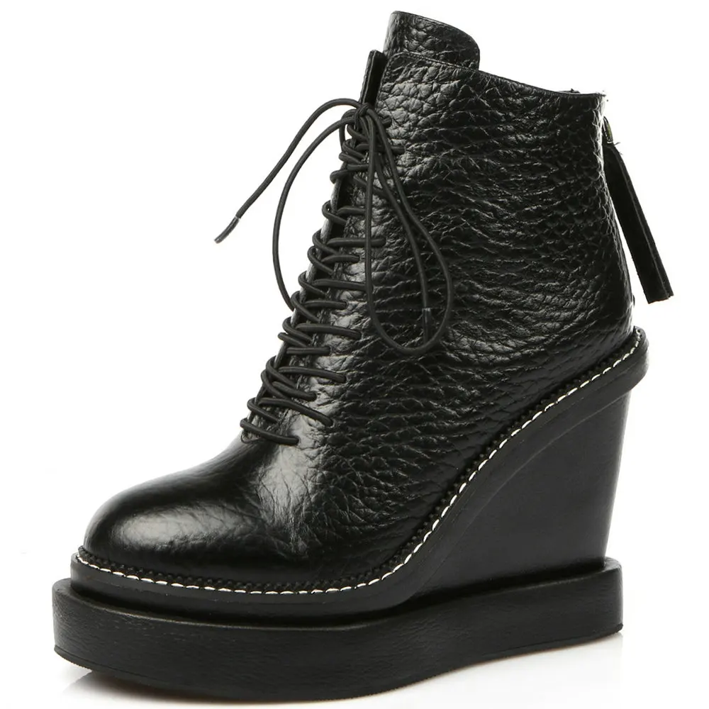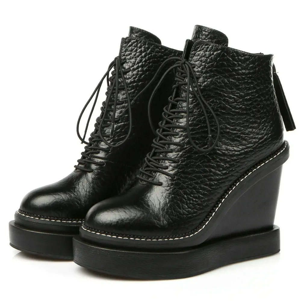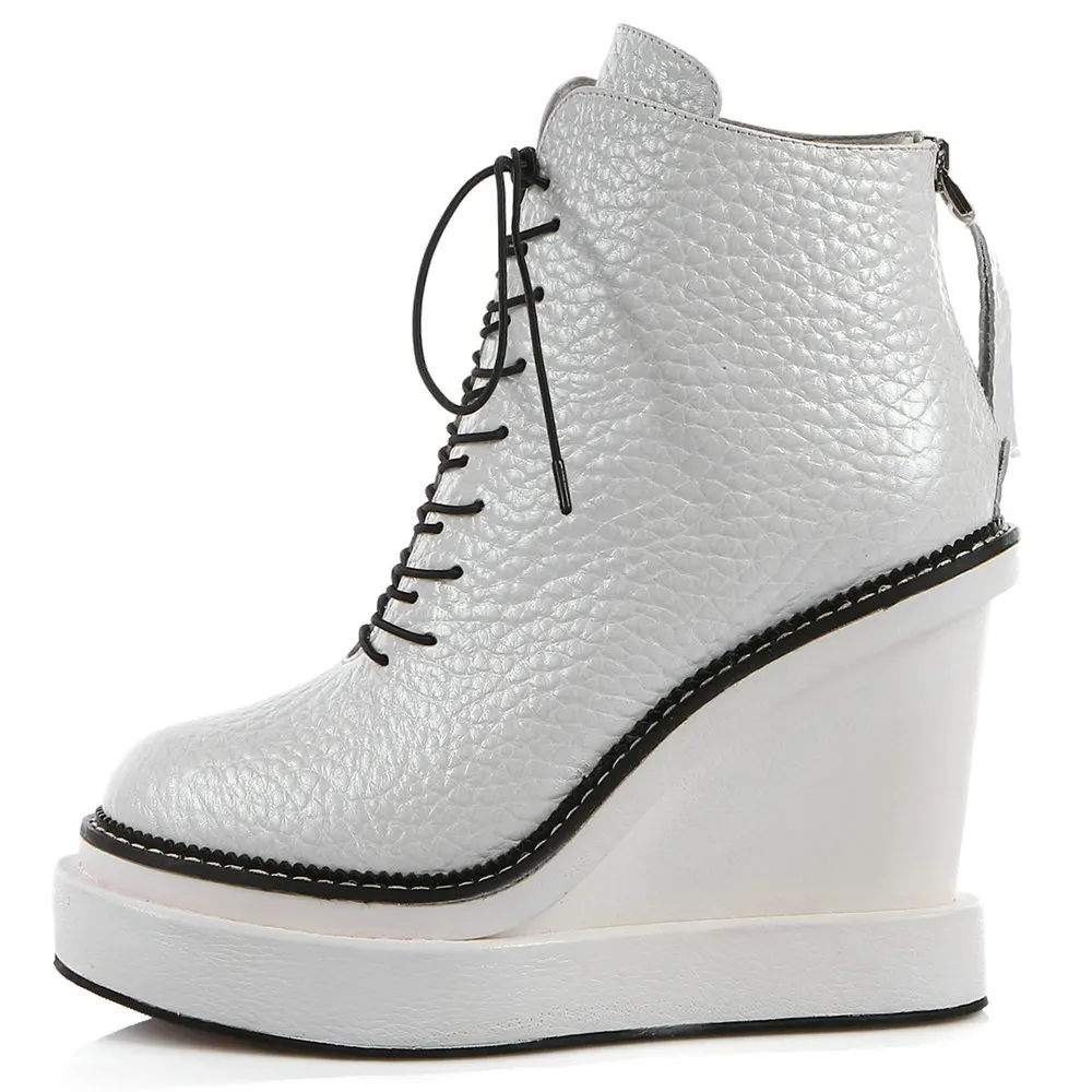 Platform Pumps Shoes Women Lace Up Genuine Leather Wedges High Heel Motorcycle Boots Female High Top Round Toe Fashion Sneakers